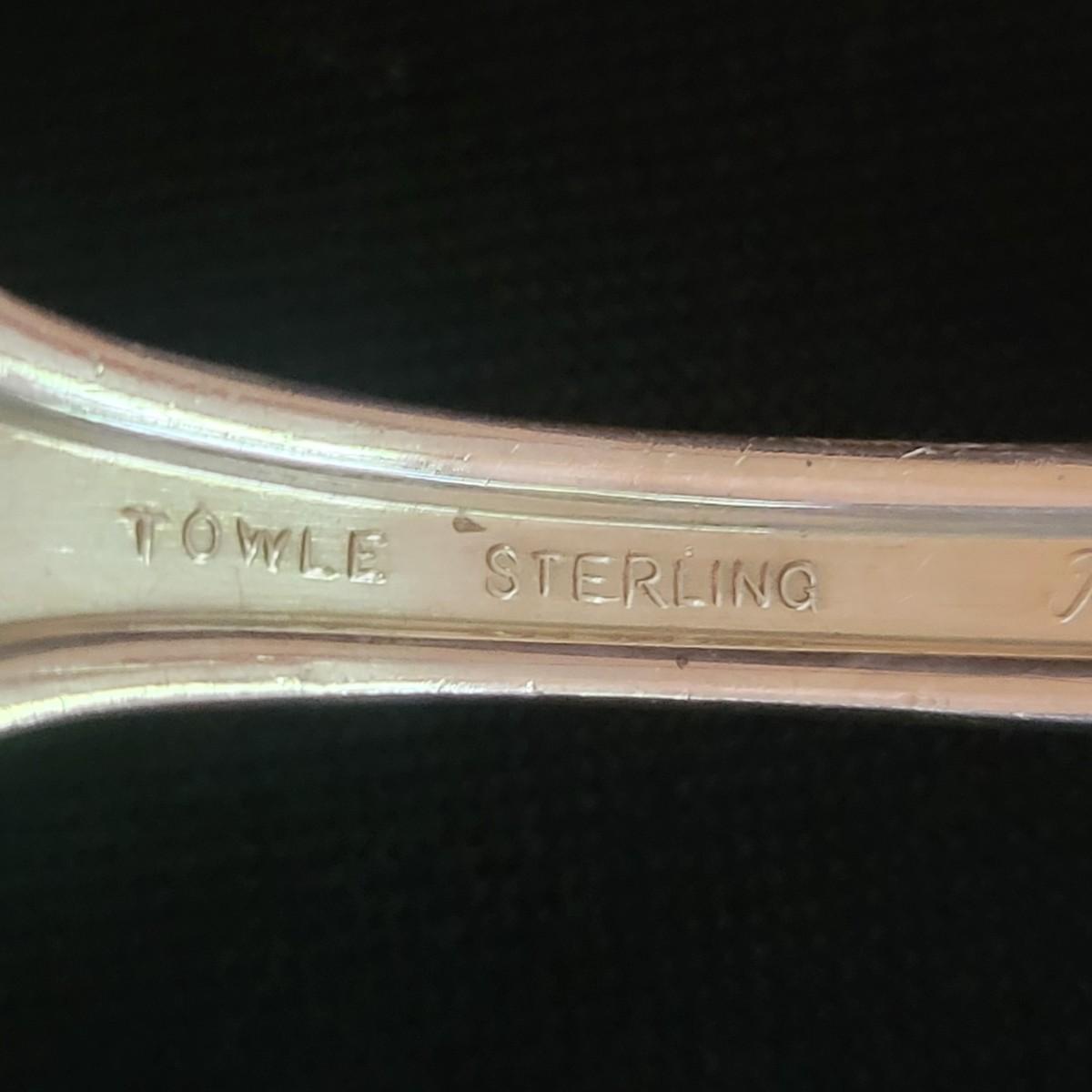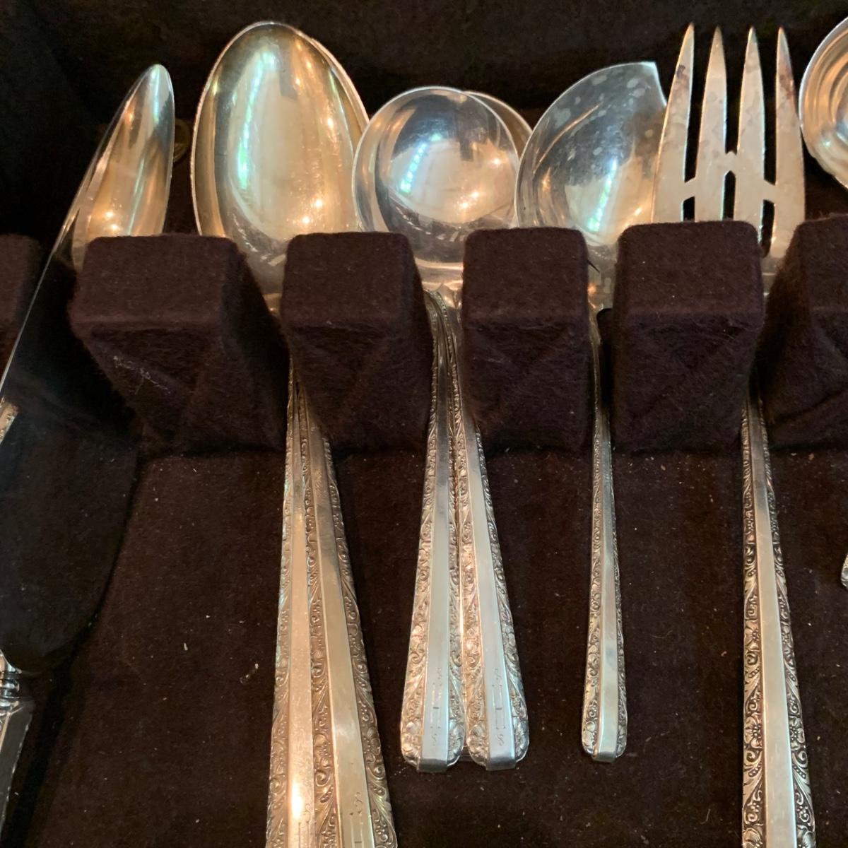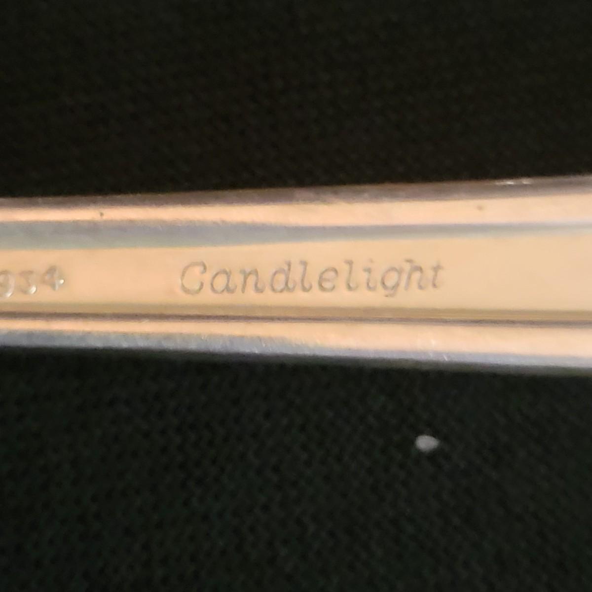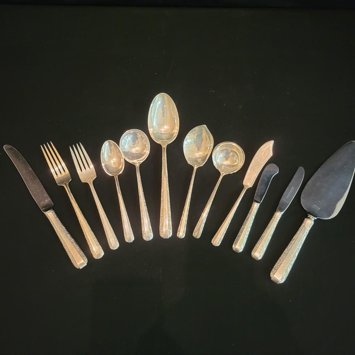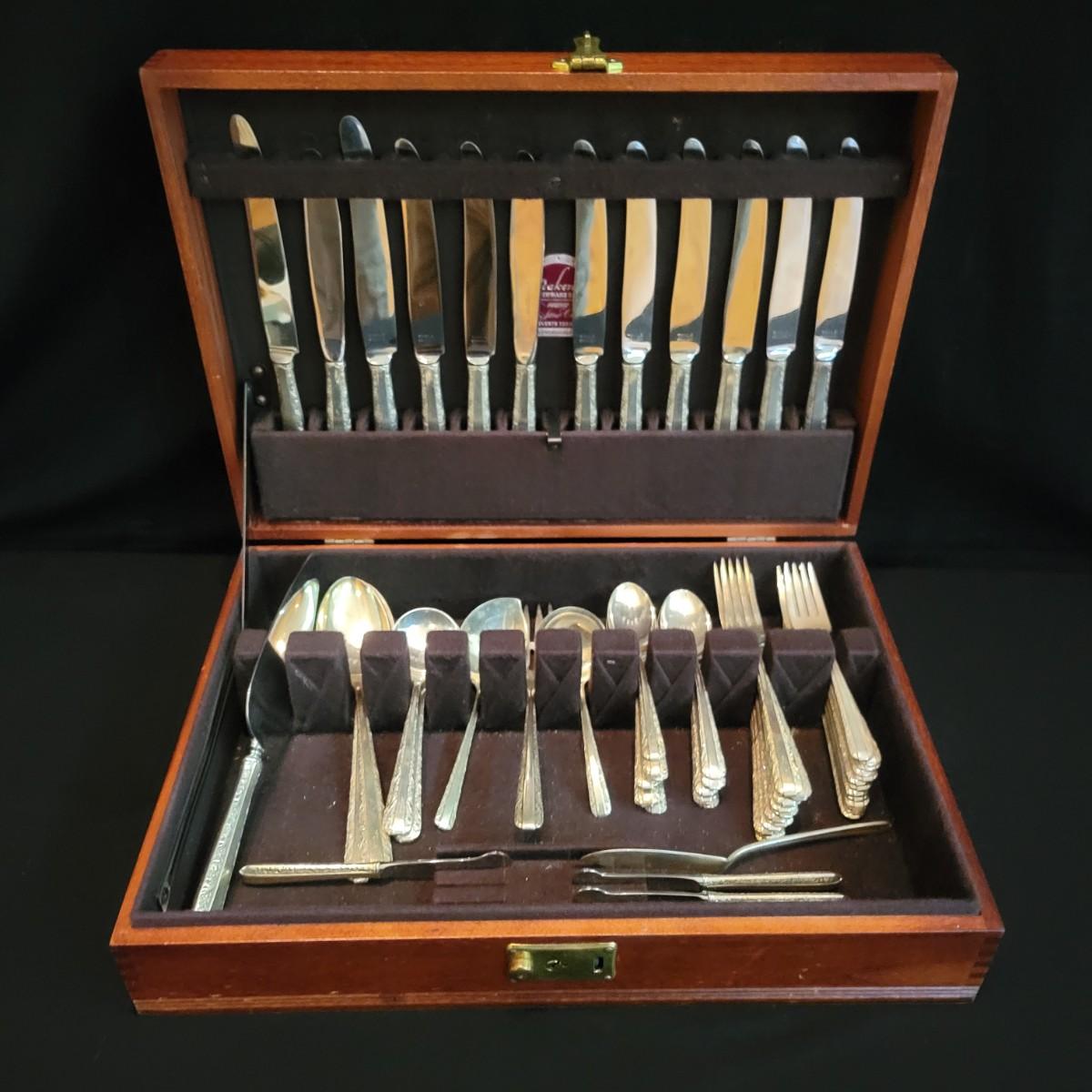 A Towle sterling silverware set that can seat up to eight place settings with many additional pieces. The pattern is "Candlelight". This collection contains approximately 71 pieces all together. It also includes a Naken's silverware anti tarnish chest that locks and has two keys. Chest measures approximately 16" x 11.5" x 4"H. Some pieces are engraved with the letter H. Shipping available. Shipping can be costly. We suggest contacting our preferred local shipping provider, Postage Express, with dimensions and getting an estimate before bidding: (828) 670-5501 or postageexpress@yahoo.com.