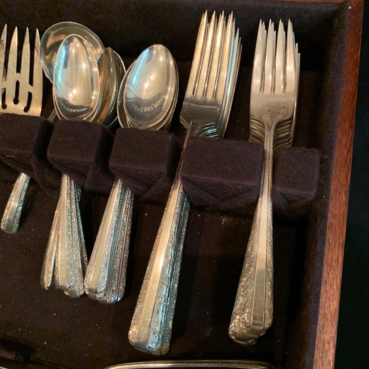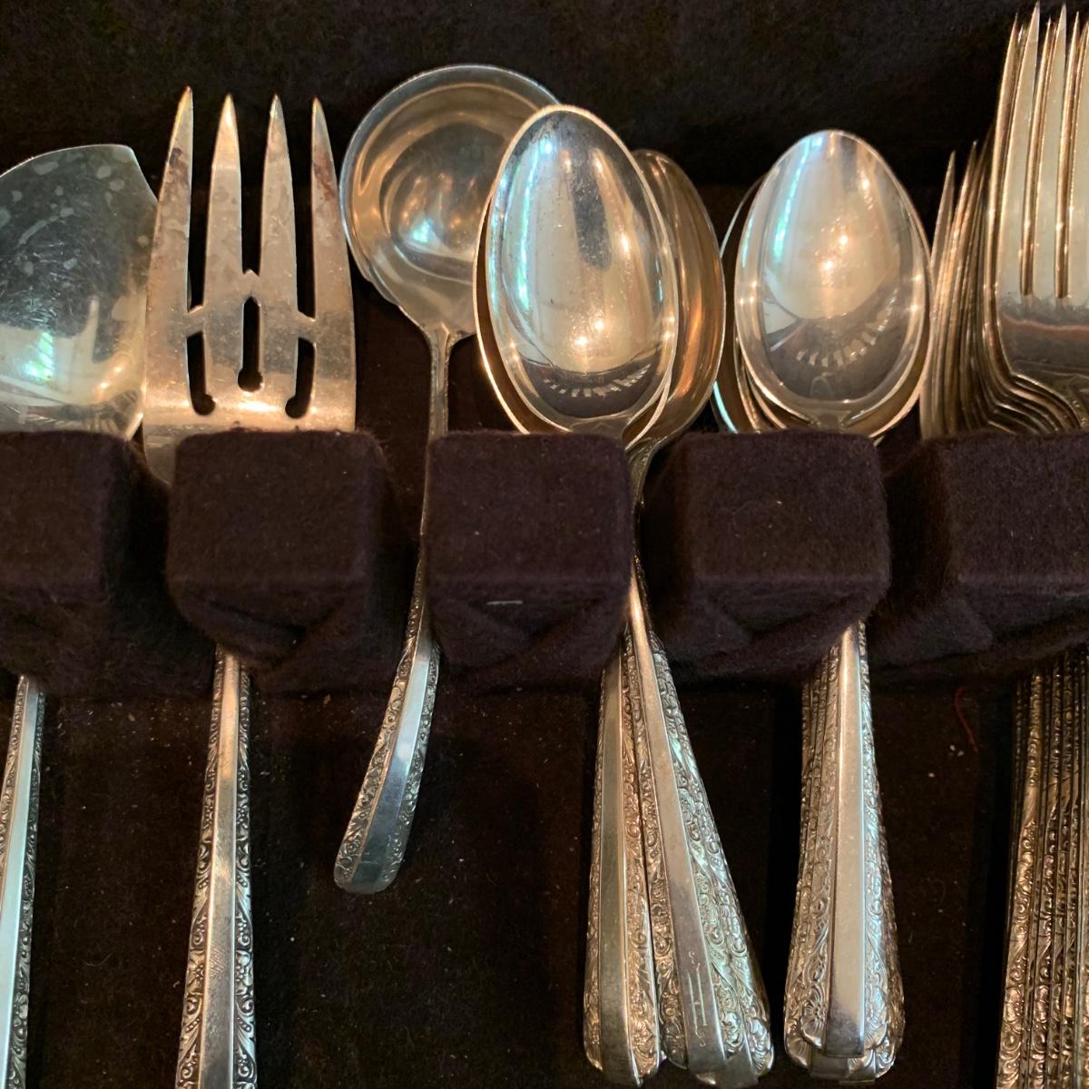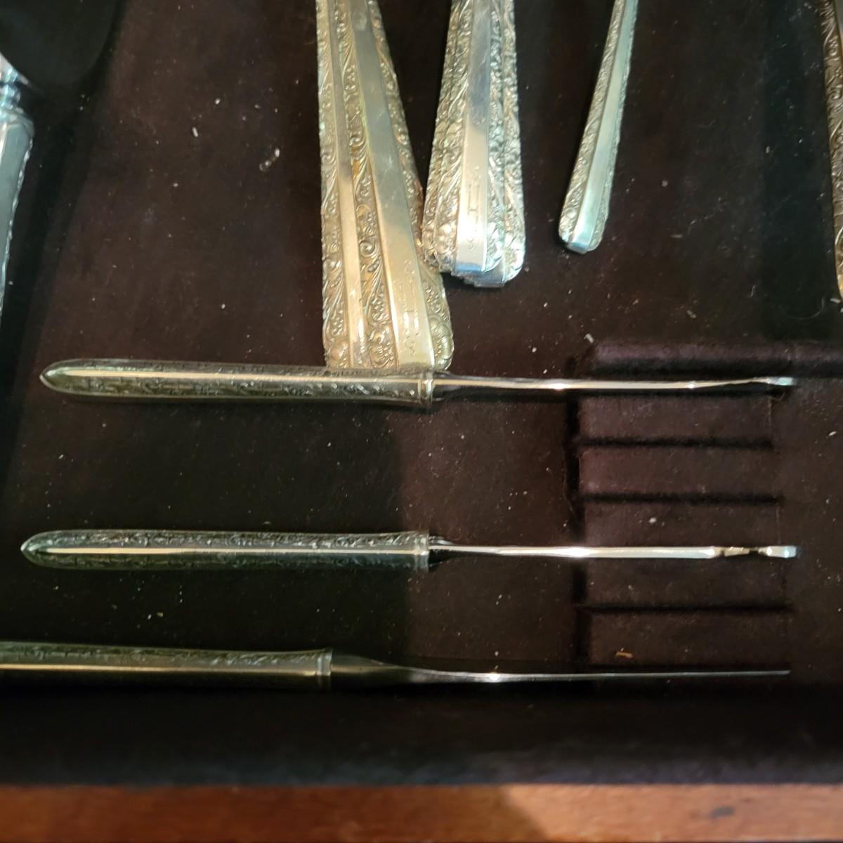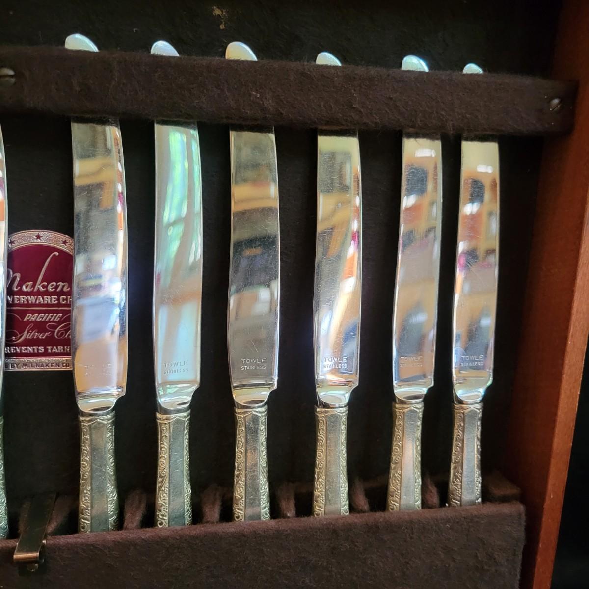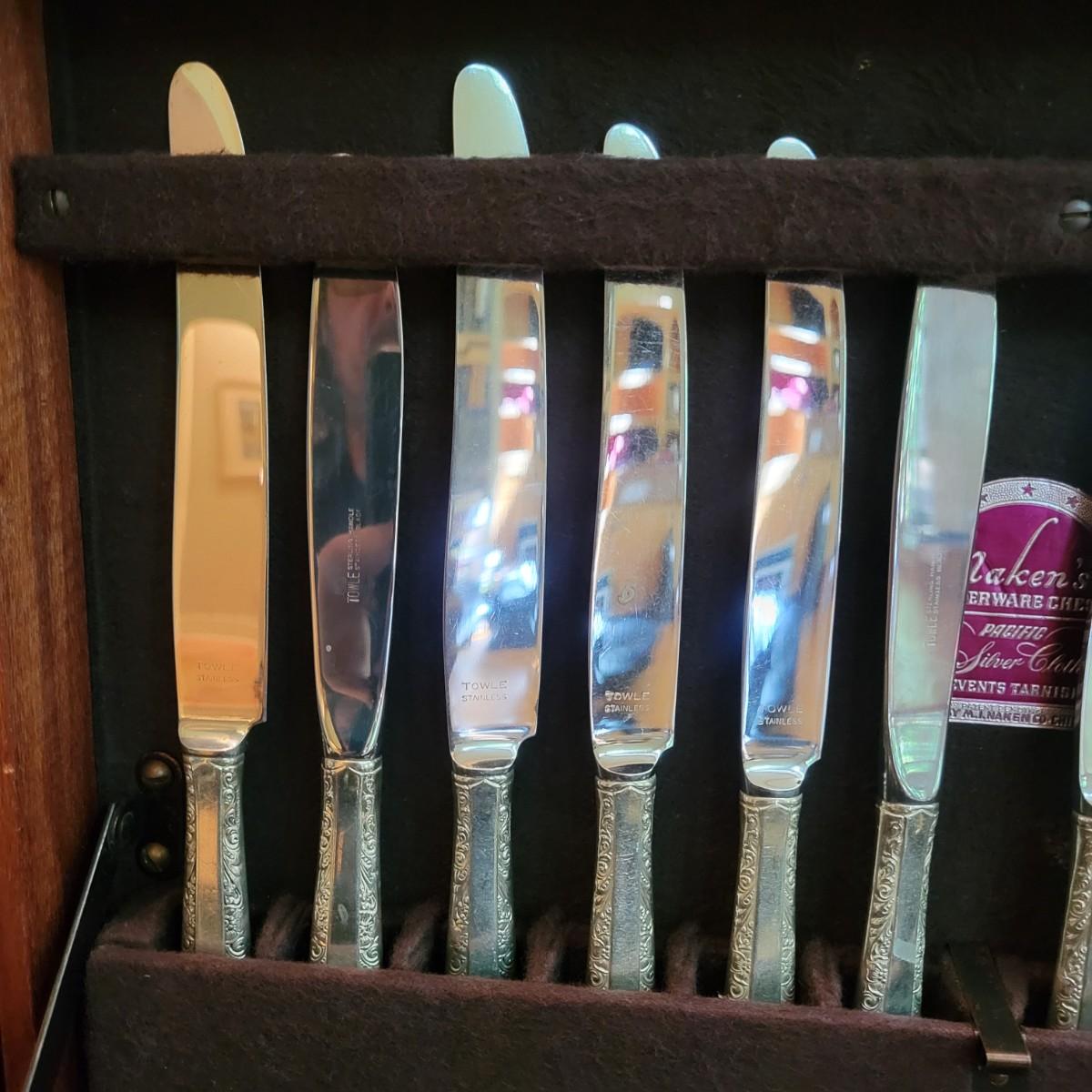 A Towle sterling silverware set that can seat up to eight place settings with many additional pieces. The pattern is "Candlelight". This collection contains approximately 71 pieces all together. It also includes a Naken's silverware anti tarnish chest that locks and has two keys. Chest measures approximately 16" x 11.5" x 4"H. Some pieces are engraved with the letter H. Shipping available. Shipping can be costly. We suggest contacting our preferred local shipping provider, Postage Express, with dimensions and getting an estimate before bidding: (828) 670-5501 or postageexpress@yahoo.com.