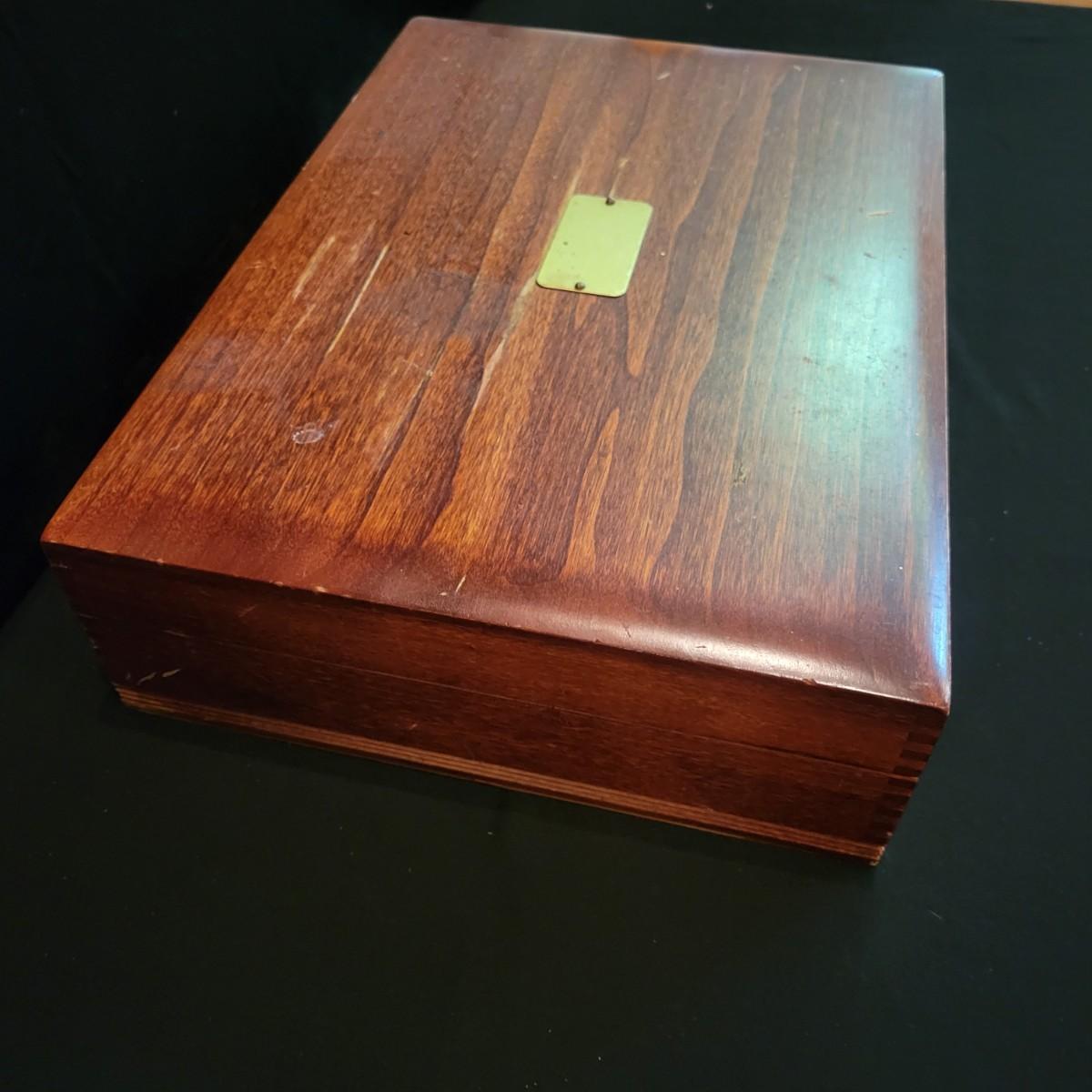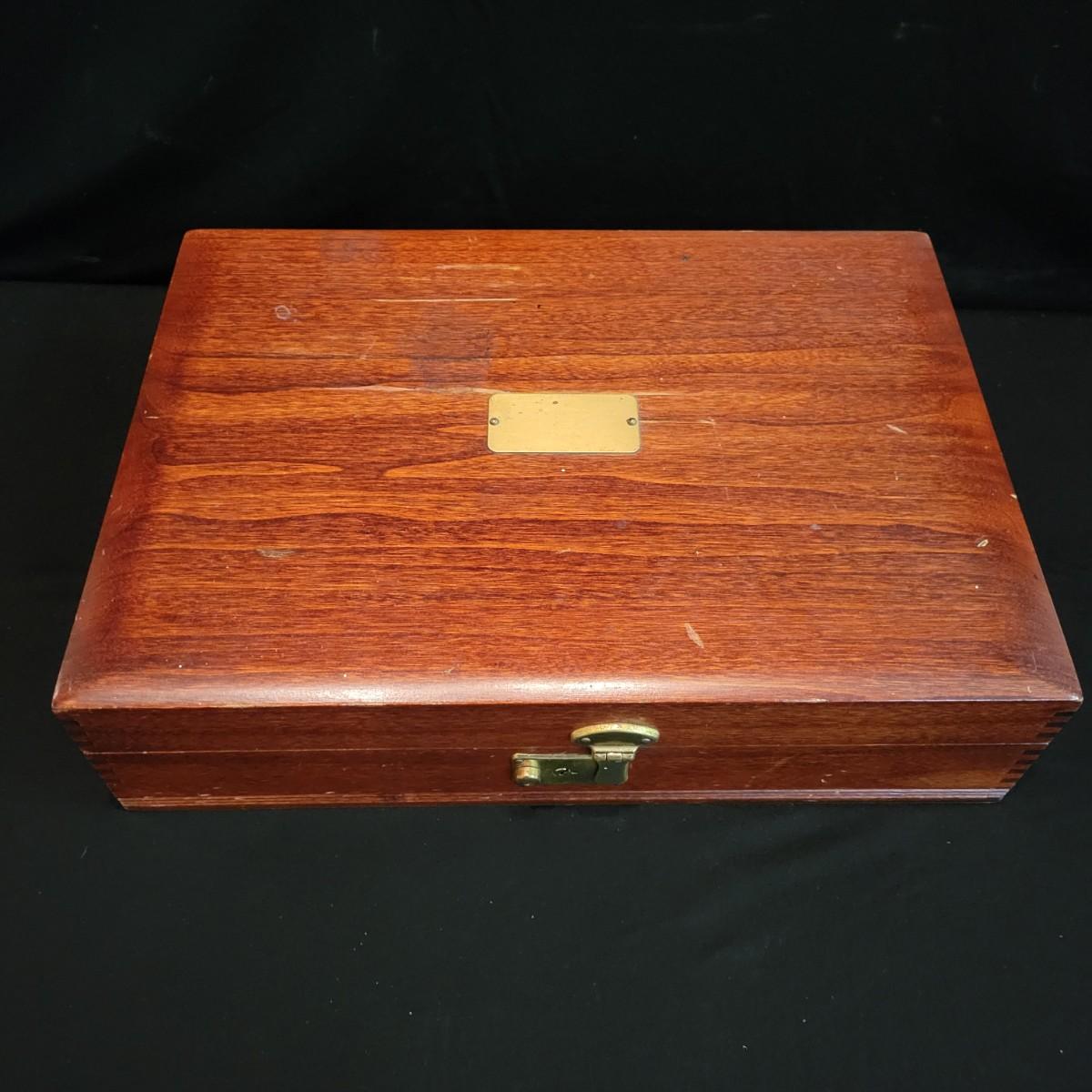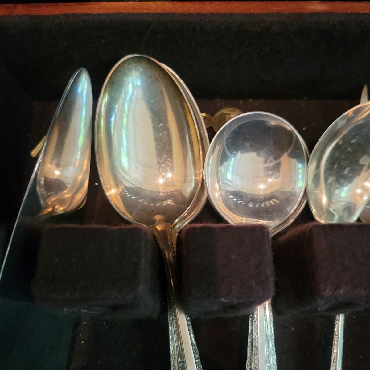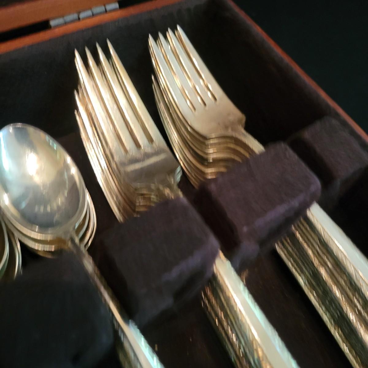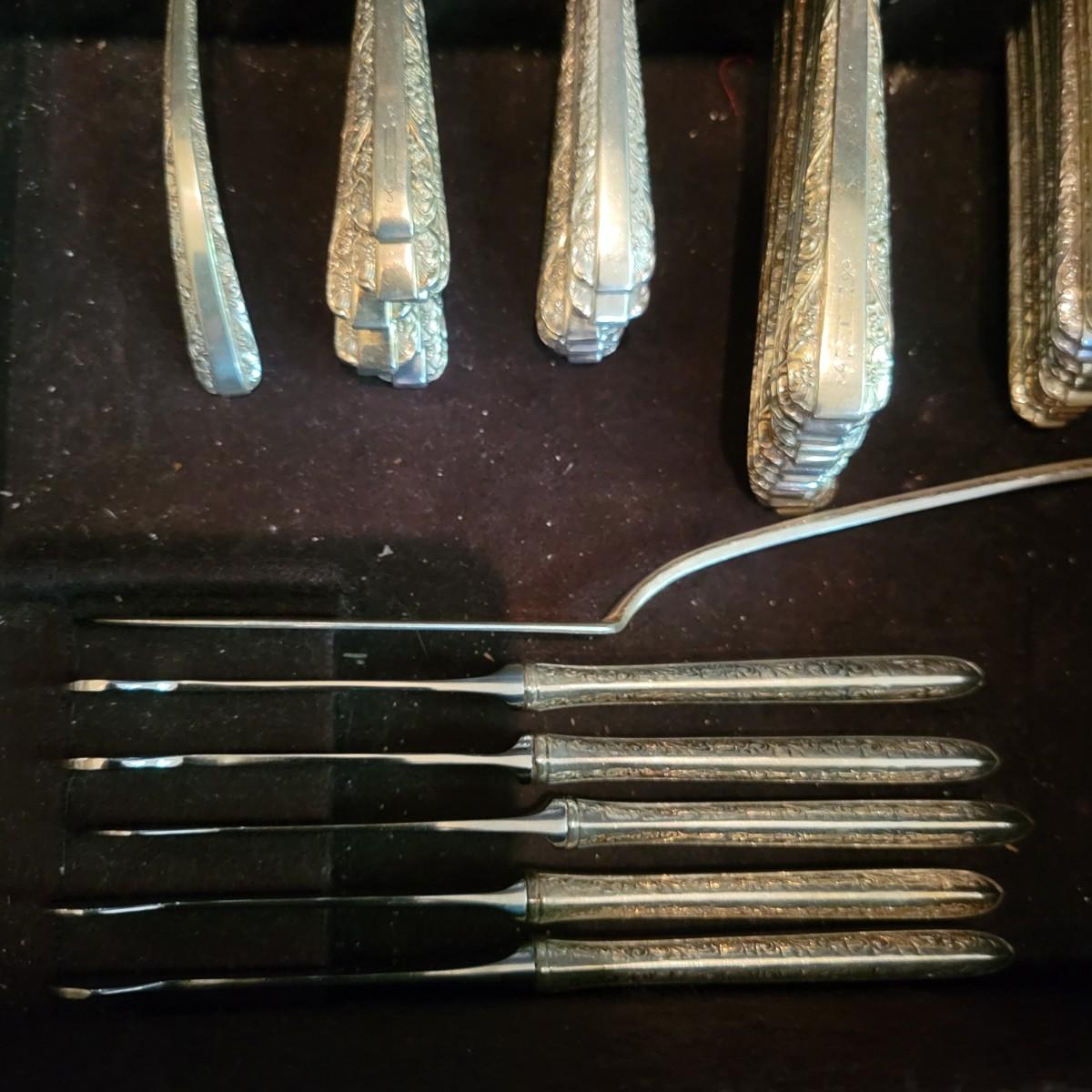 A Towle sterling silverware set that can seat up to eight place settings with many additional pieces. The pattern is "Candlelight". This collection contains approximately 71 pieces all together. It also includes a Naken's silverware anti tarnish chest that locks and has two keys. Chest measures approximately 16" x 11.5" x 4"H. Some pieces are engraved with the letter H. Shipping available. Shipping can be costly. We suggest contacting our preferred local shipping provider, Postage Express, with dimensions and getting an estimate before bidding: (828) 670-5501 or postageexpress@yahoo.com.