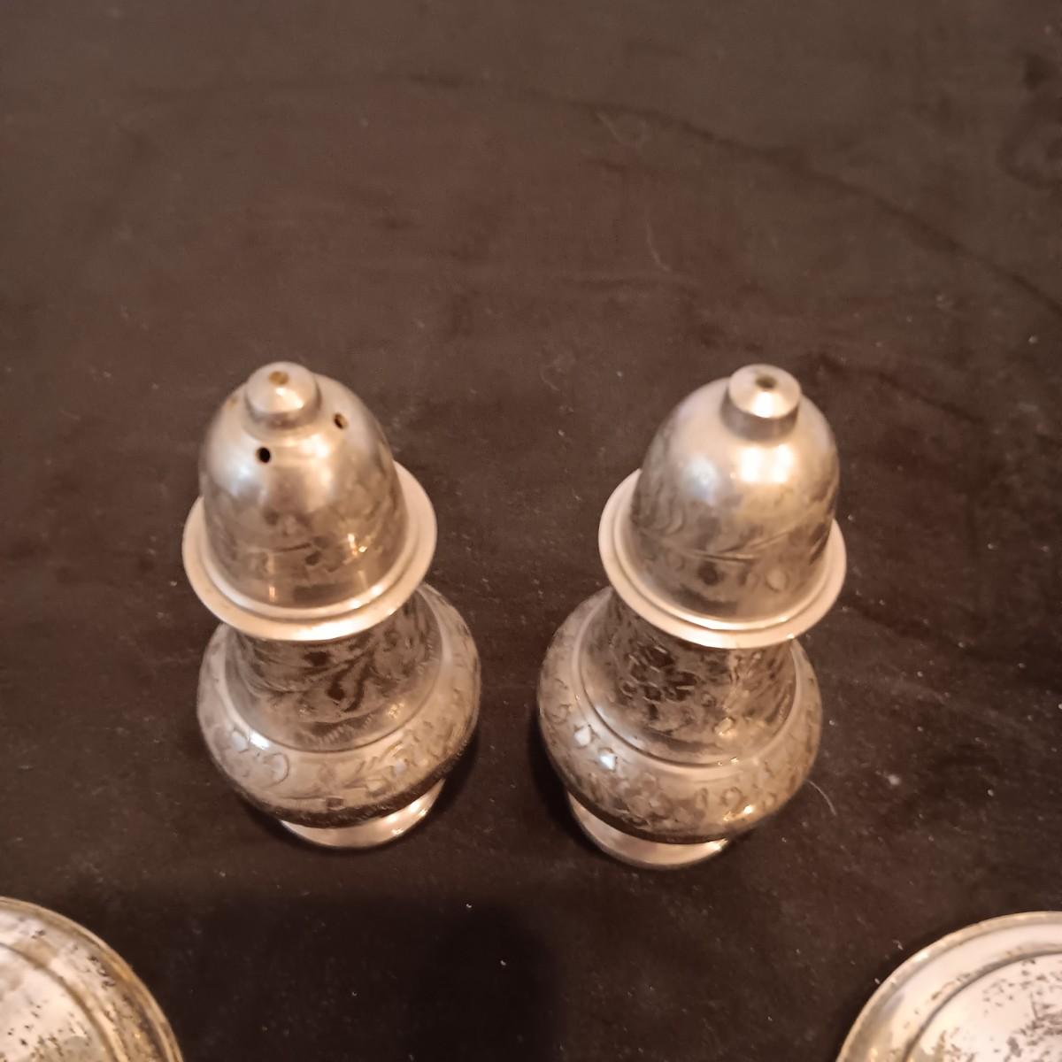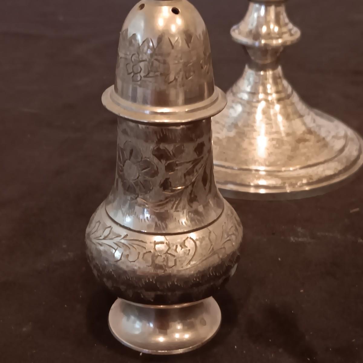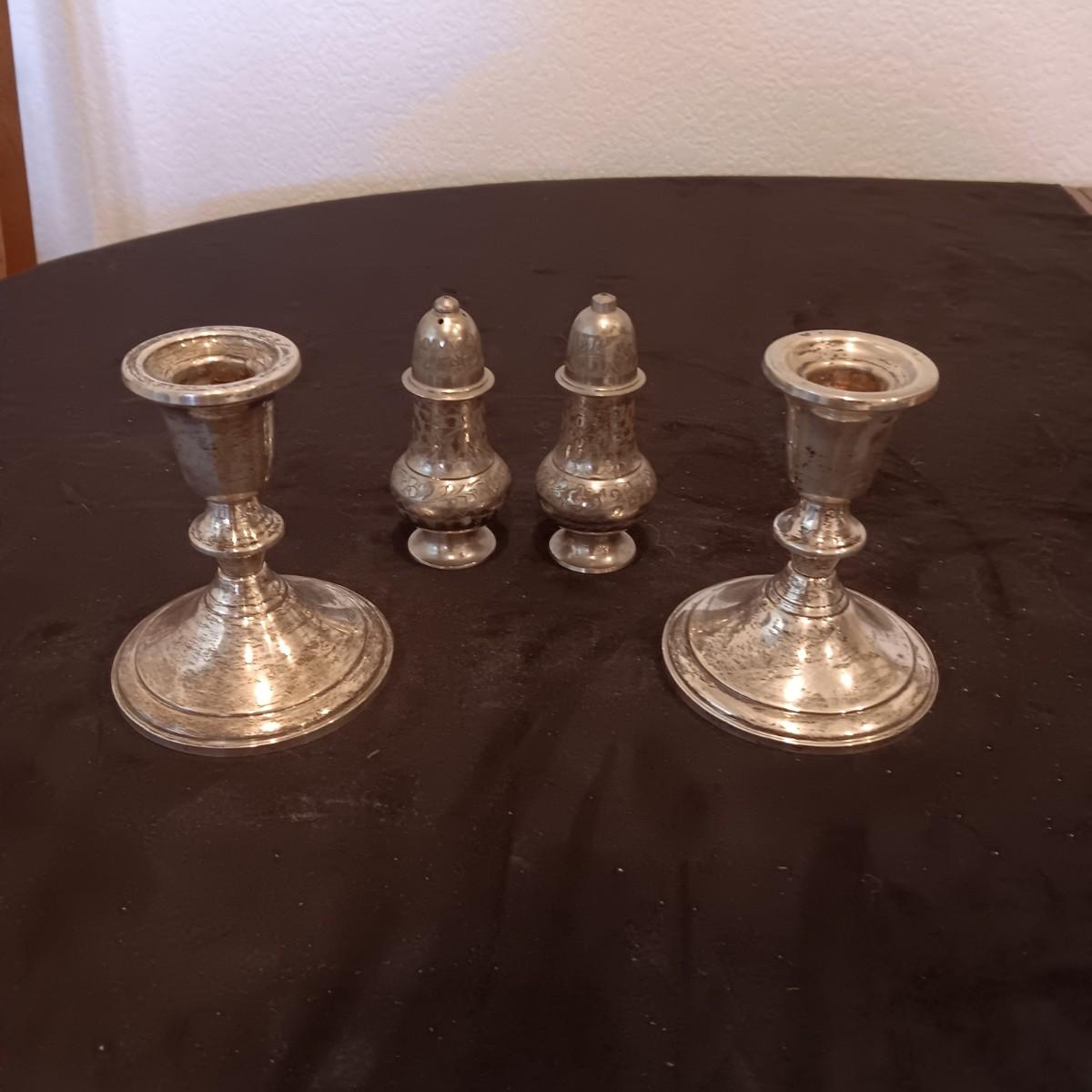 TOWLE WEIGHTED STERLING SILVER CANDLE HOLDERS PLUS ETCHED SILVER PLATED SHAKERS