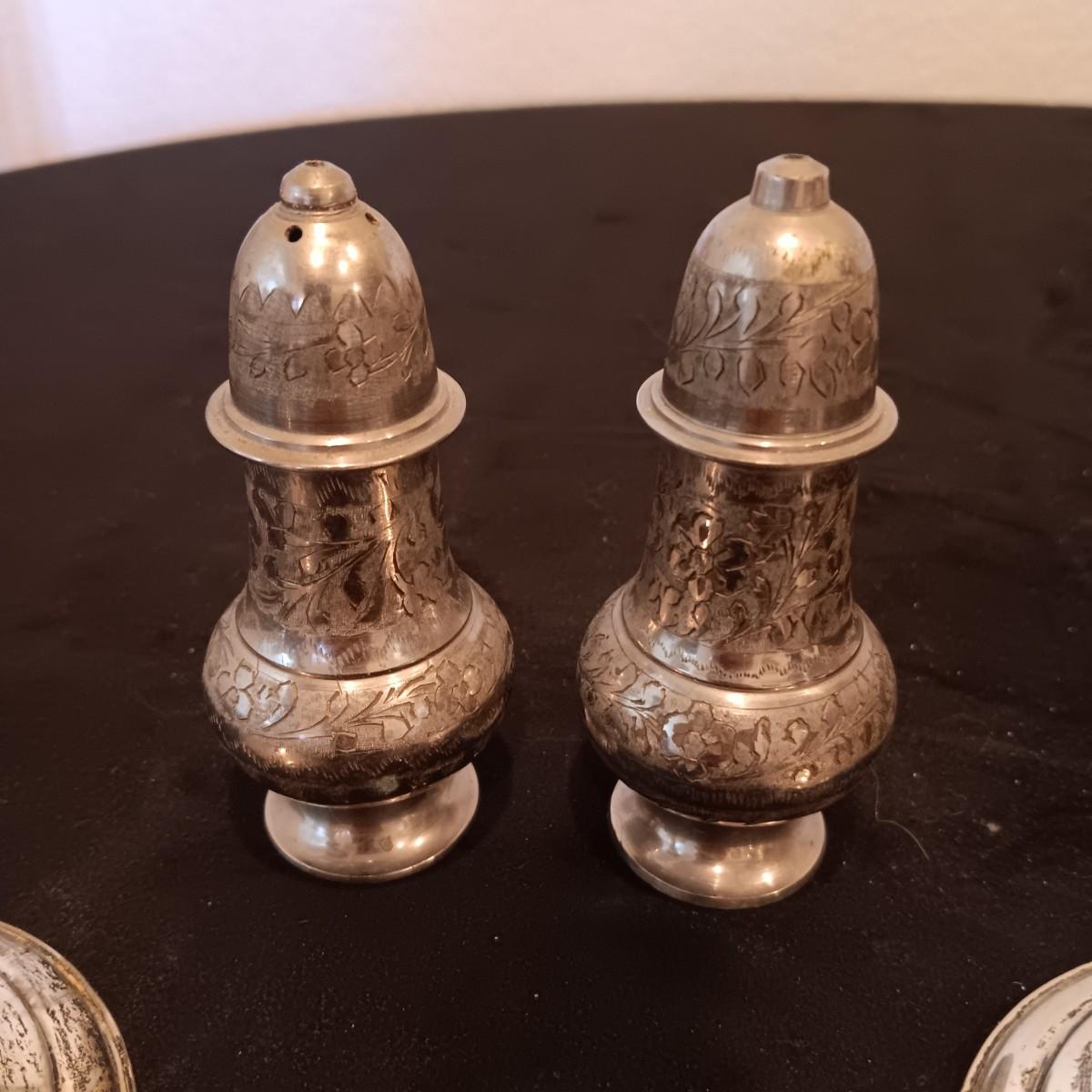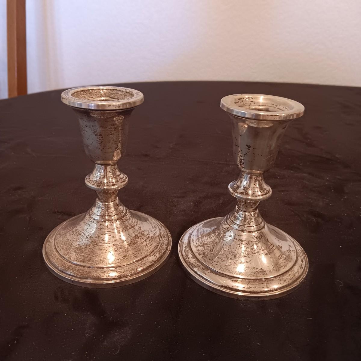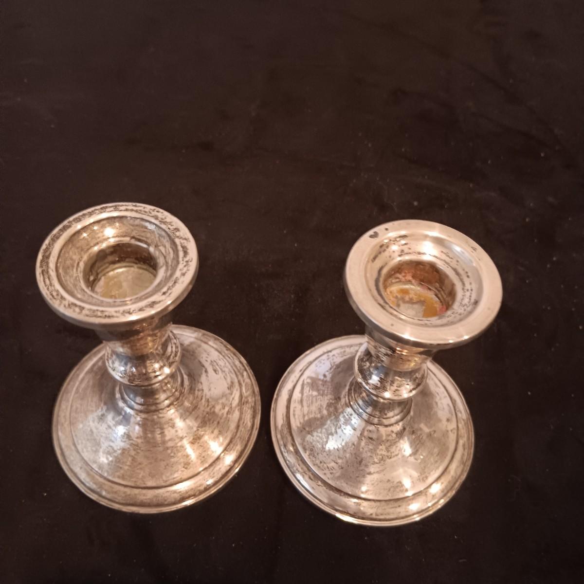 TOWLE WEIGHTED STERLING SILVER CANDLE HOLDERS PLUS ETCHED SILVER PLATED SHAKERS