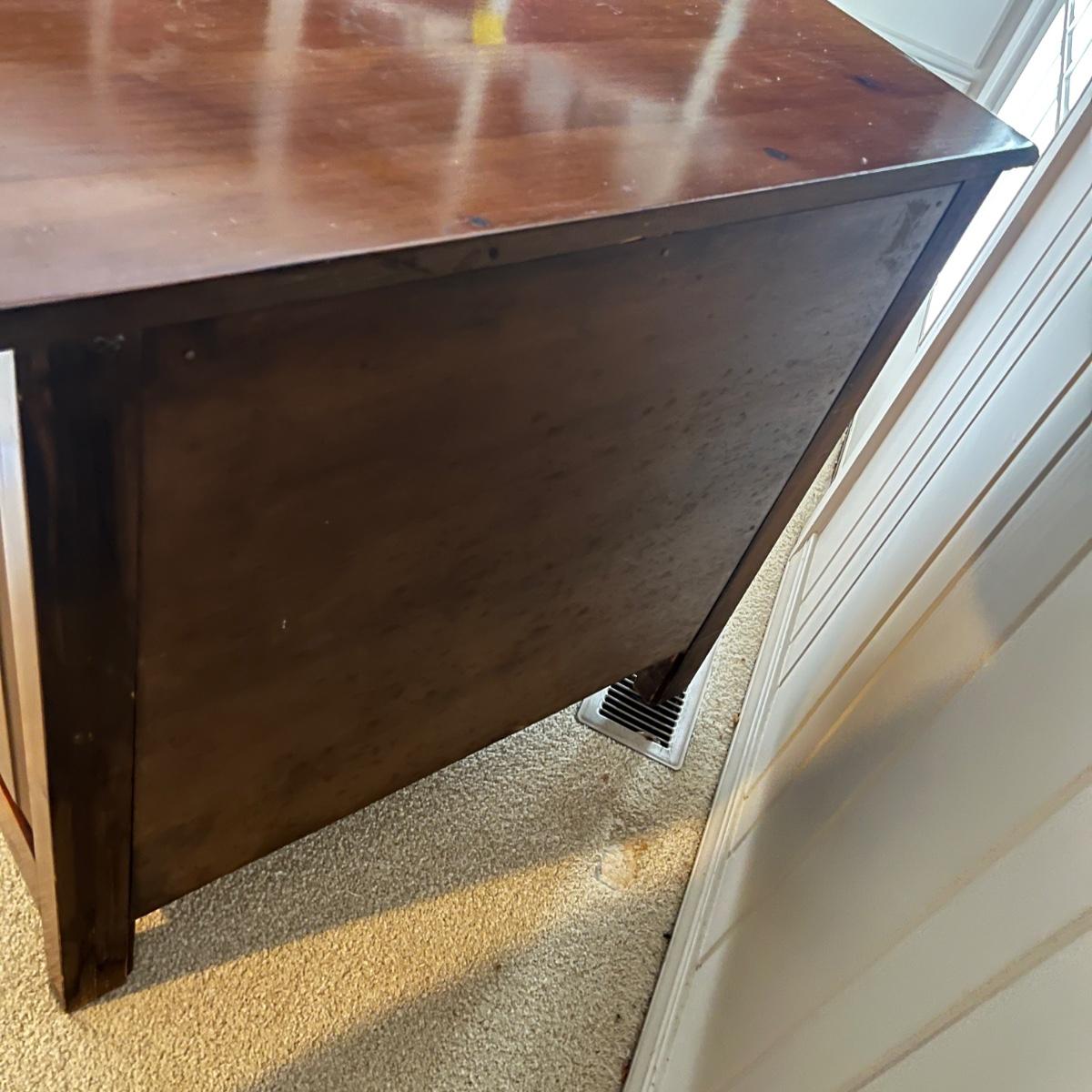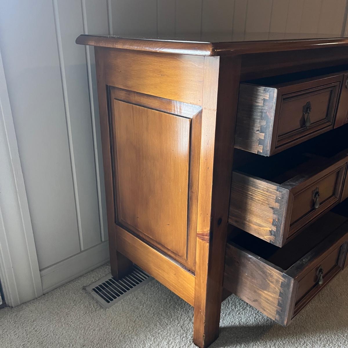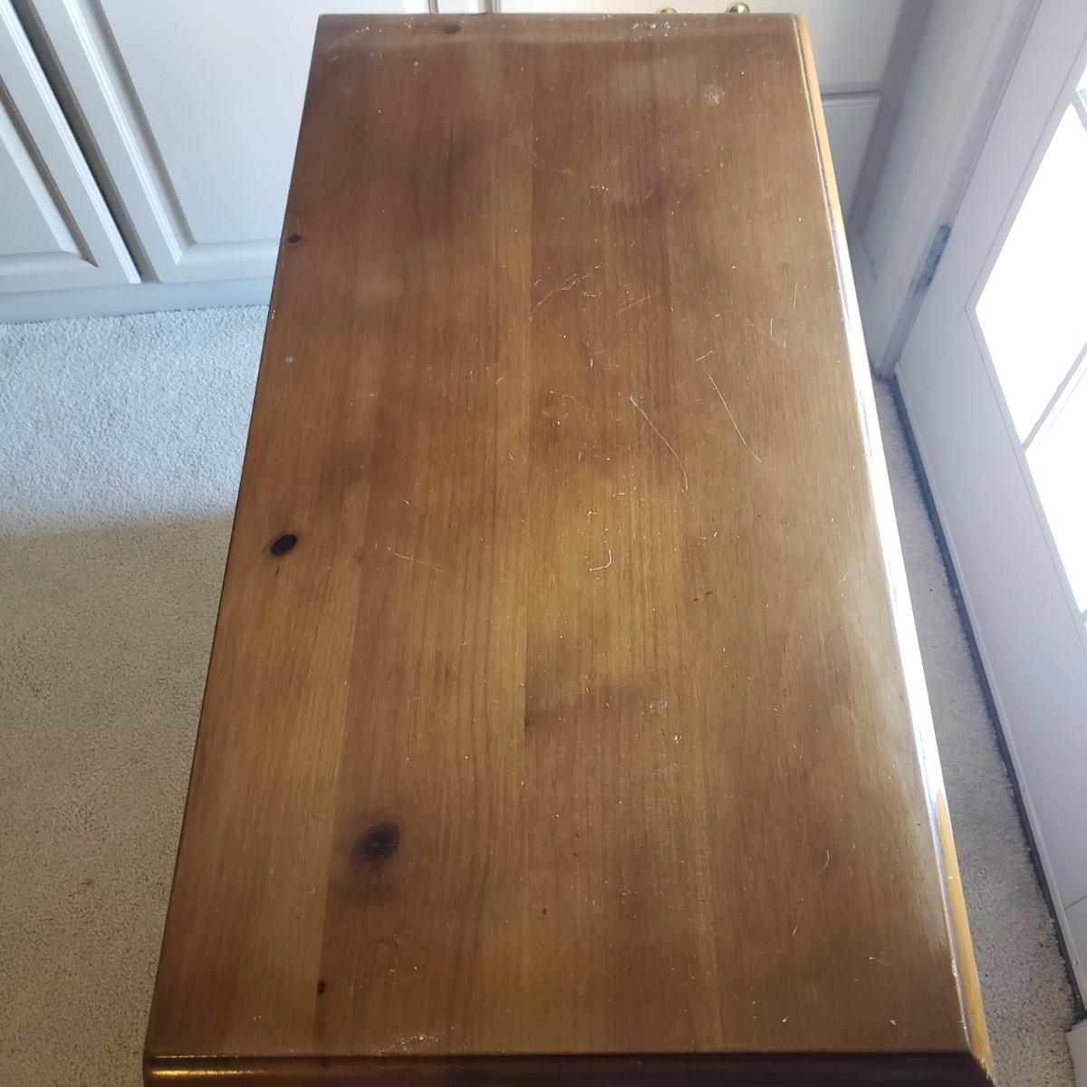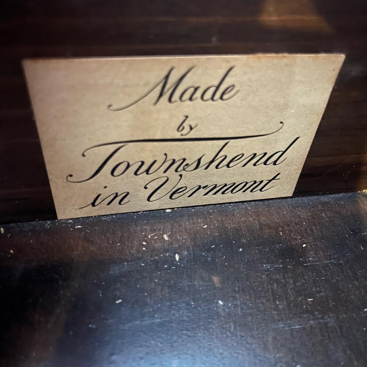 Lot includes a solid wood three dovetailed drawer side table made by Townshend of Vermont. Table measures 34” x 17” x 29.5”H. There is a small blemish in the corner section. The black scratch like marks appears to be intentional. See pictures.