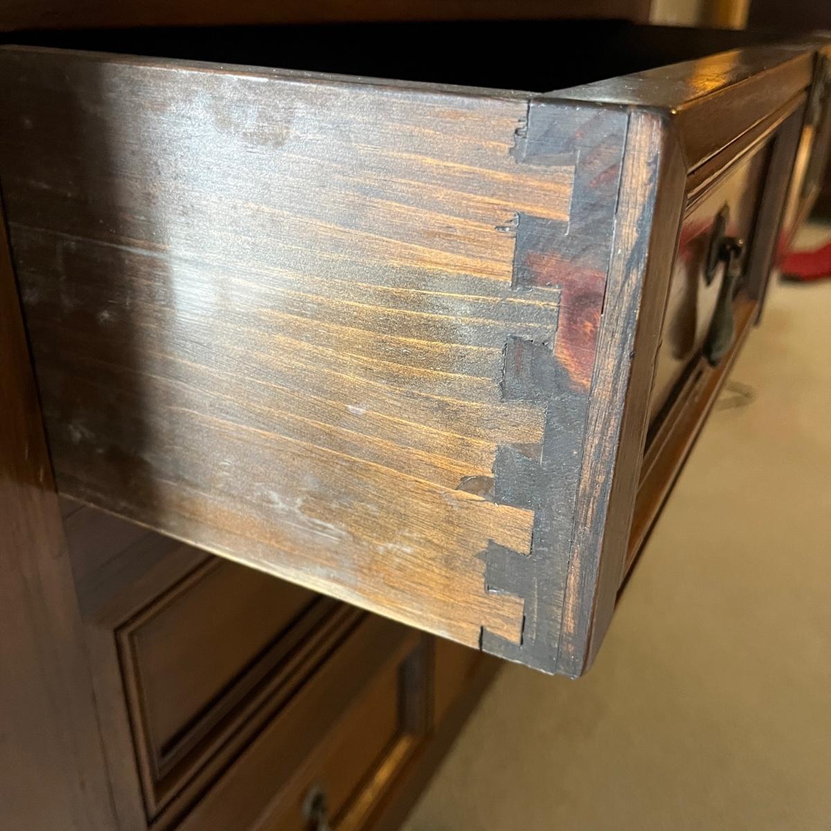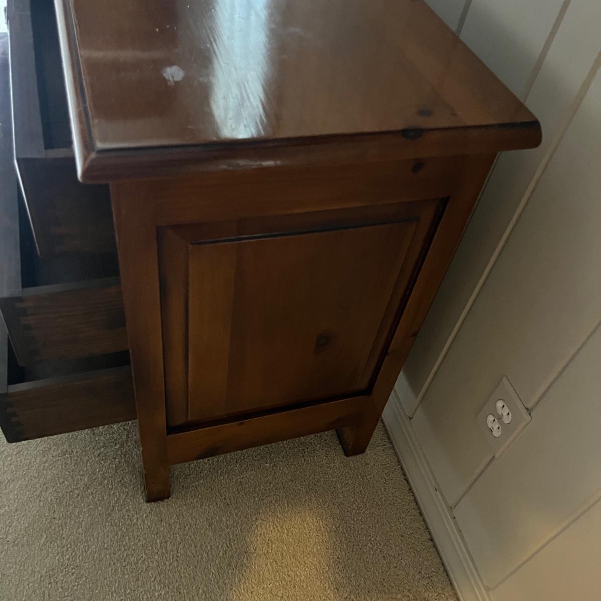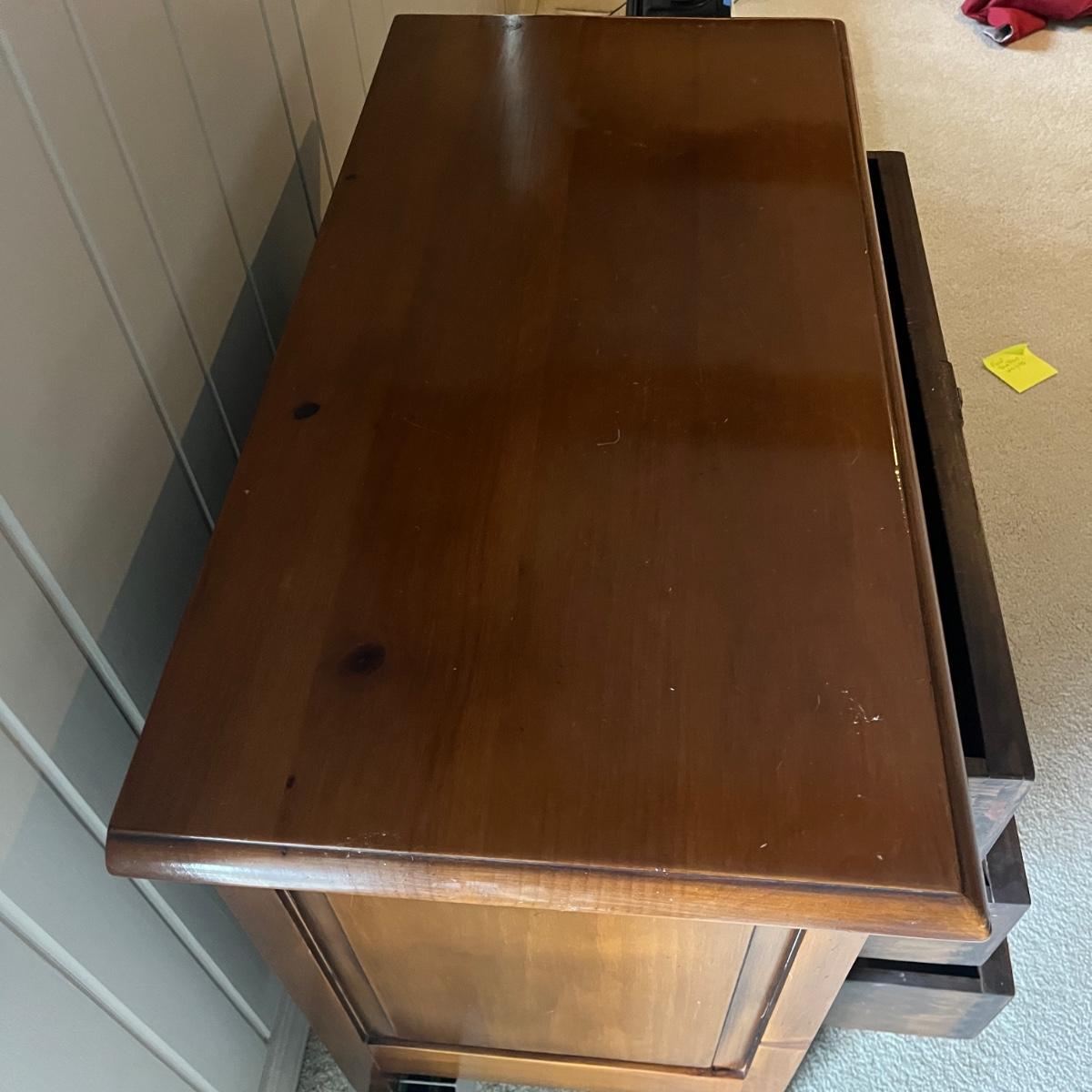 Lot includes a solid wood three dovetailed drawer side table made by Townshend of Vermont. Table measures 34” x 17” x 29.5”H. There is a small blemish in the corner section. The black scratch like marks appears to be intentional. See pictures.