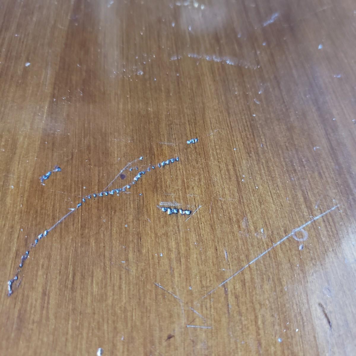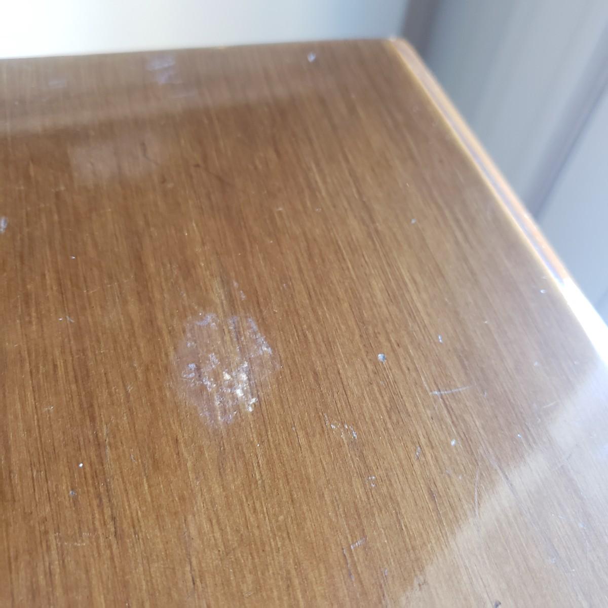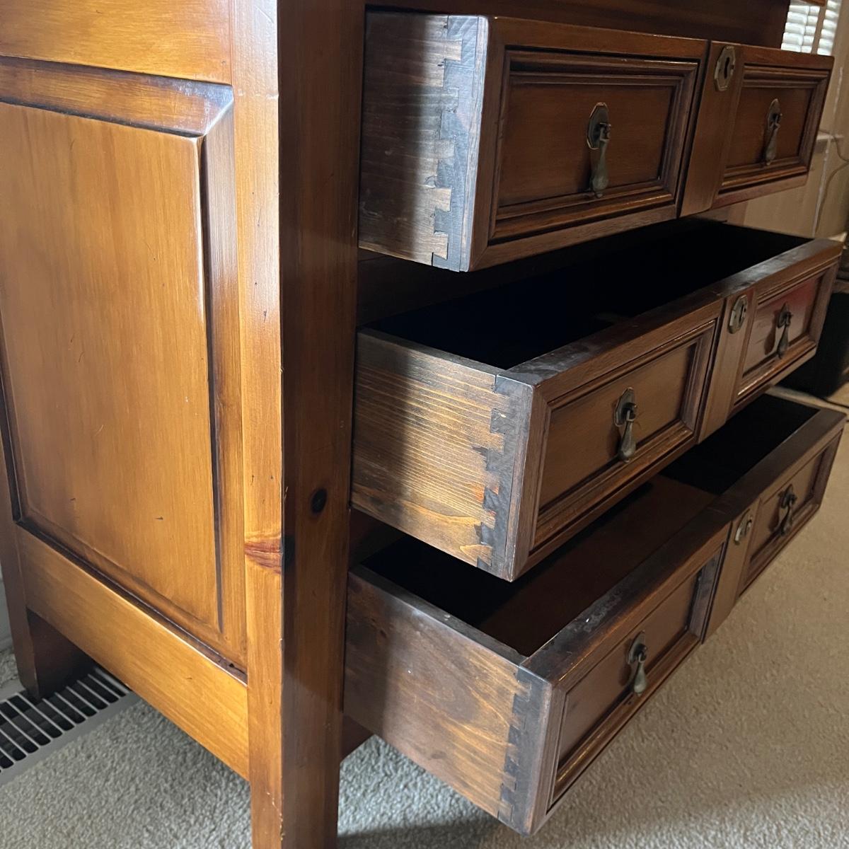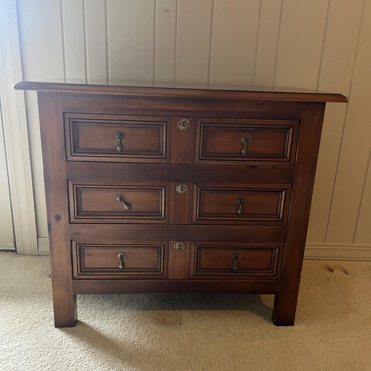 Lot includes a solid wood three dovetailed drawer side table made by Townshend of Vermont. Table measures 34” x 17” x 29.5”H. There is a small blemish in the corner section. The black scratch like marks appears to be intentional. See pictures.