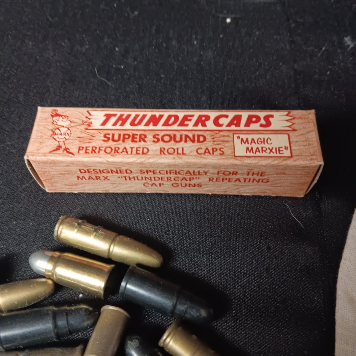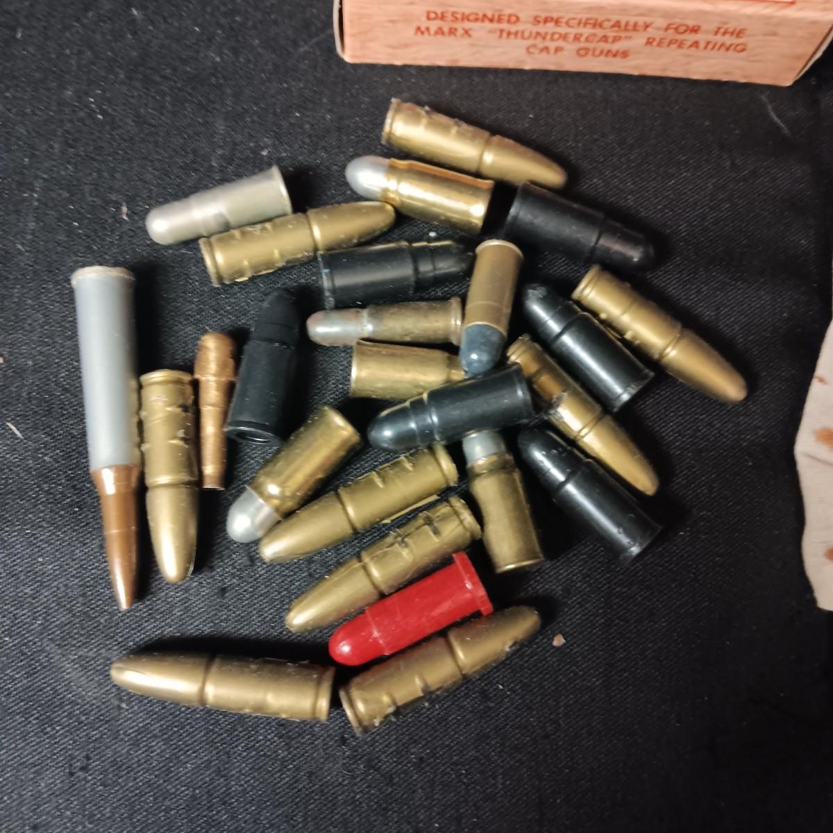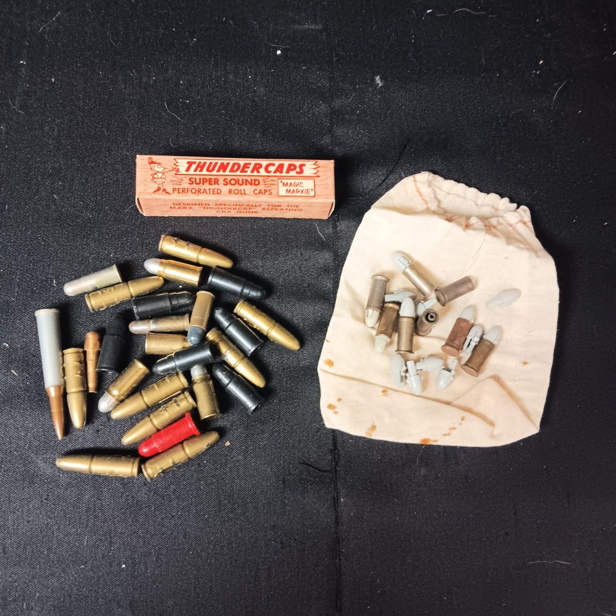 TOY BRASS AND PLASTIC BULLETS AND A BOX OF THUNDERCAPS