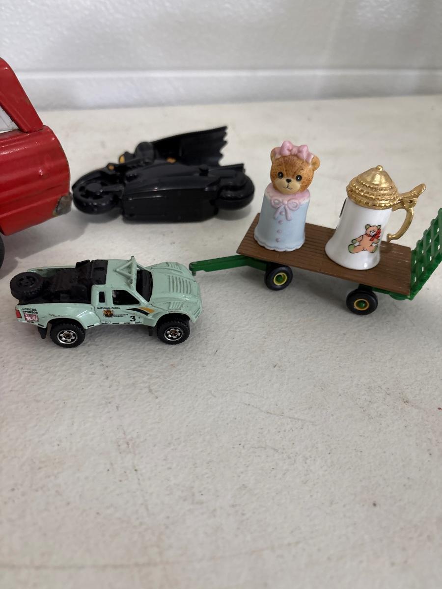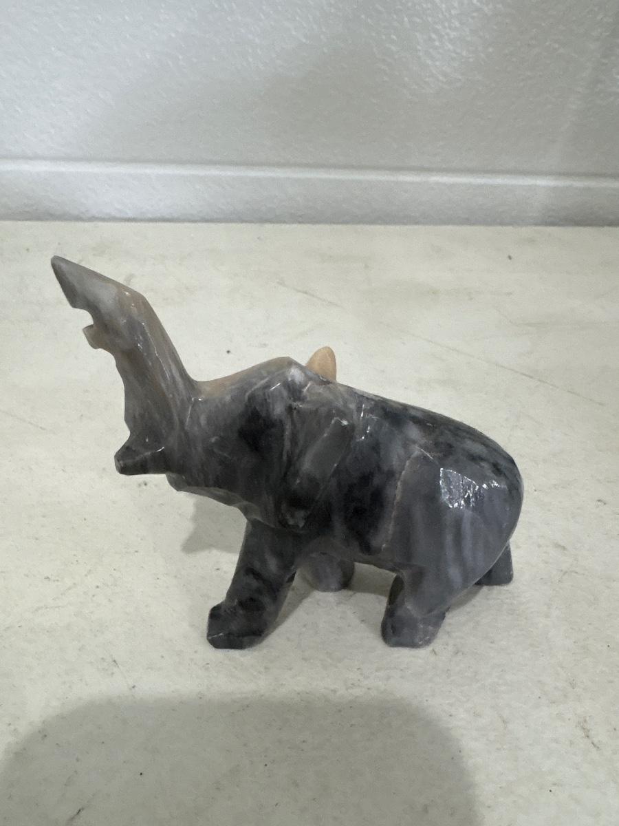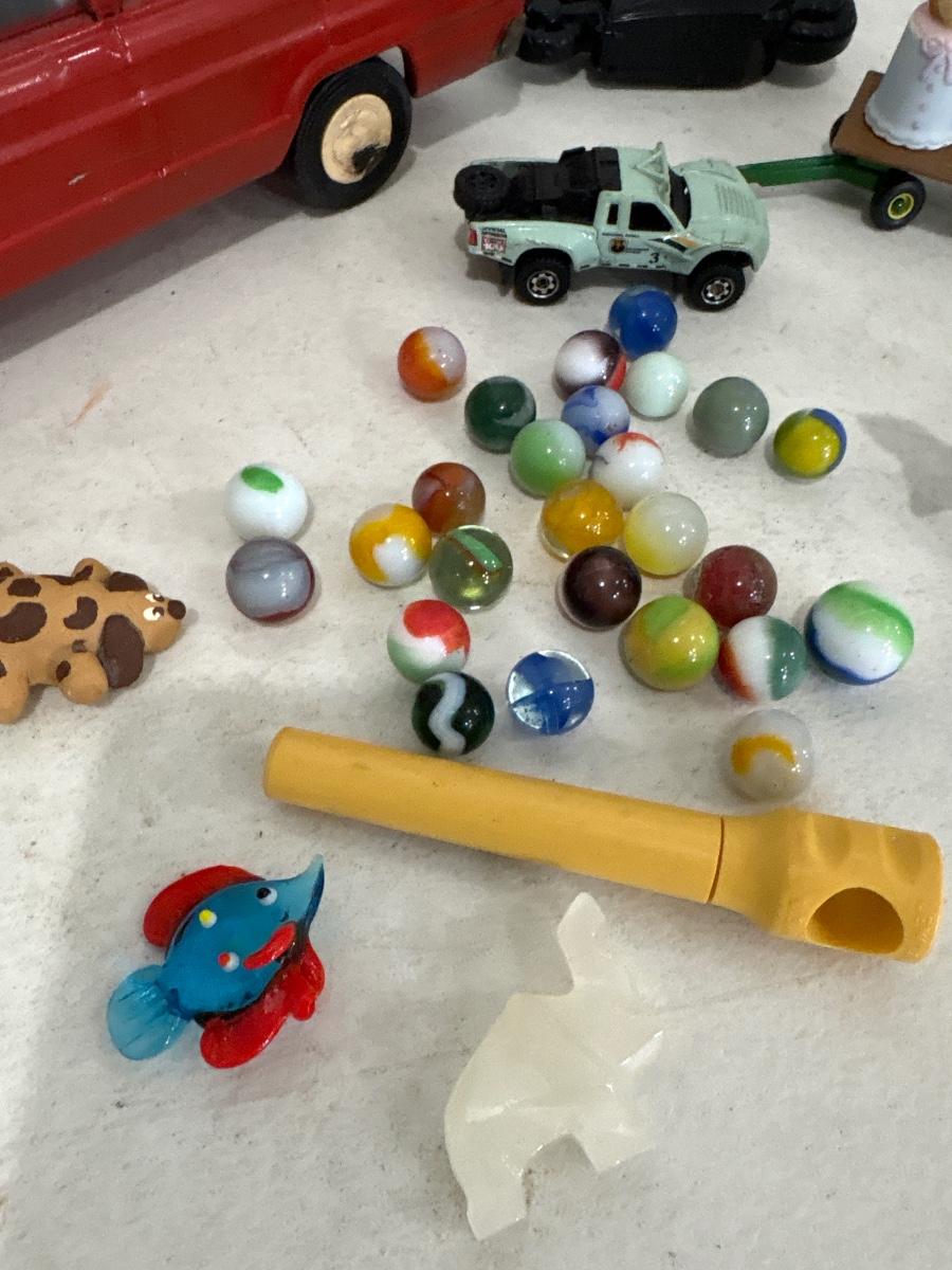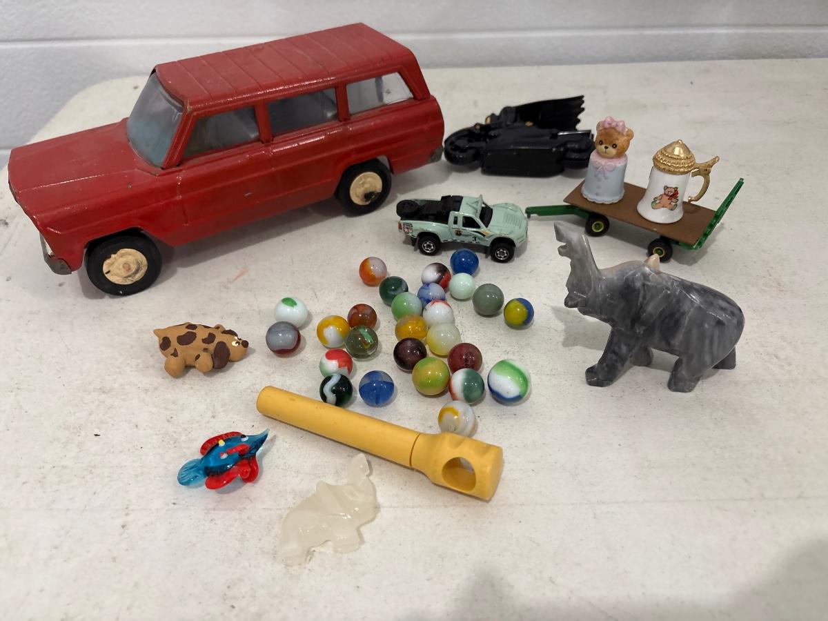 Toy car, marbles, and marble elephant