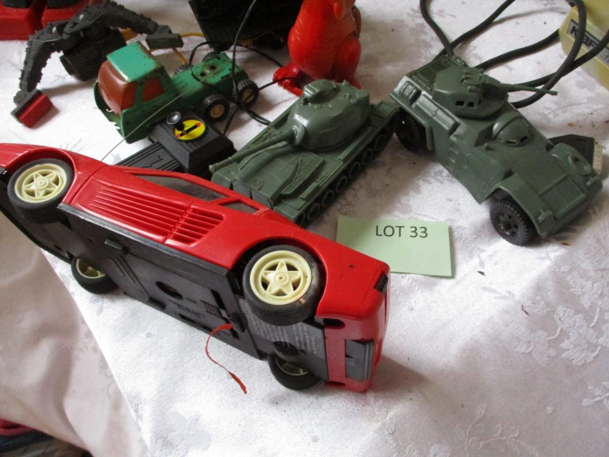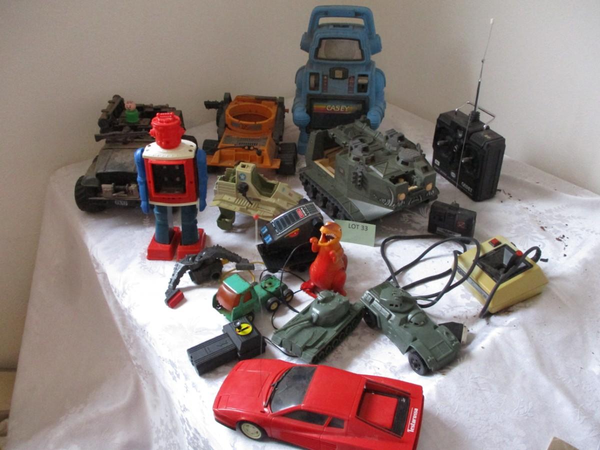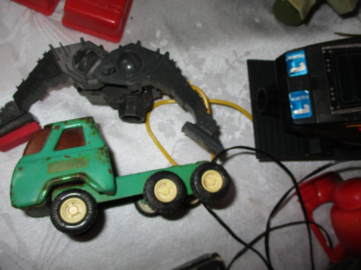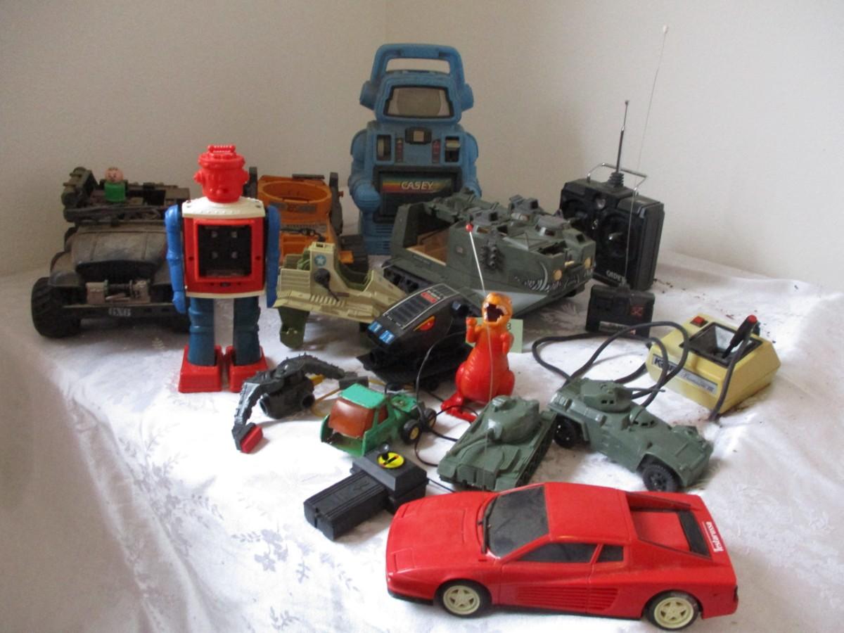 Plastic Army /Tanks and Jeep. Red Testarosa Plastic. Small Metal Green truck. Plastic Casey Robot. Red/Blue Robot. No guarantee any toys work. Normal wear.