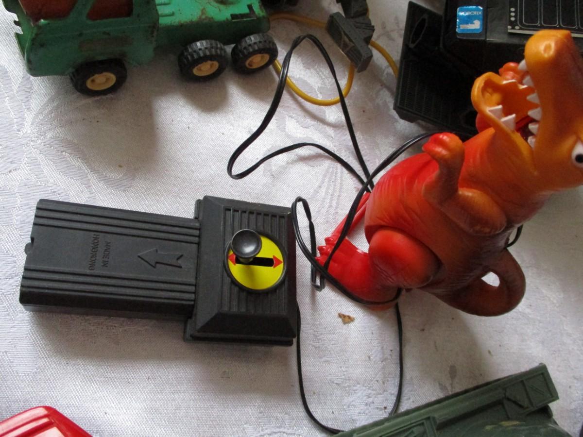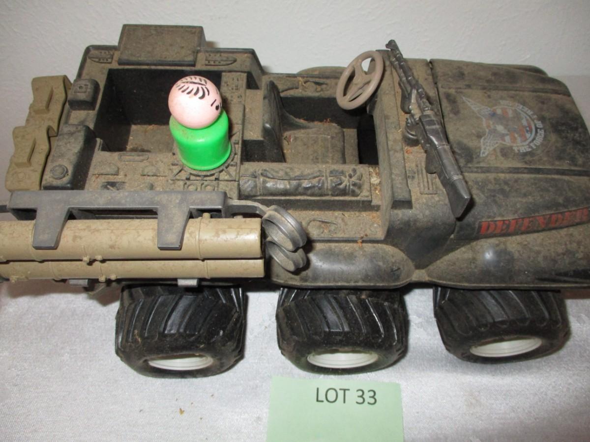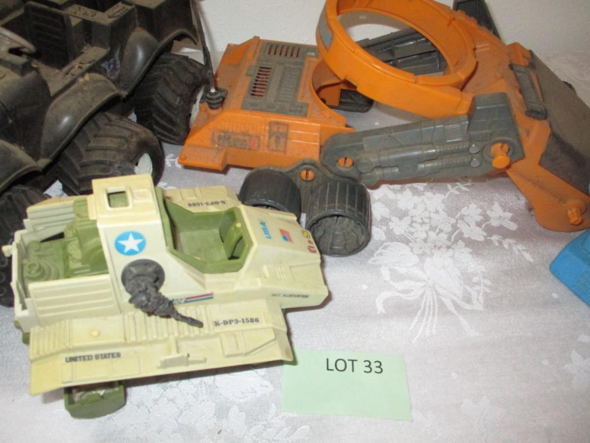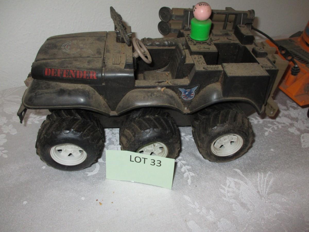 Plastic Army /Tanks and Jeep. Red Testarosa Plastic. Small Metal Green truck. Plastic Casey Robot. Red/Blue Robot. No guarantee any toys work. Normal wear.