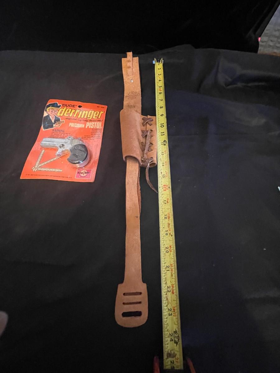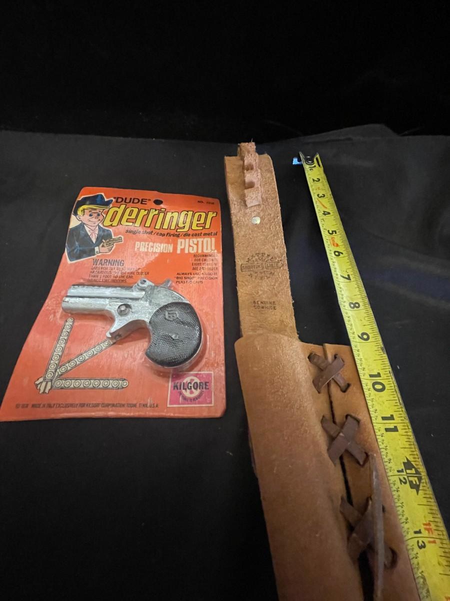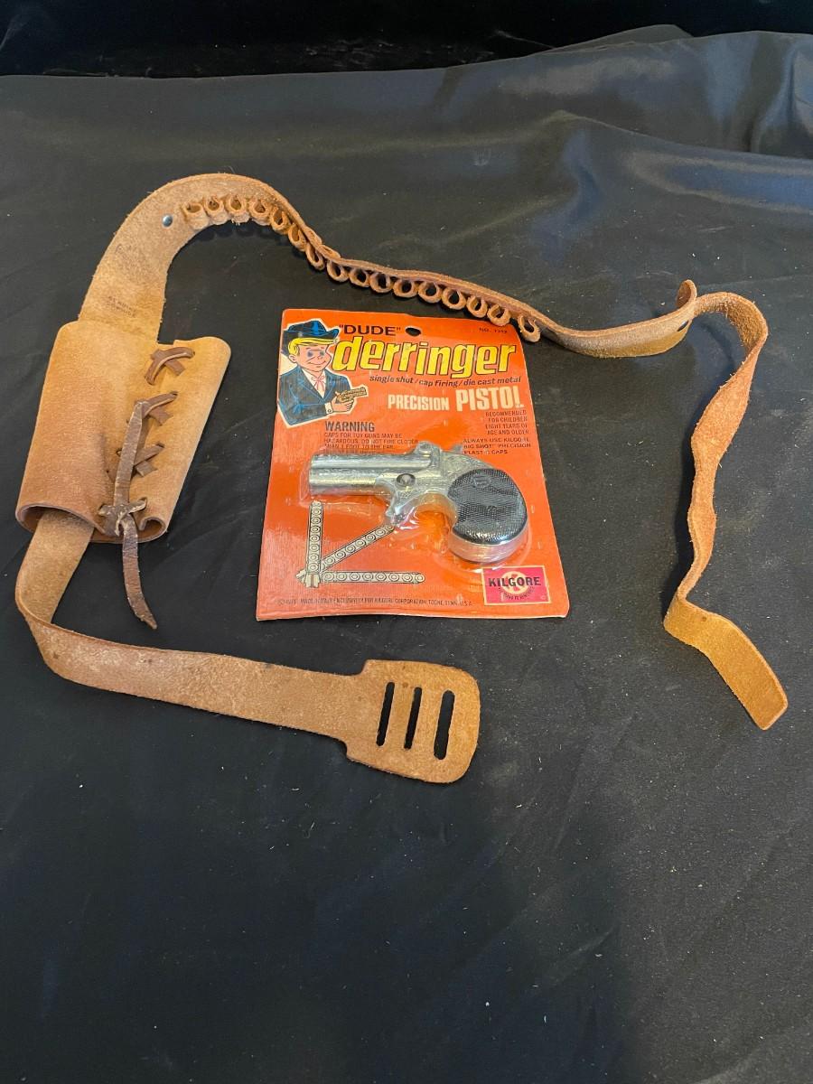 TOY DERRINGER SEALED ON BOARD AND A CHILD'S LEATHER BULLET BELT