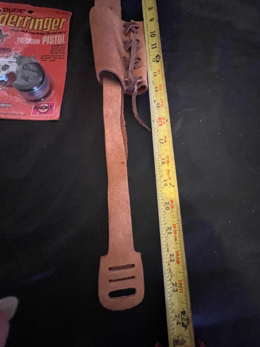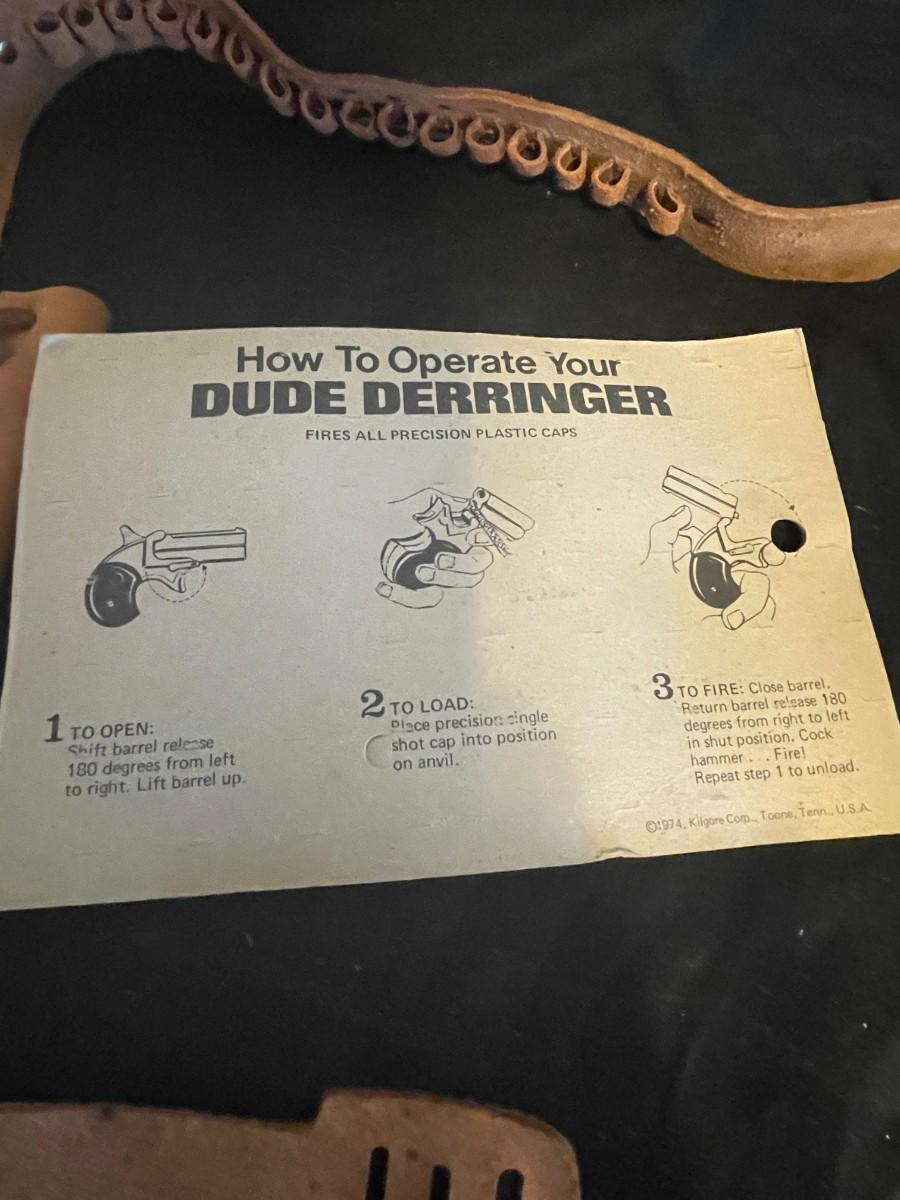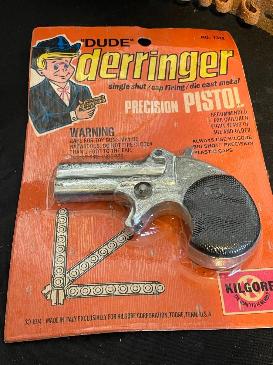 TOY DERRINGER SEALED ON BOARD AND A CHILD'S LEATHER BULLET BELT