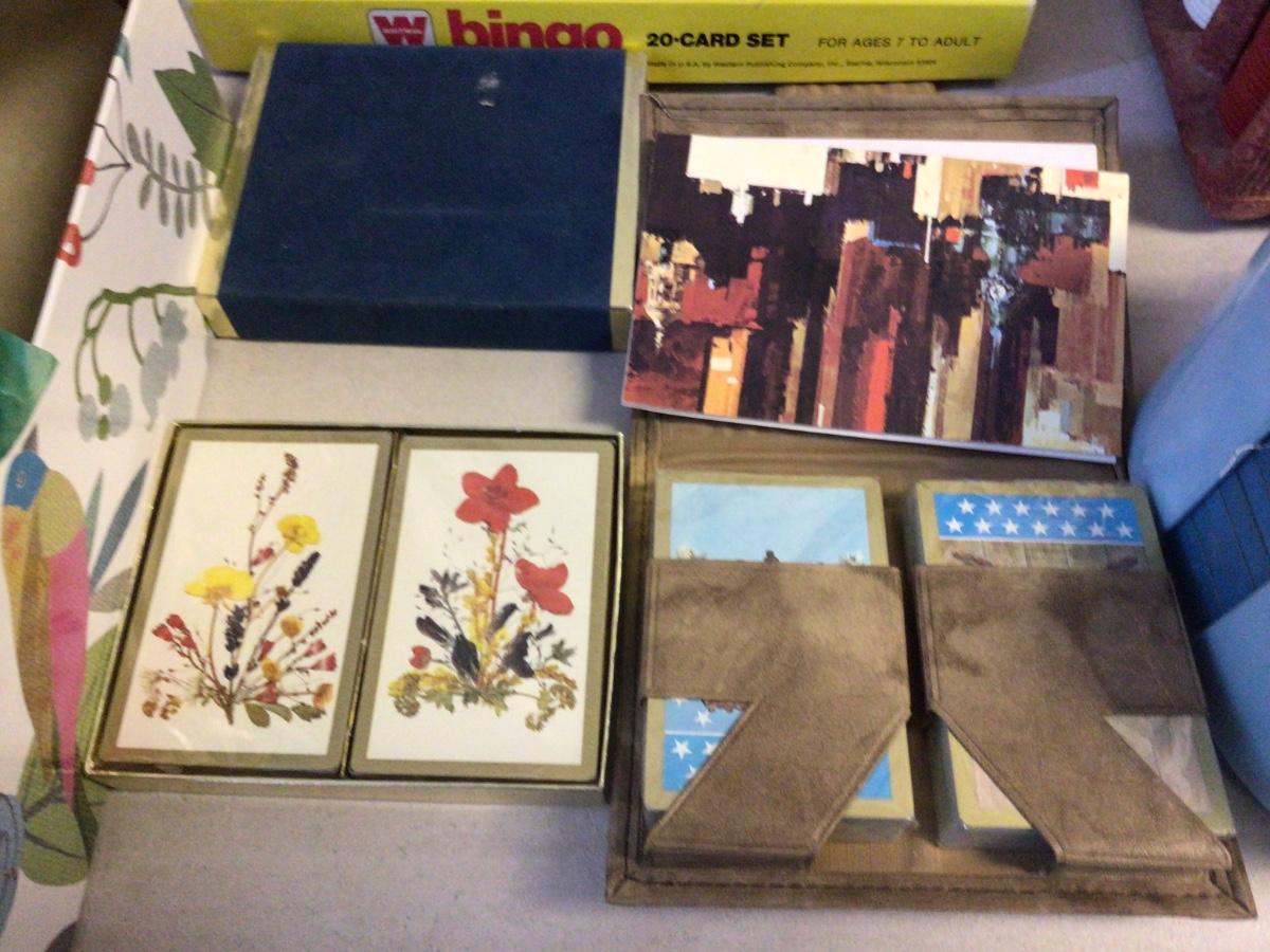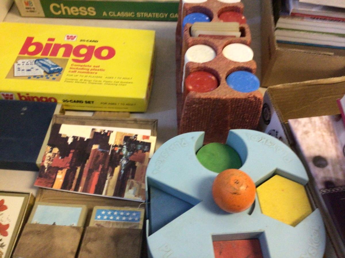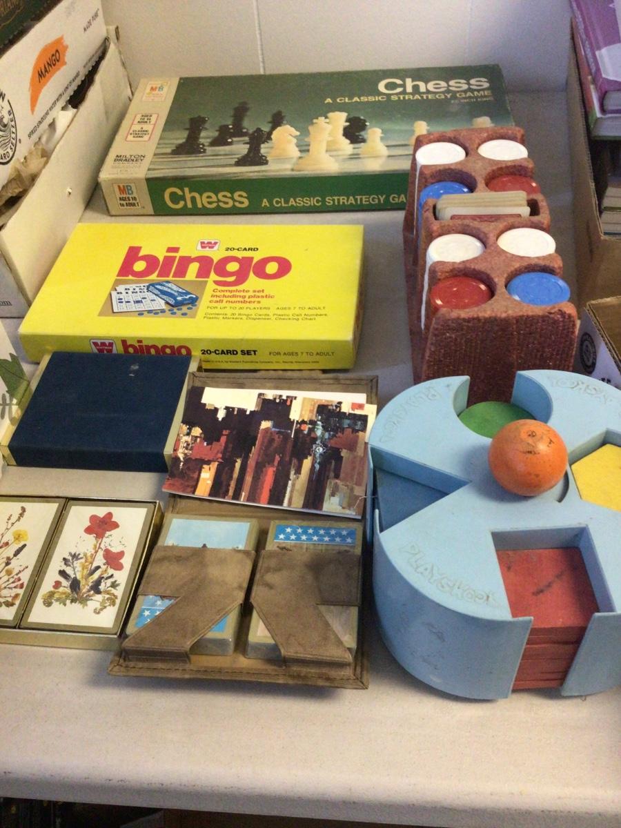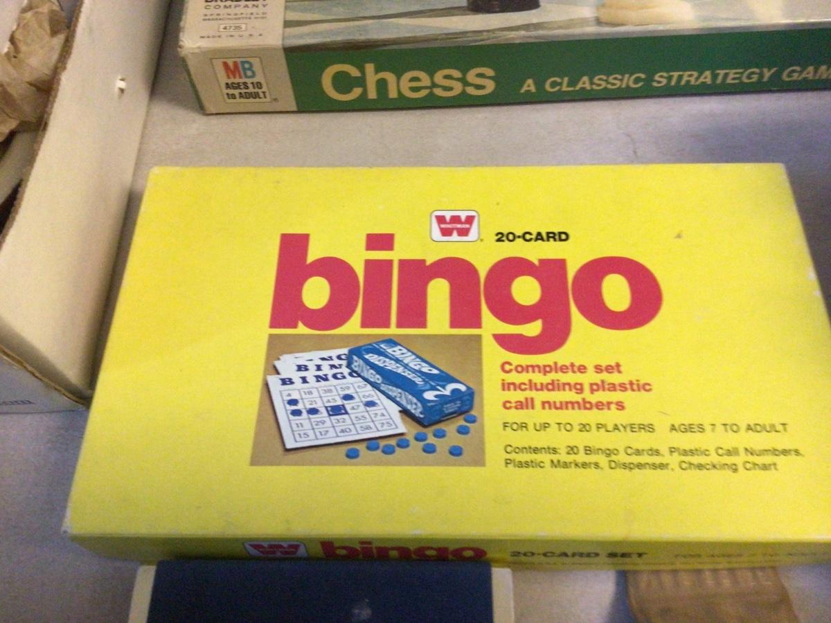 Chess set, poker chips, bingo, two sets of two playing cards. All pieces are there.