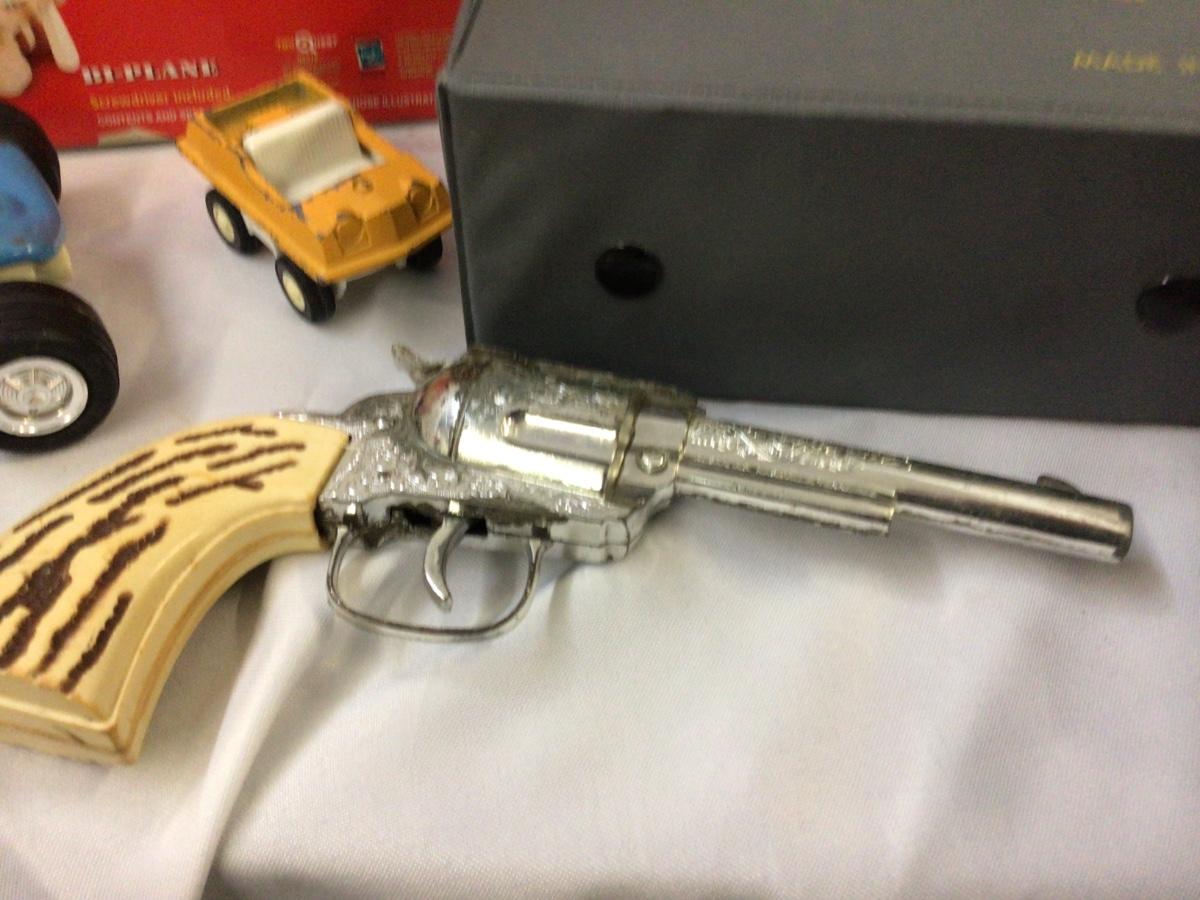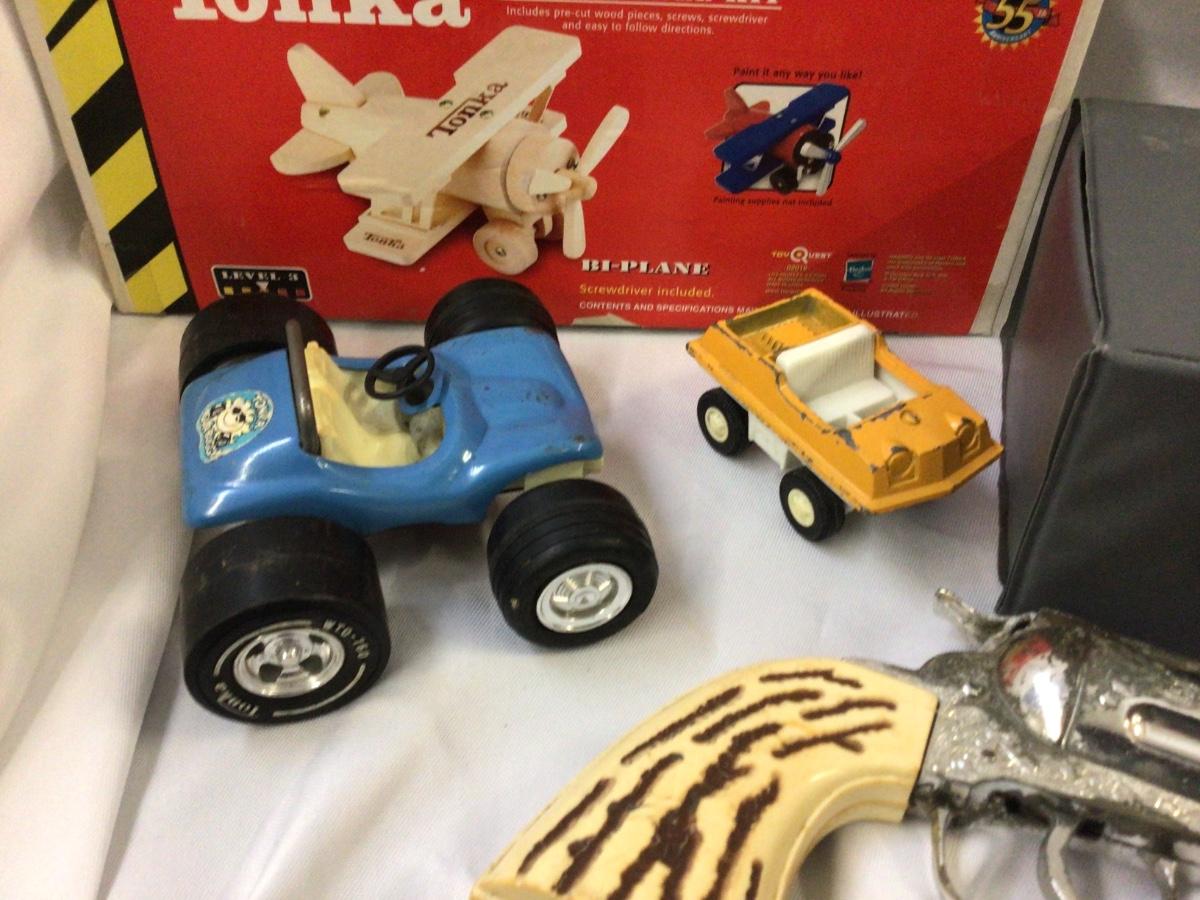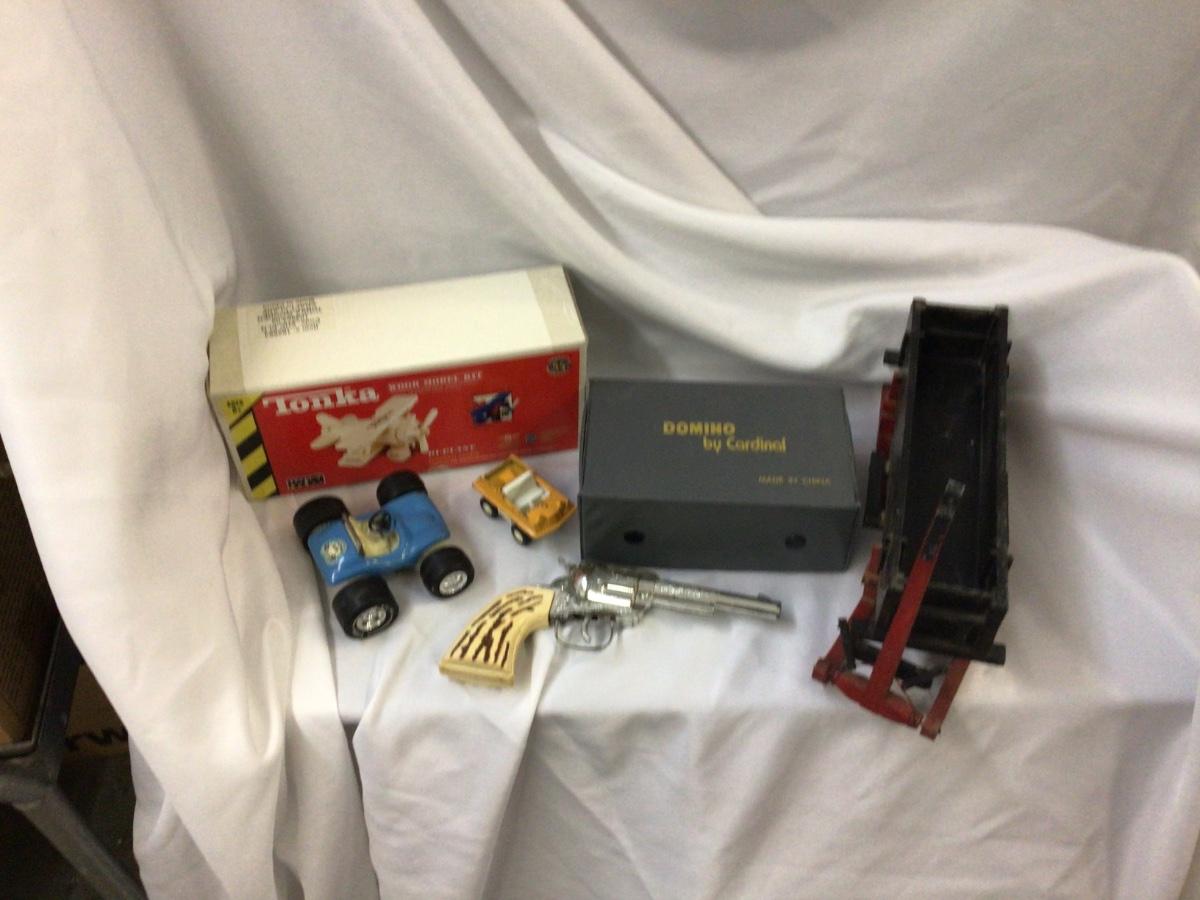 You get a great new in the box Tonka wood airplane kit, cap gun, couple of Tonka cars, nice wood slay, and Cardinal dominoes.