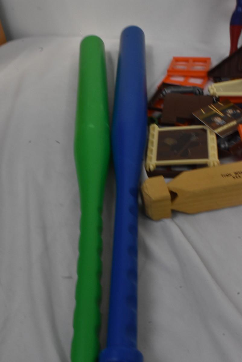 Toy lot: Spiderman, metal detector-turns on, cash register, wood train whistle