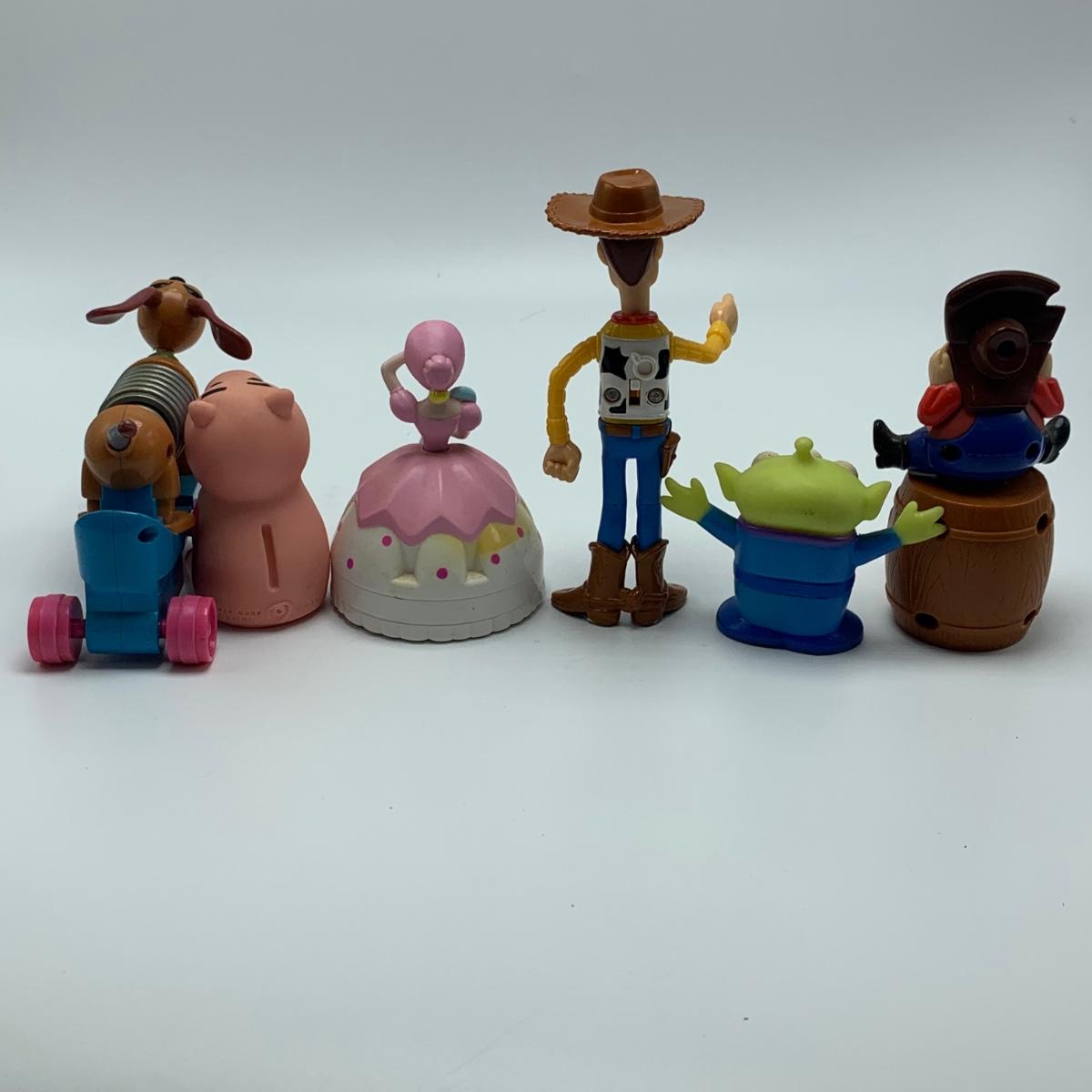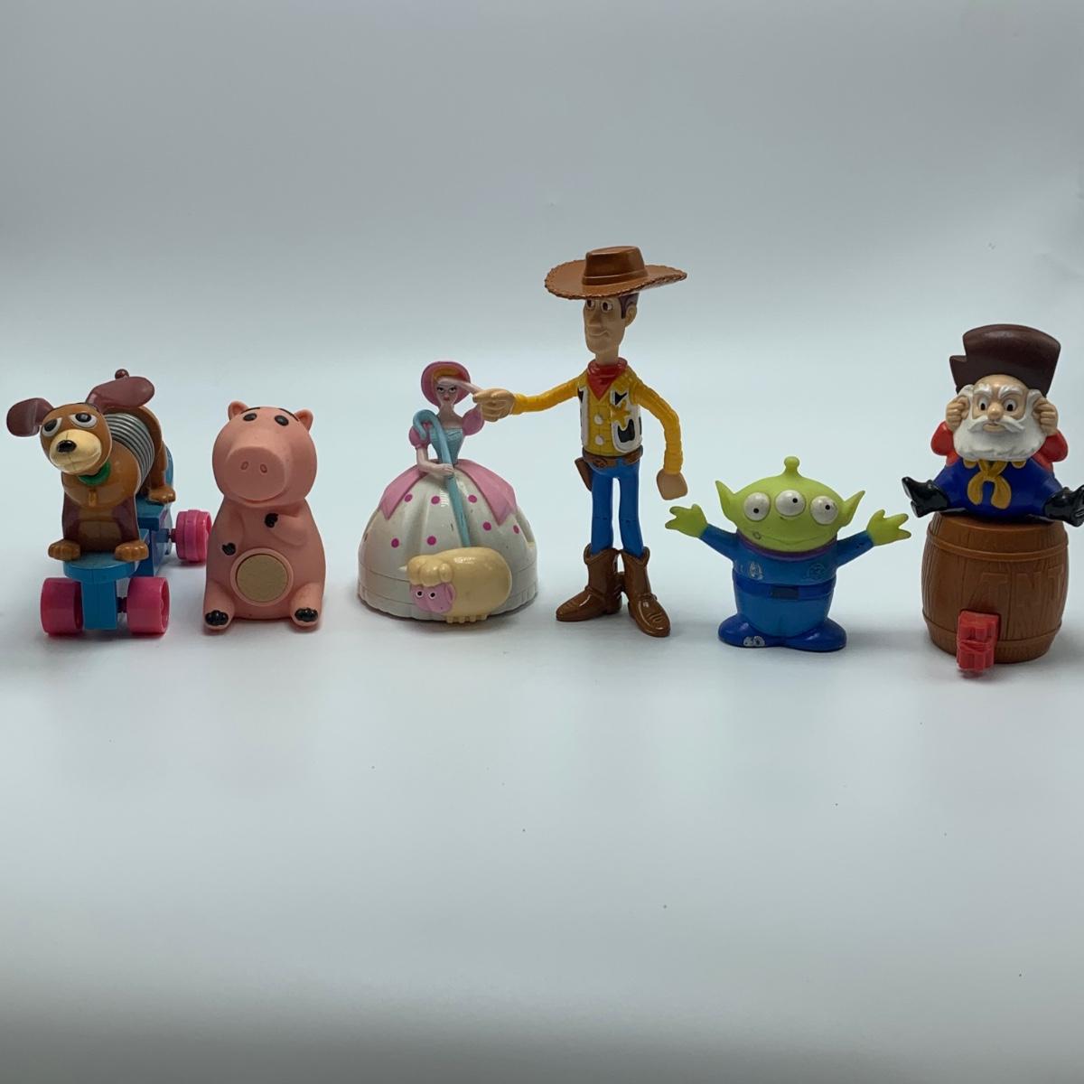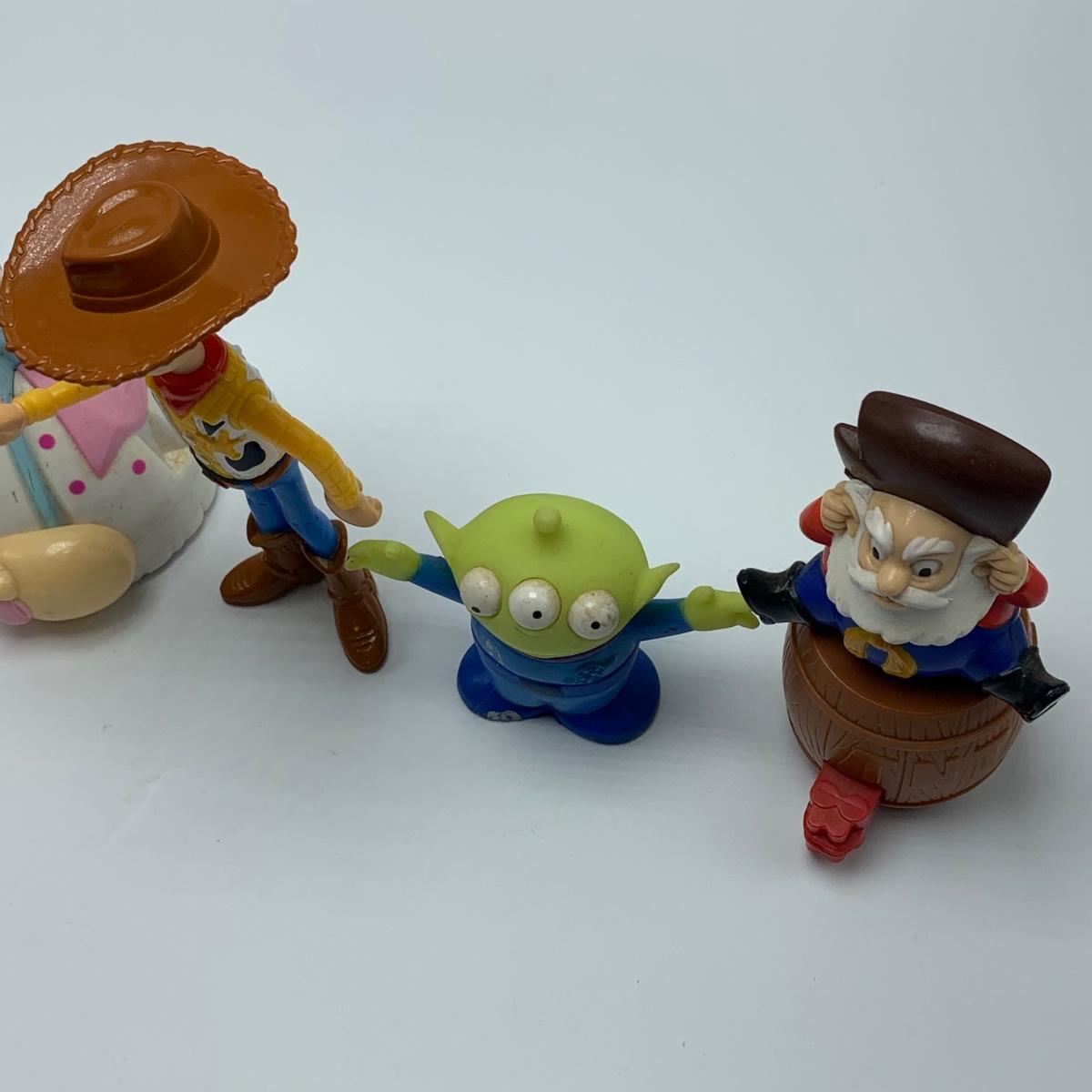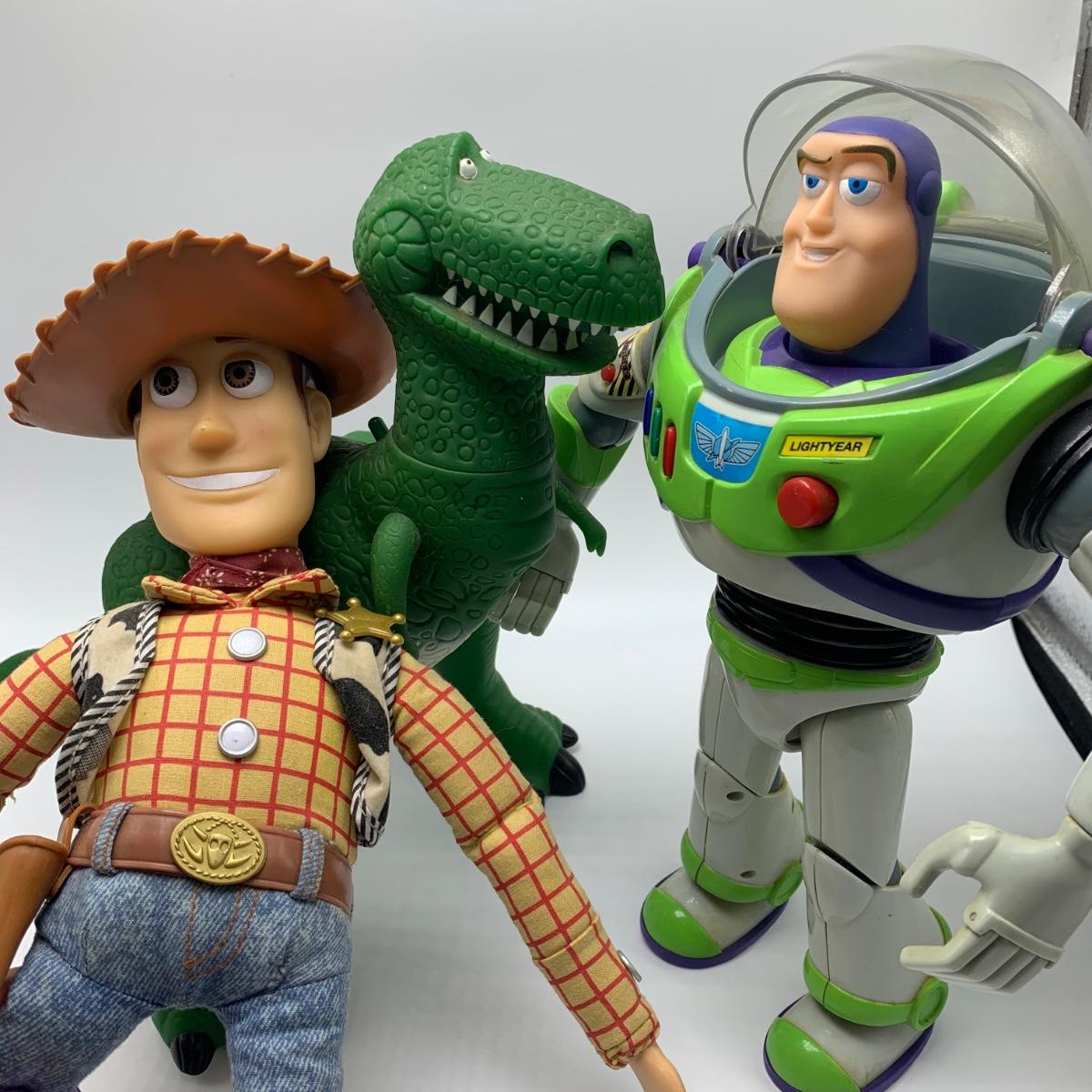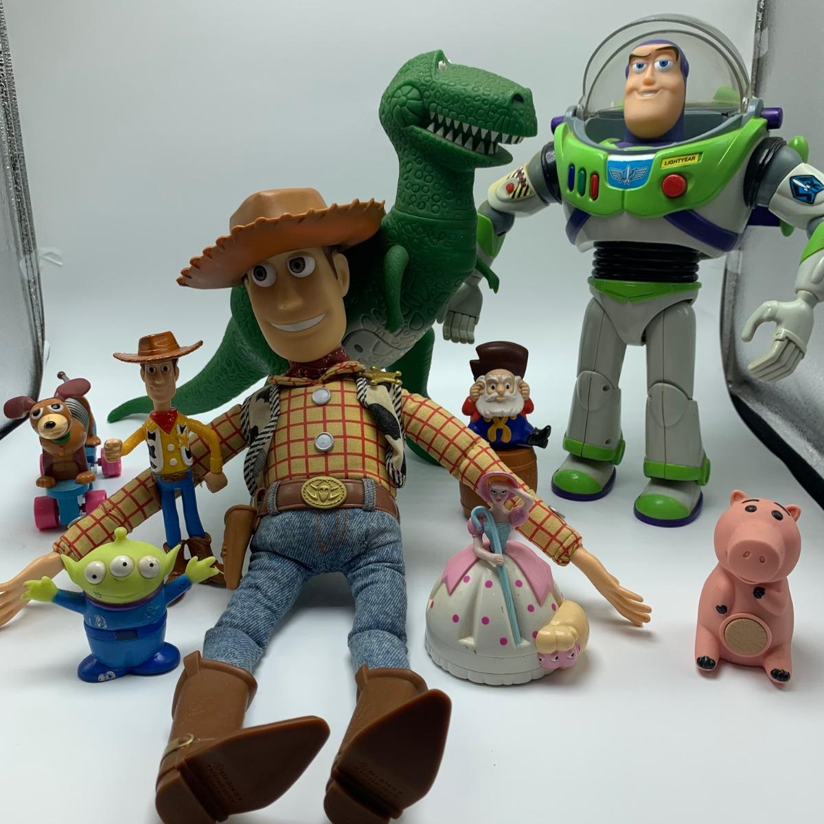 Three big and six small Toy Story character toys and figurines. All are plastic except Woody’s body is plush and fabric. The electronic toys did not function when tested and likely need their batteries replaced. The tallest item is Buzz Lightyear at 12.5” tall and the smallest is the alien at 2.5” tall.