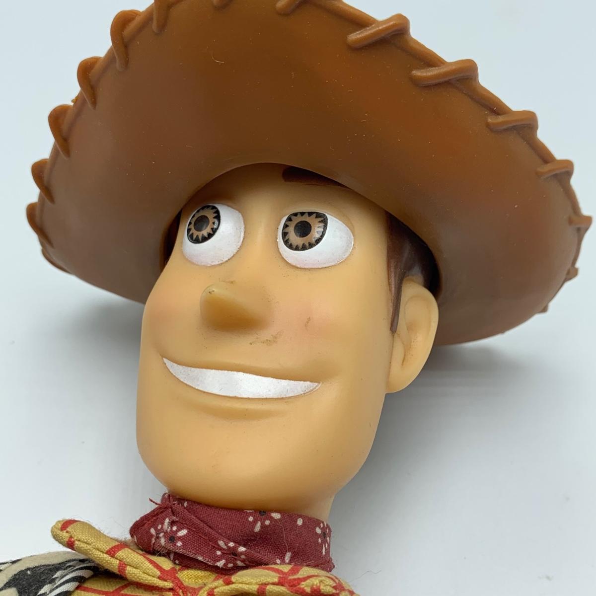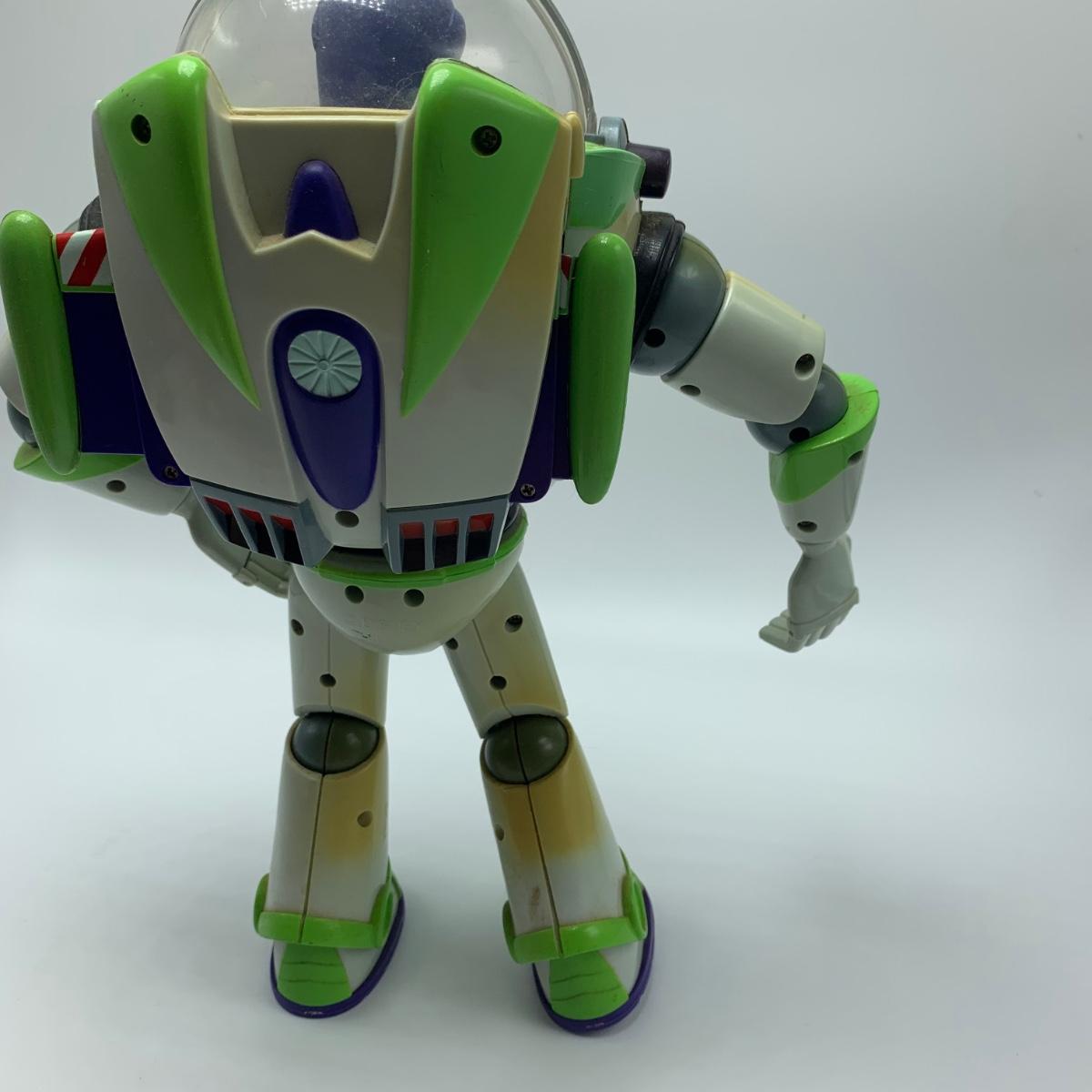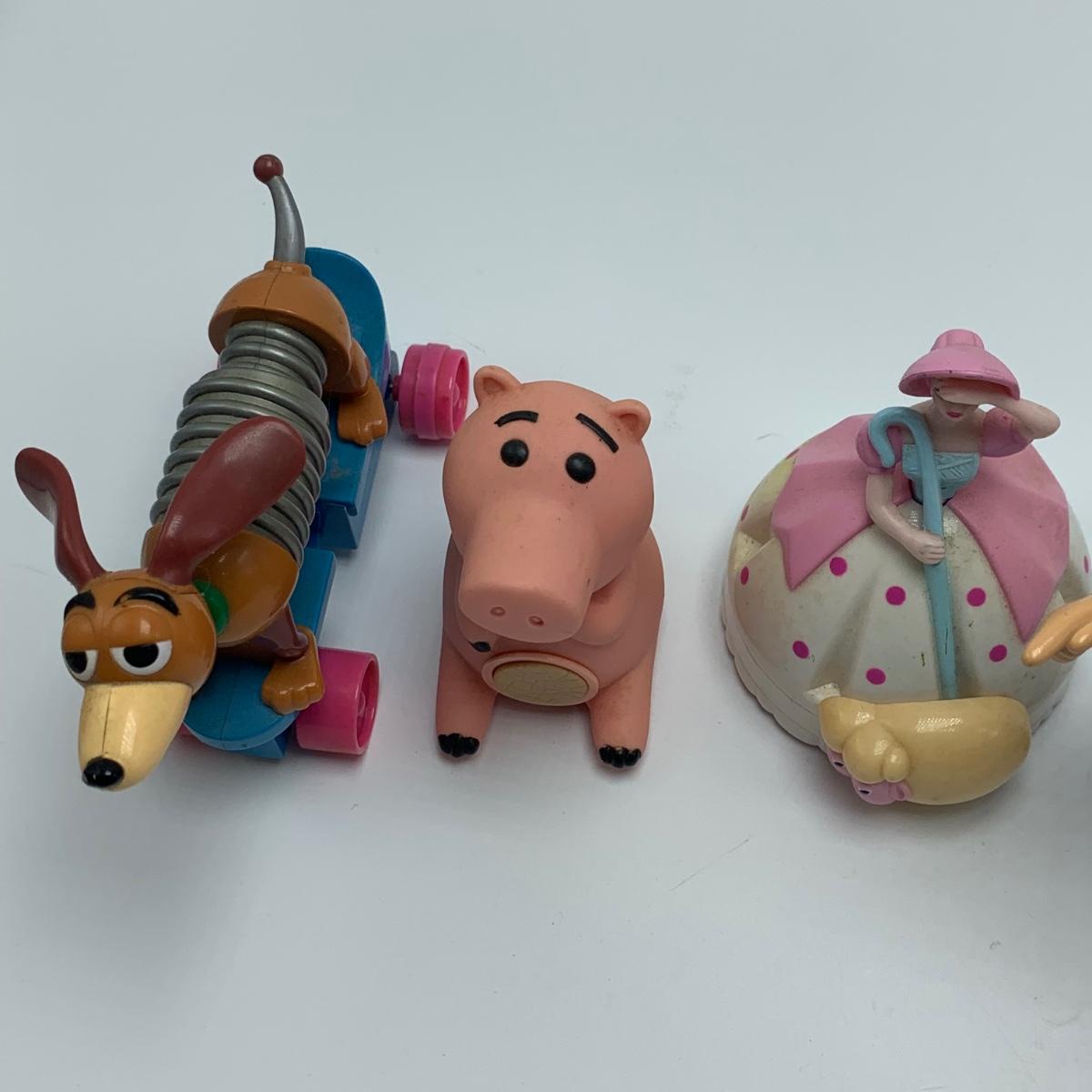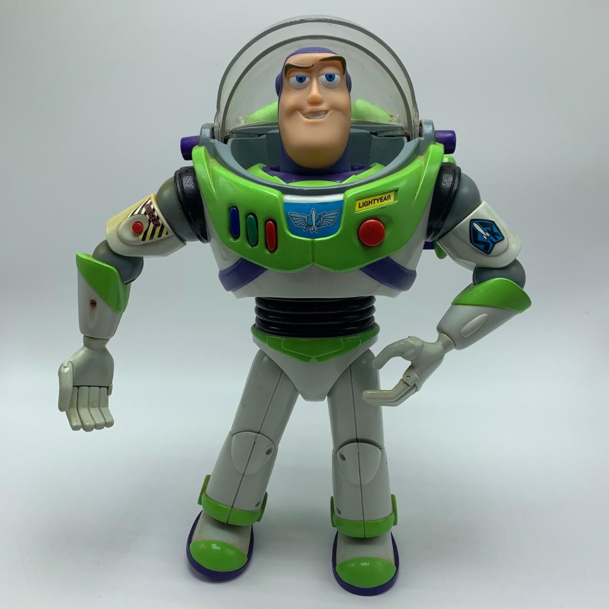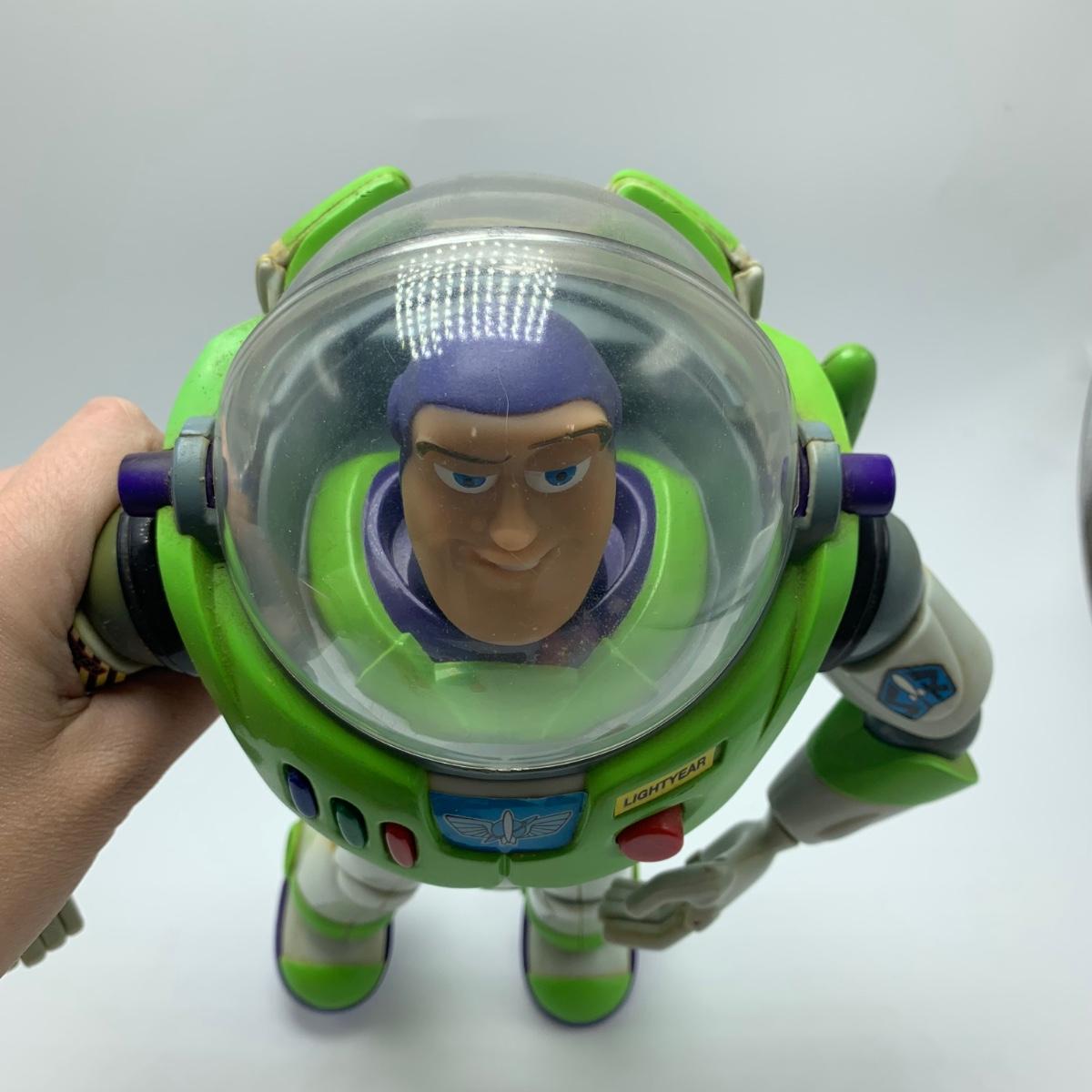Three big and six small Toy Story character toys and figurines. All are plastic except Woody’s body is plush and fabric. The electronic toys did not function when tested and likely need their batteries replaced. The tallest item is Buzz Lightyear at 12.5” tall and the smallest is the alien at 2.5” tall.