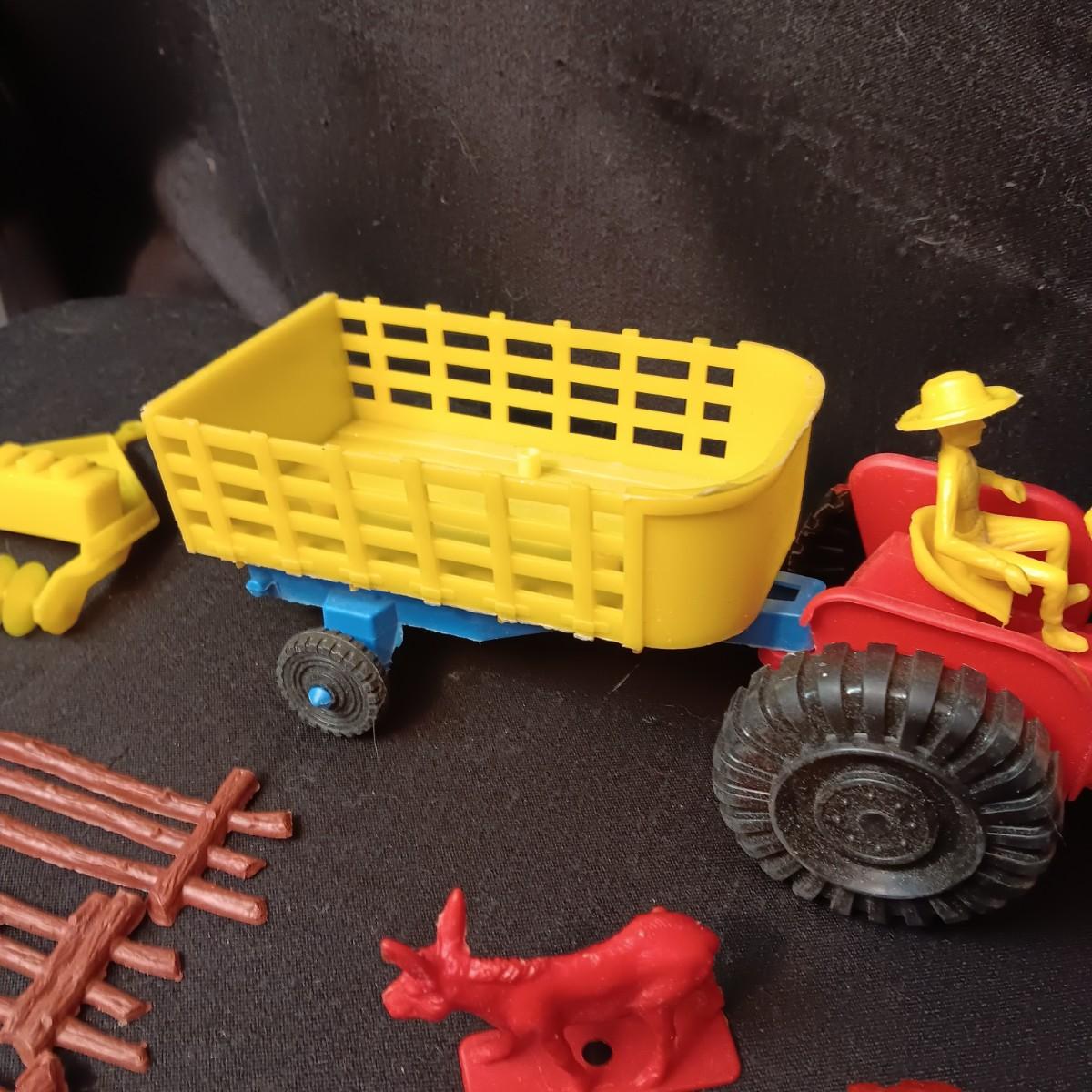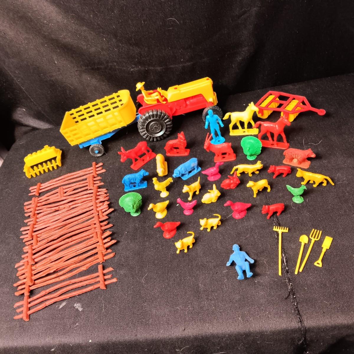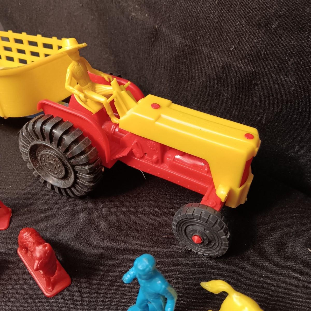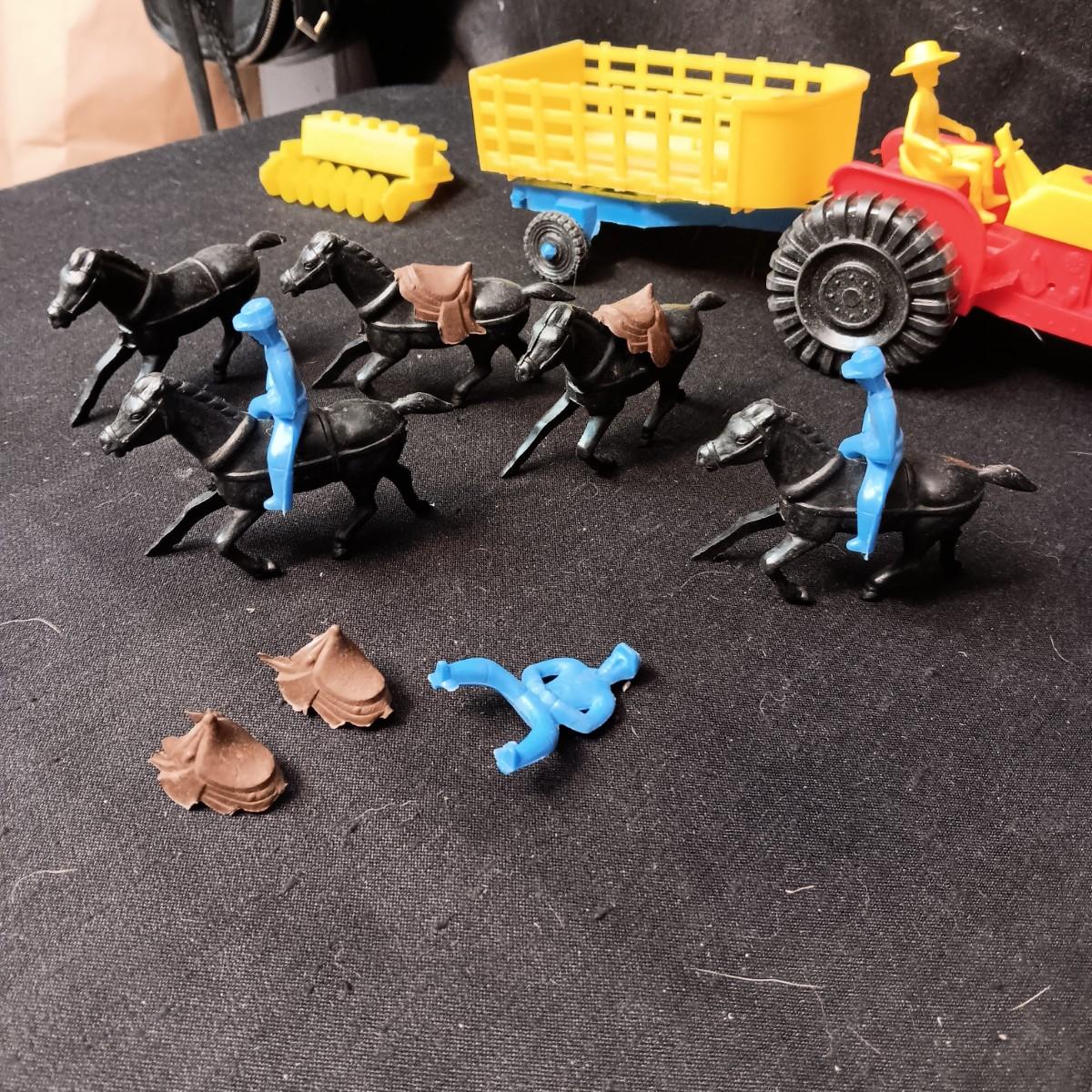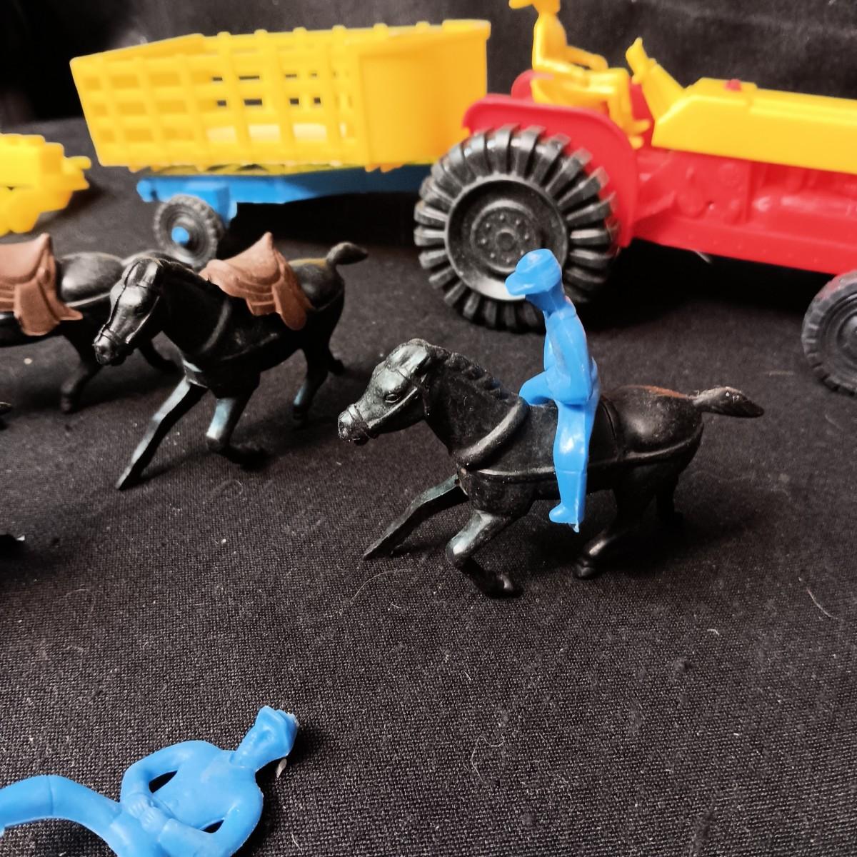 TOY TRACTOR W/IMPLEMENTS, FARM ANIMALS WITH FENCING AND HORSES WITH COWBOYS