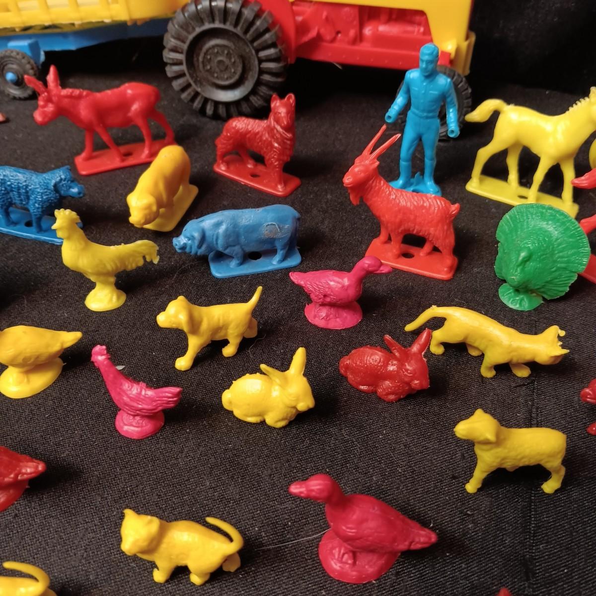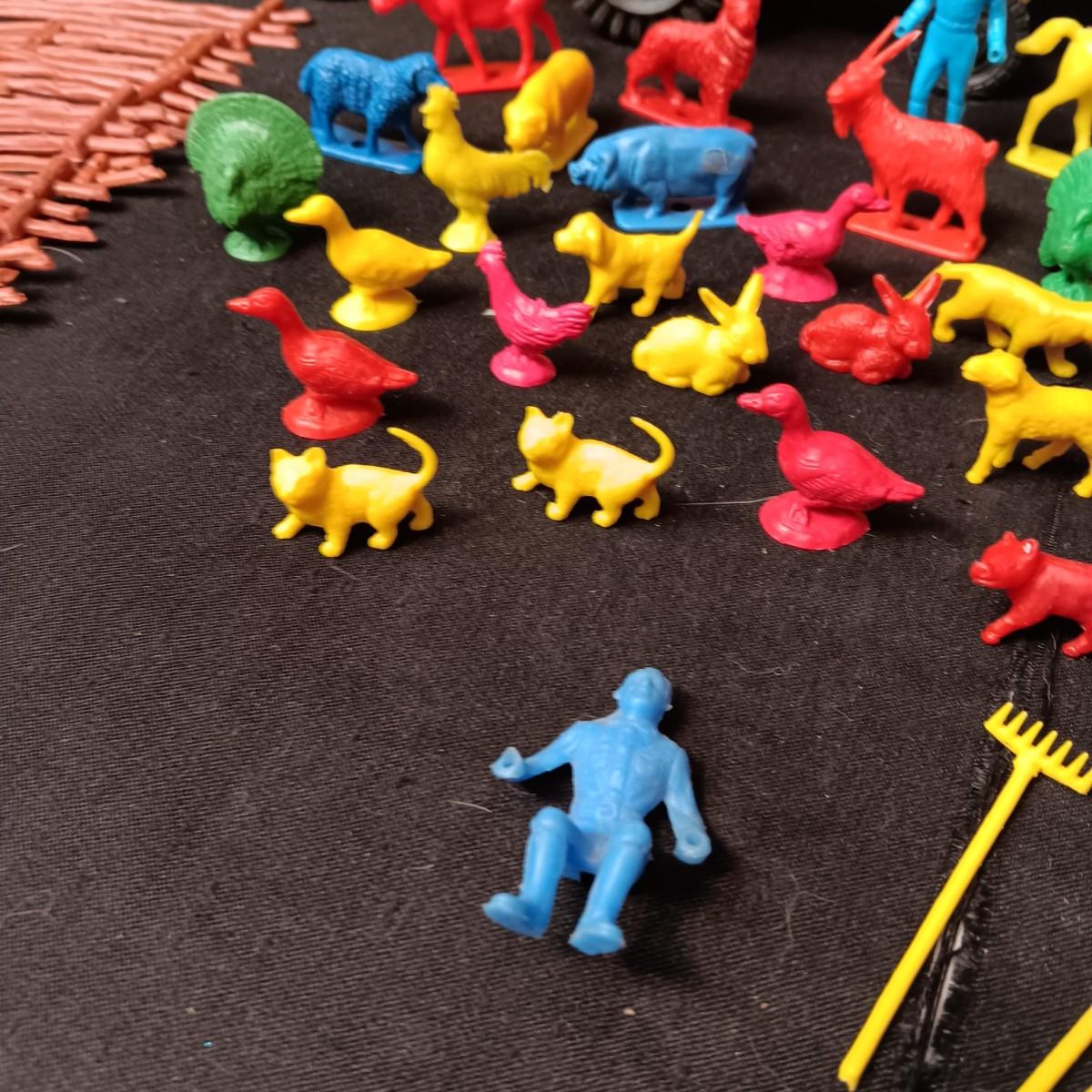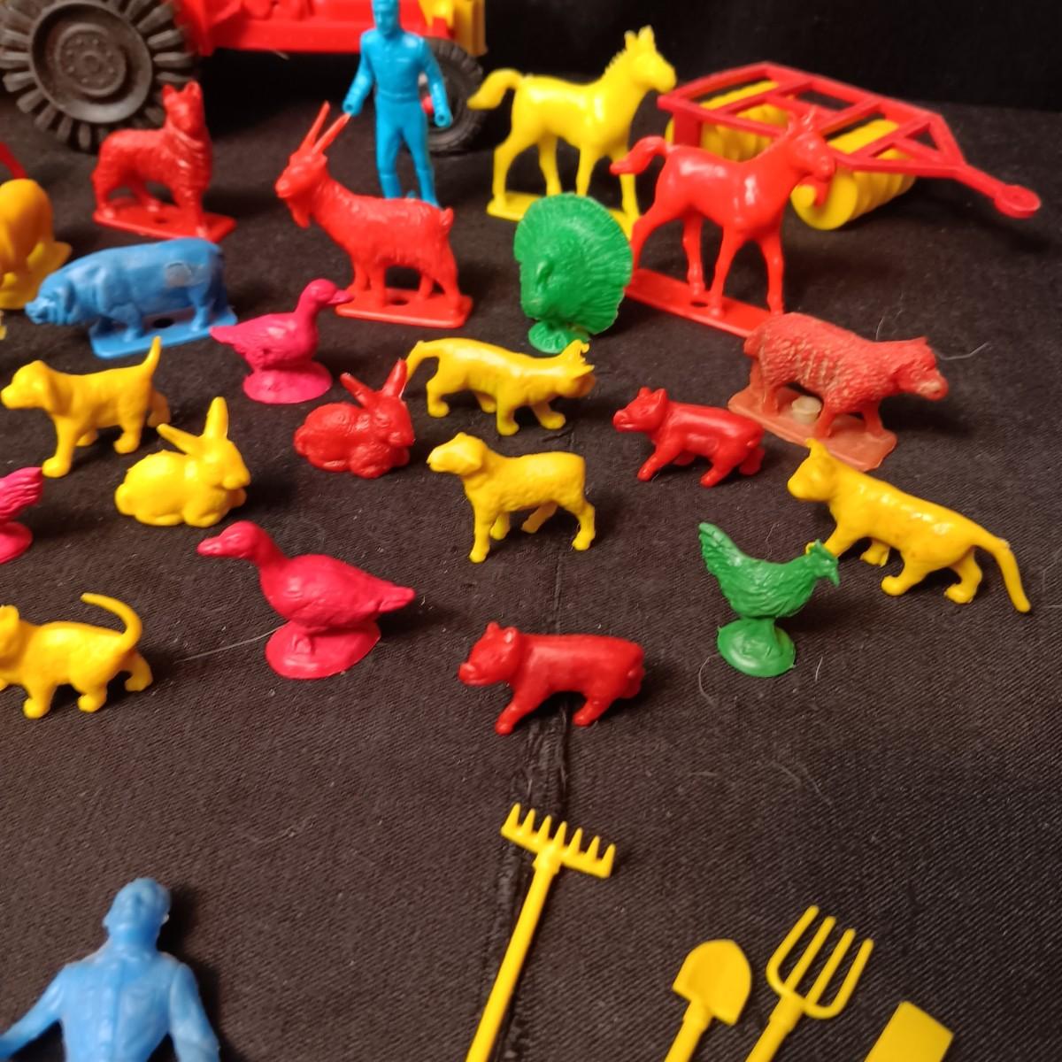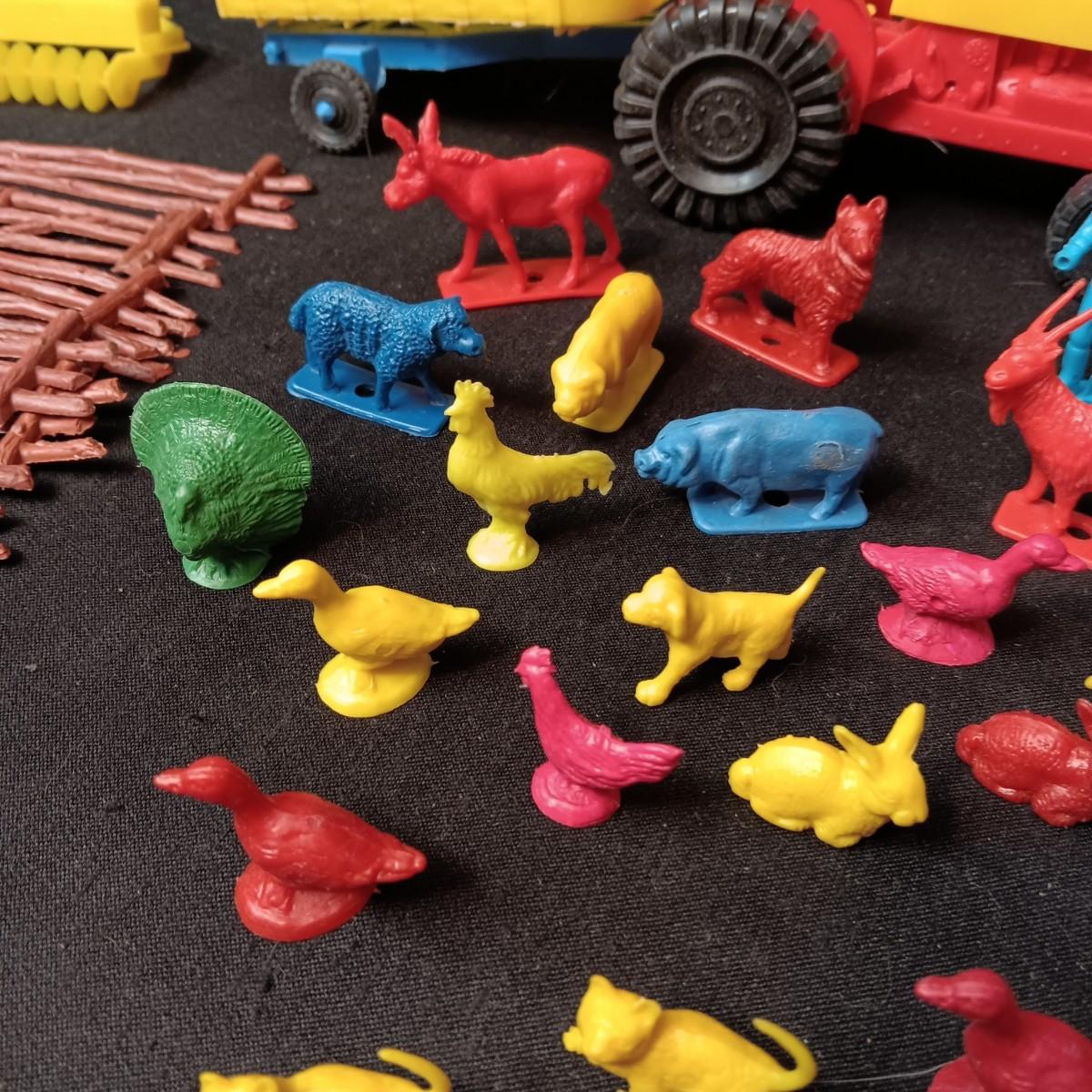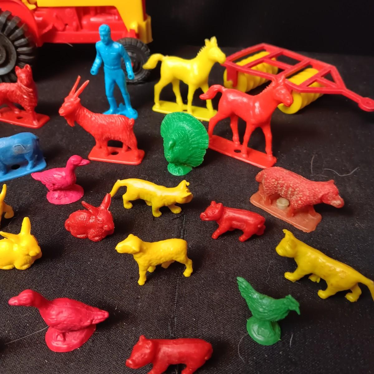 TOY TRACTOR W/IMPLEMENTS, FARM ANIMALS WITH FENCING AND HORSES WITH COWBOYS