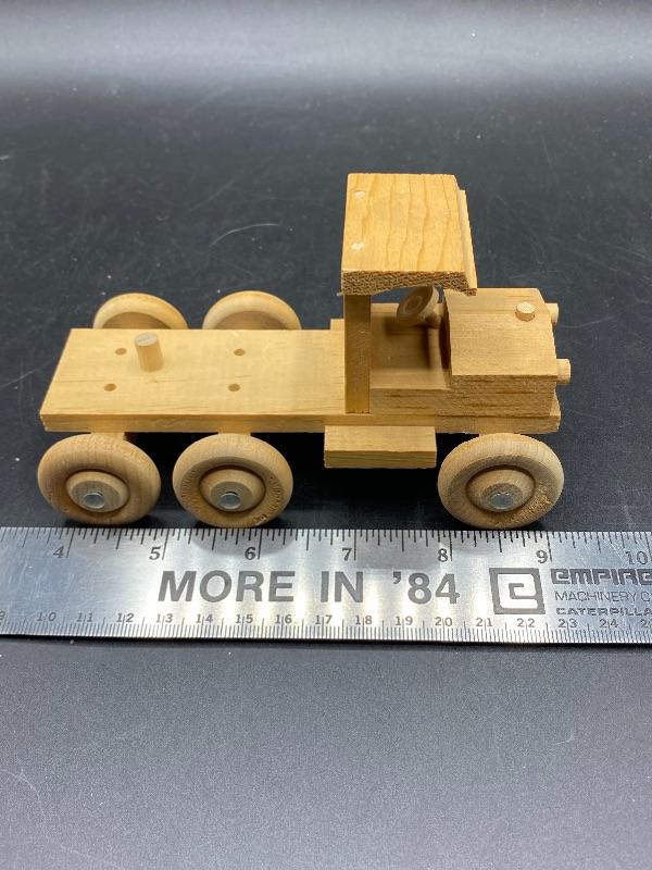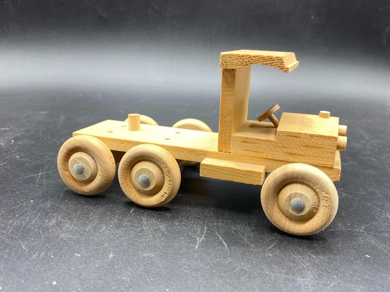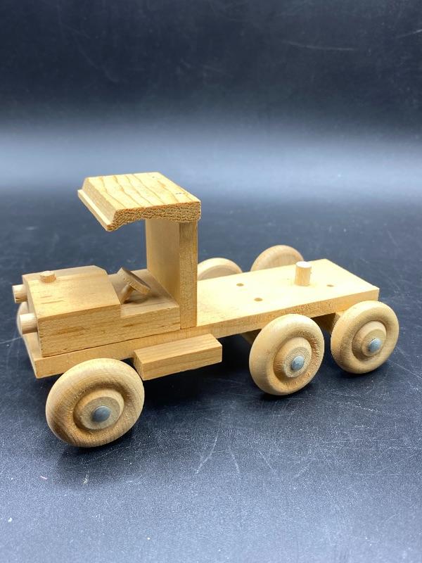 Toy wood truck. Unfinished wood. Wheels turn easily.