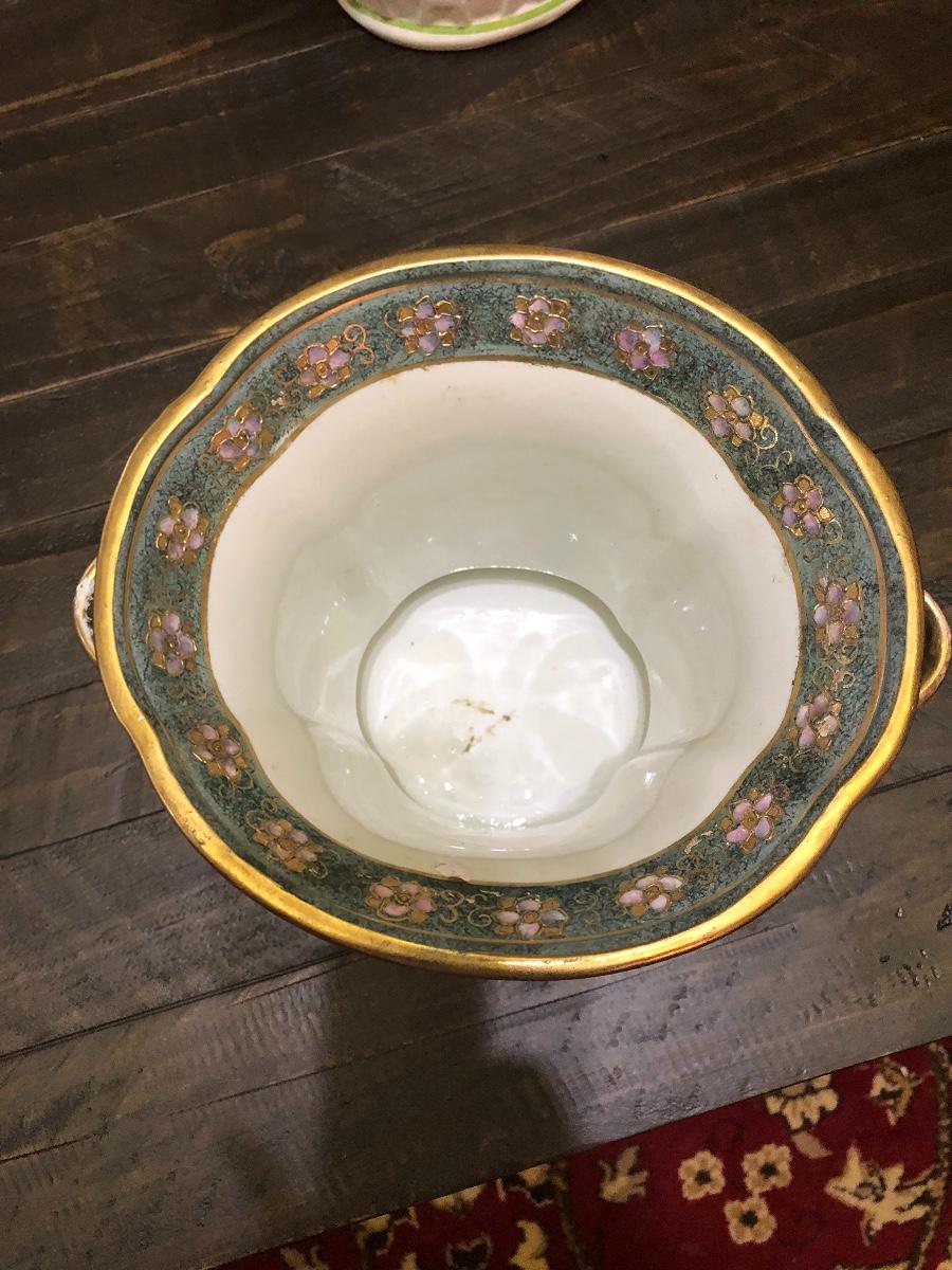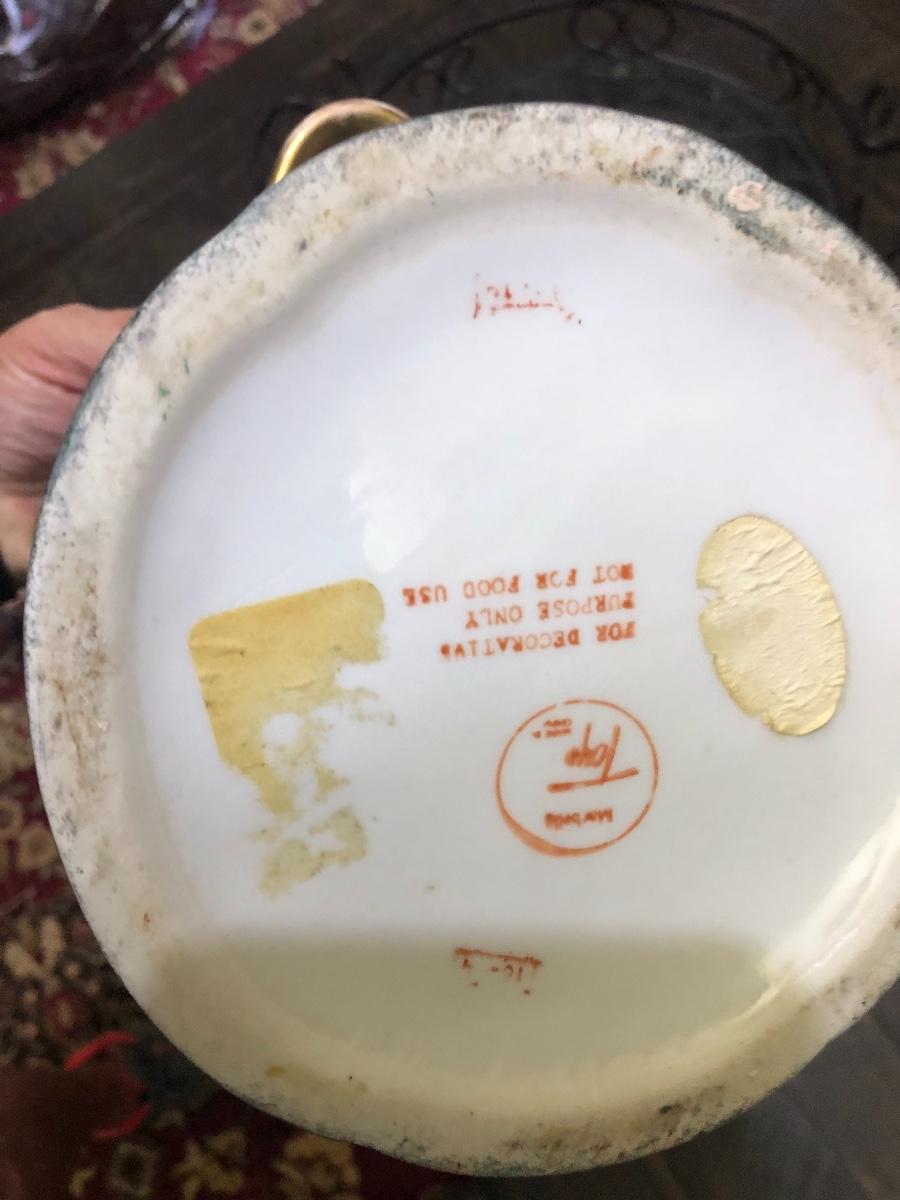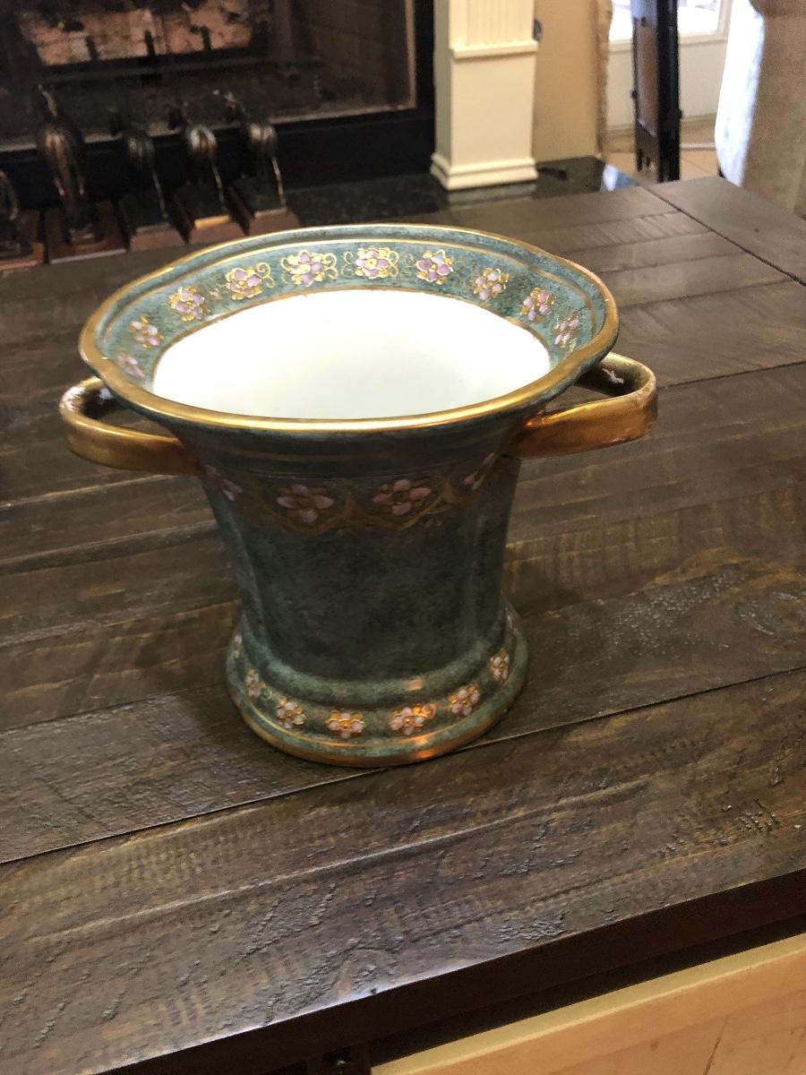 This toya vase is green with flowers and gold accents. It measures 7” high