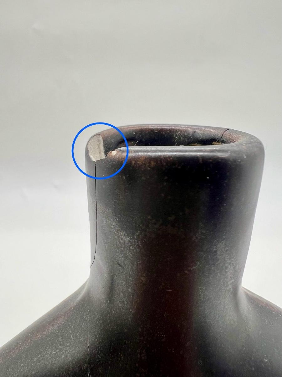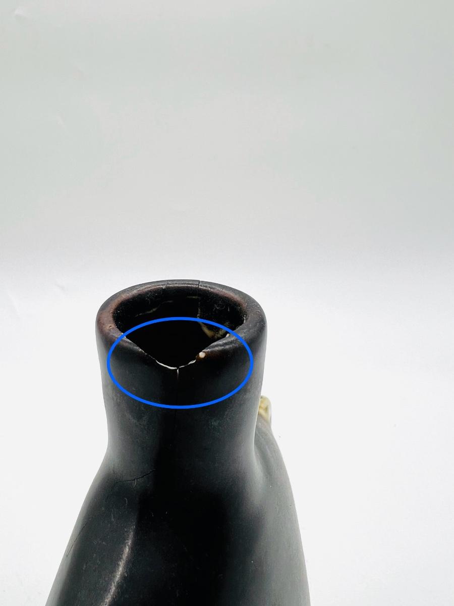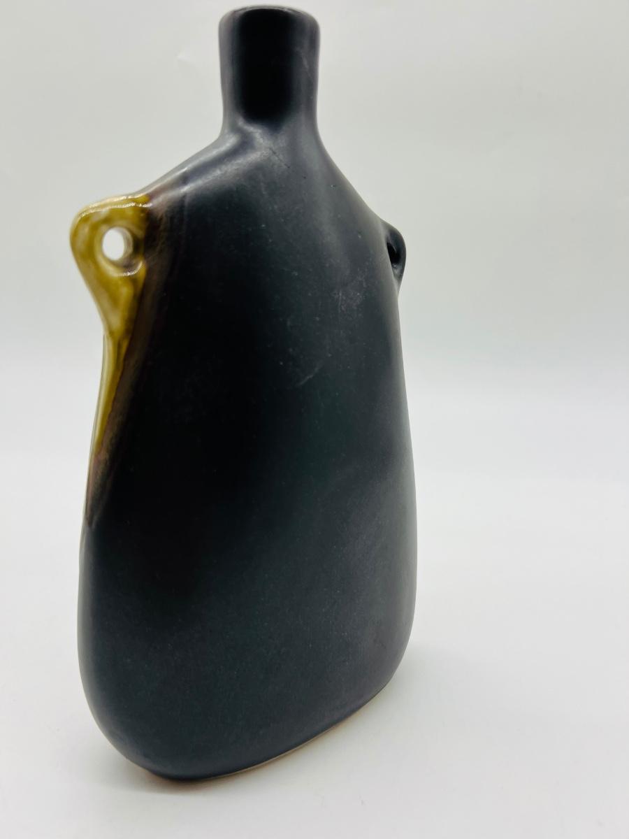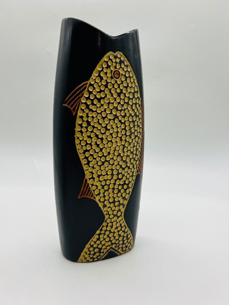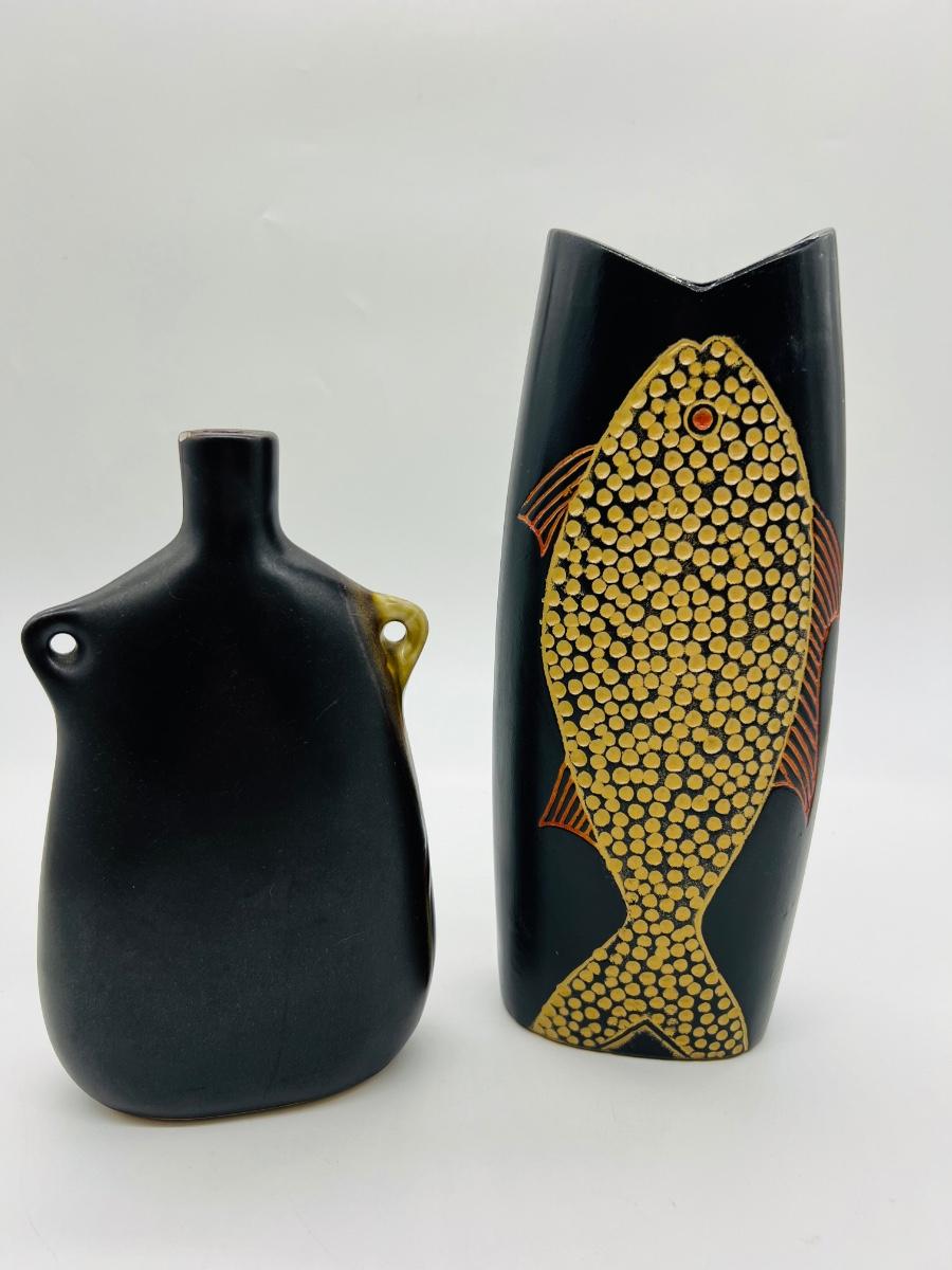 Etched fish pottery vase measures 11 1/2 inches tall and 5 inches wide. TOYO Vase measures 9 inches tall and 5 1/2 inches wide. Small chip noted on the TOYO vase, see pictures.