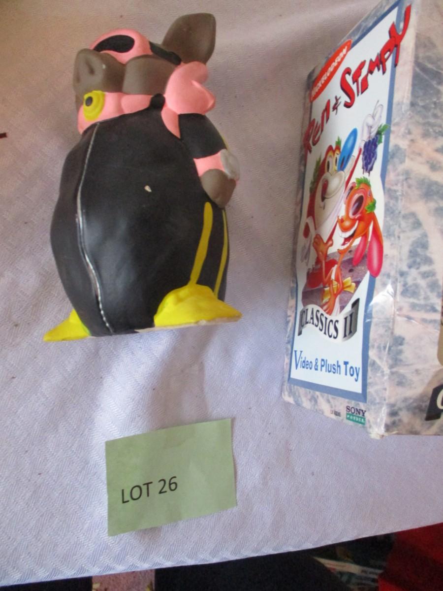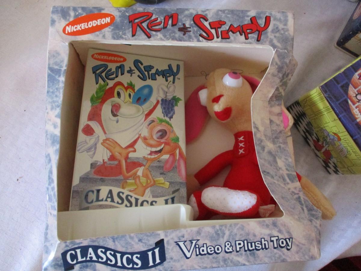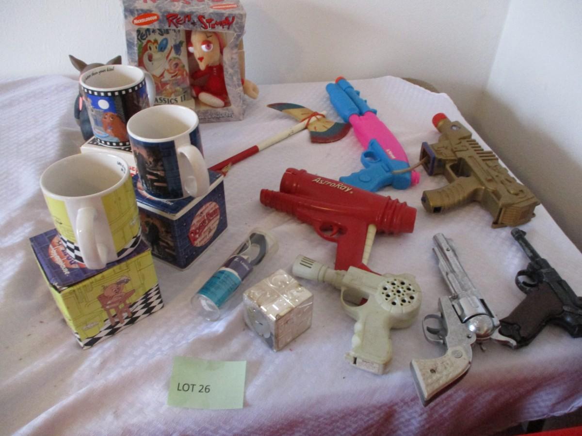 Mugs, Ren & Stimpy Video & Plush Toy. Wooden Tomahawk. Astro Ray. Western Pistol. Goggles. Money Banks. Ceramic Picg. Plastic Water Gun.