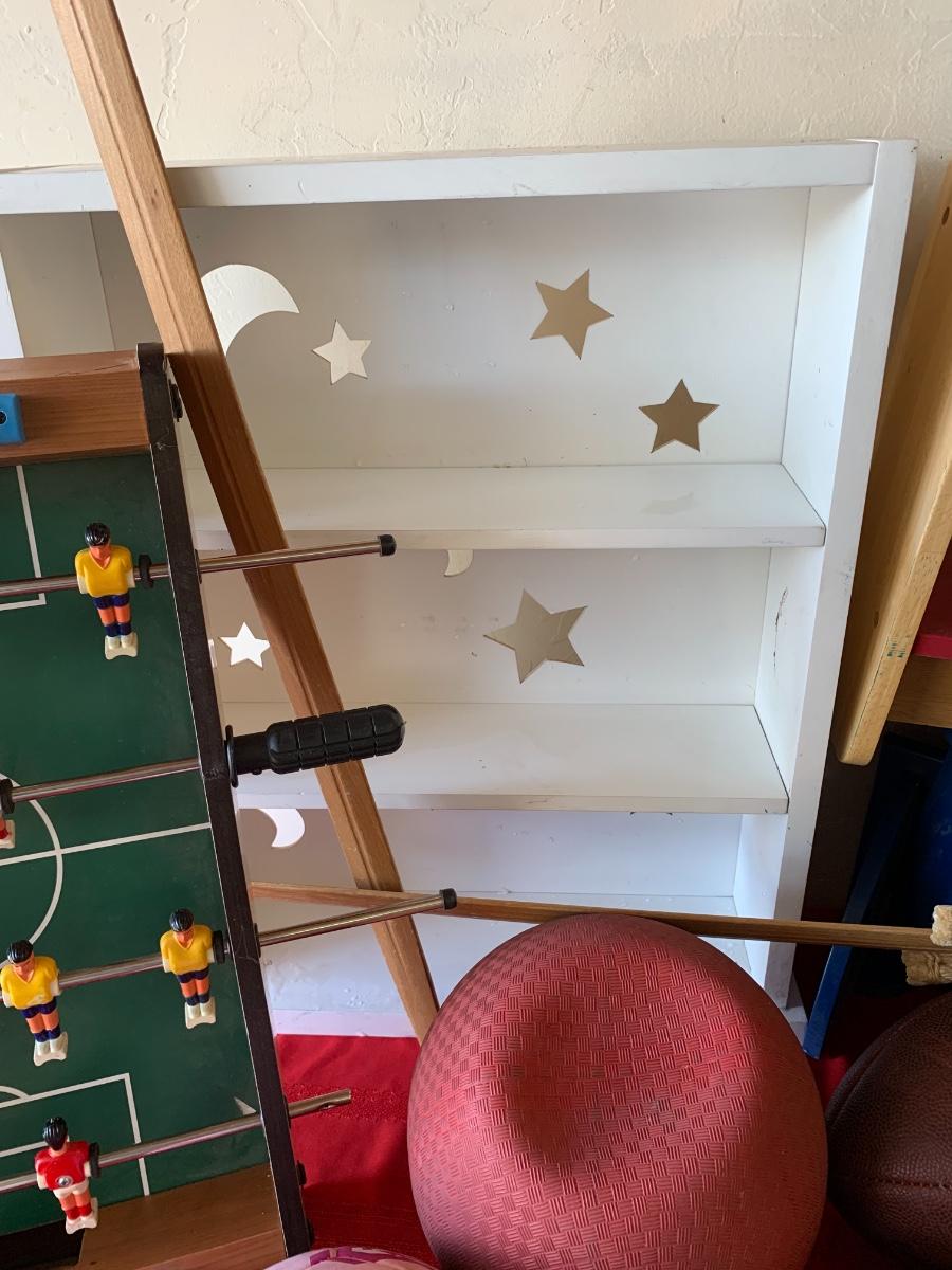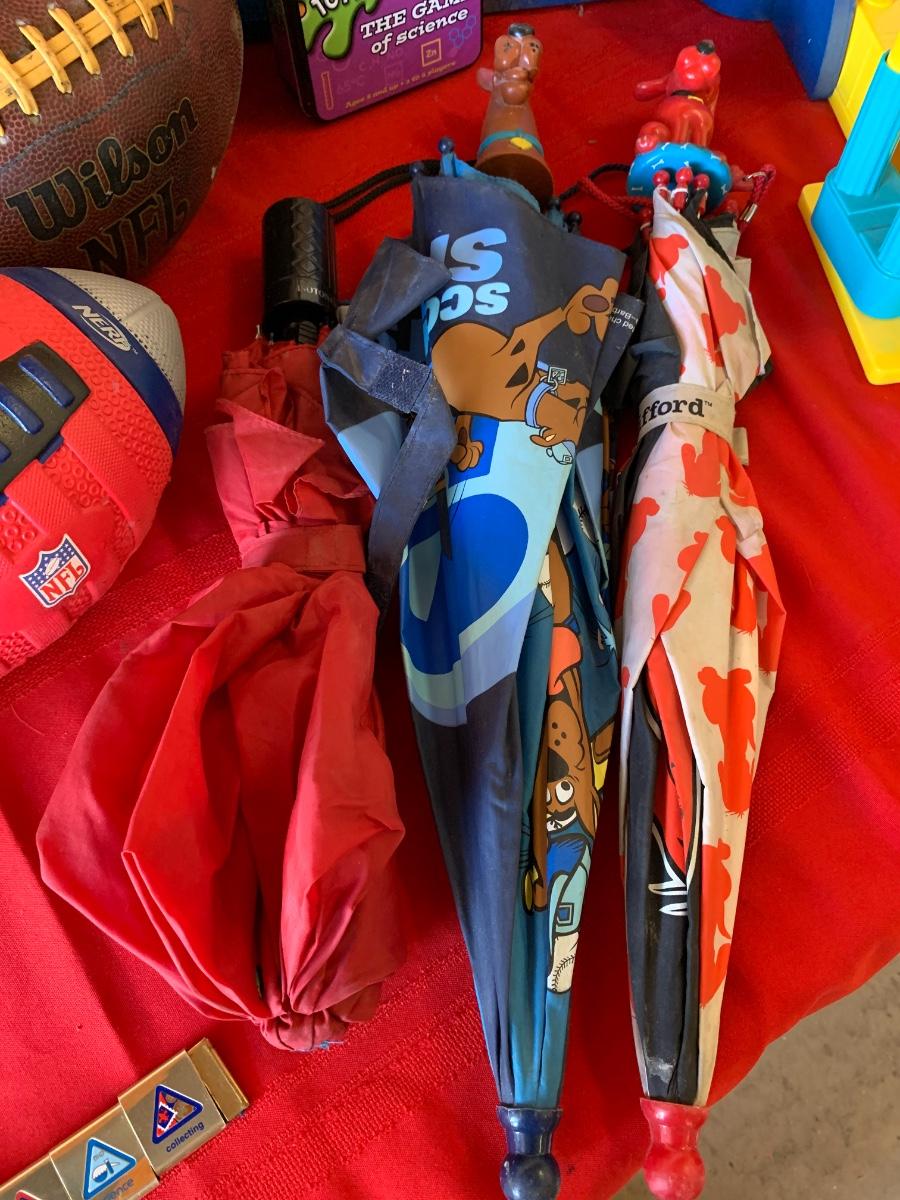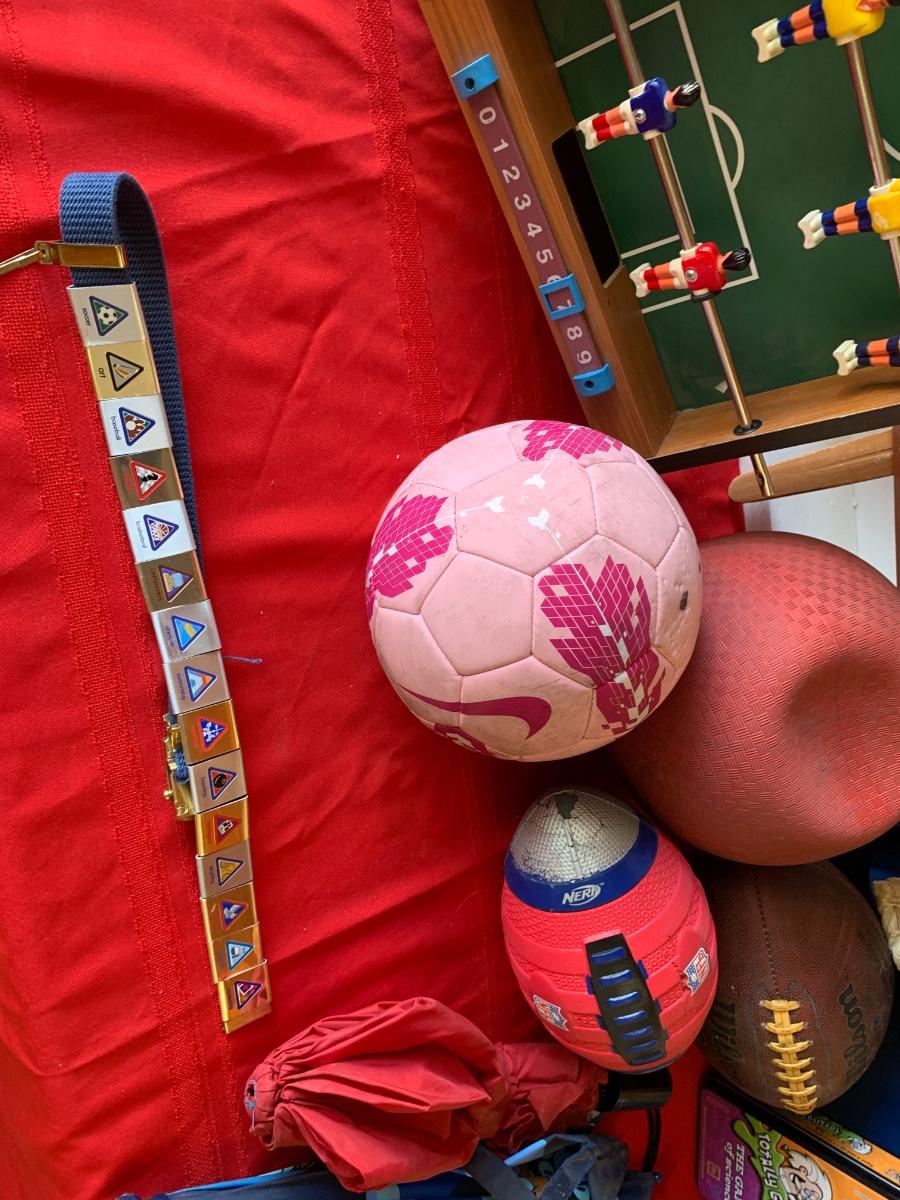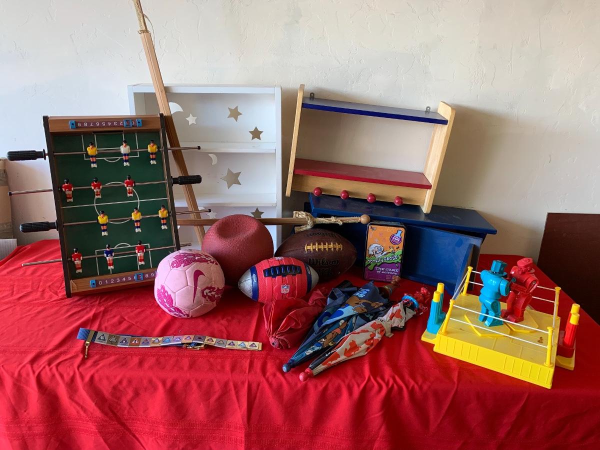 Children’s toys including a mini foosball table, shelving, deflated football/soccerballs, children umbrellas, card games and a rock em sock em game. All in good condition