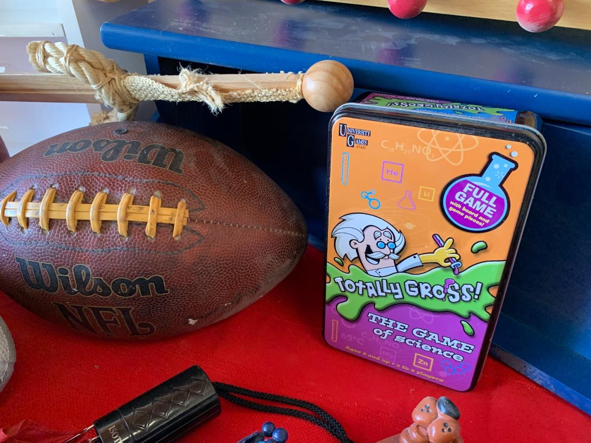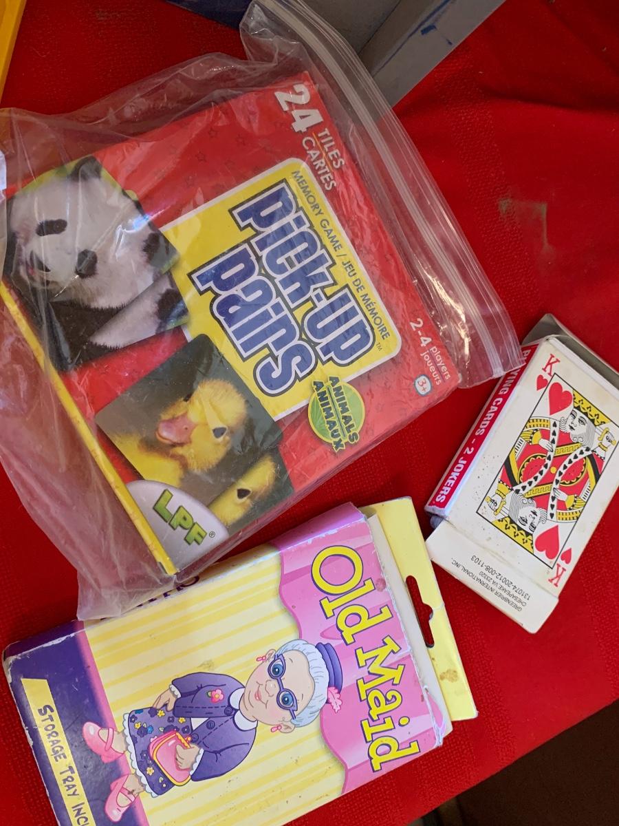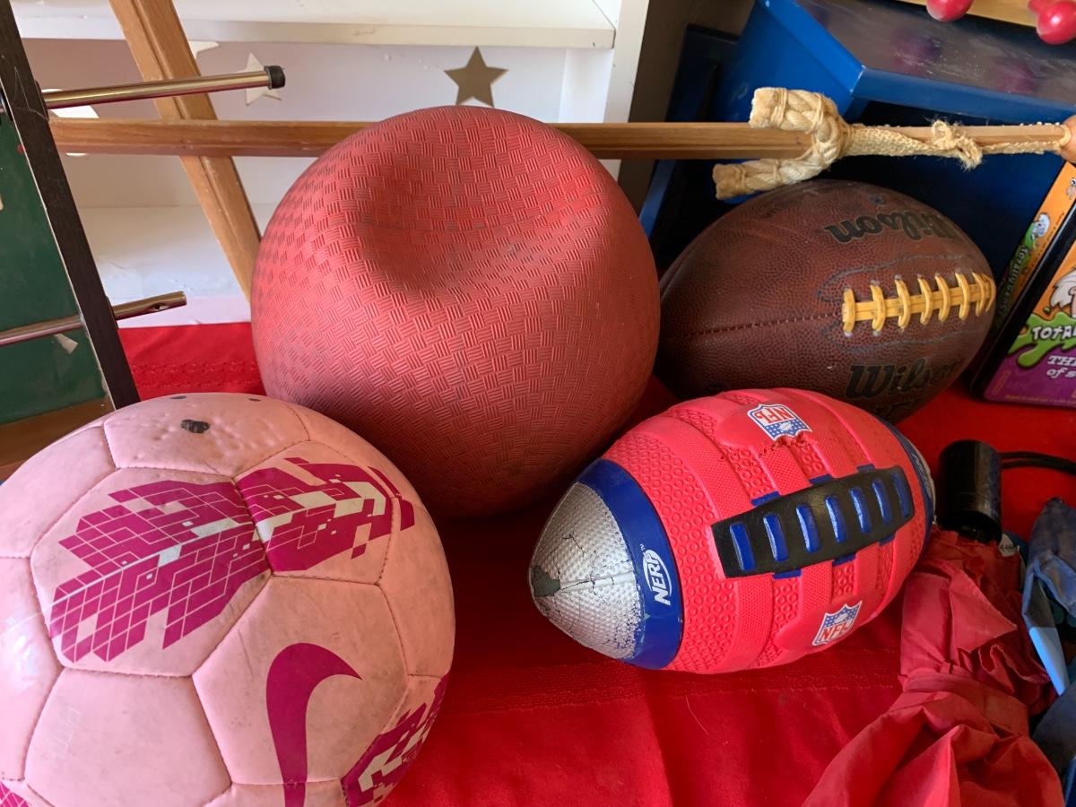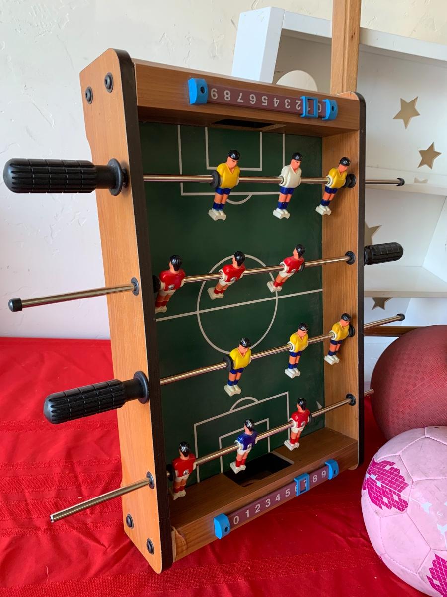 Children’s toys including a mini foosball table, shelving, deflated football/soccerballs, children umbrellas, card games and a rock em sock em game. All in good condition