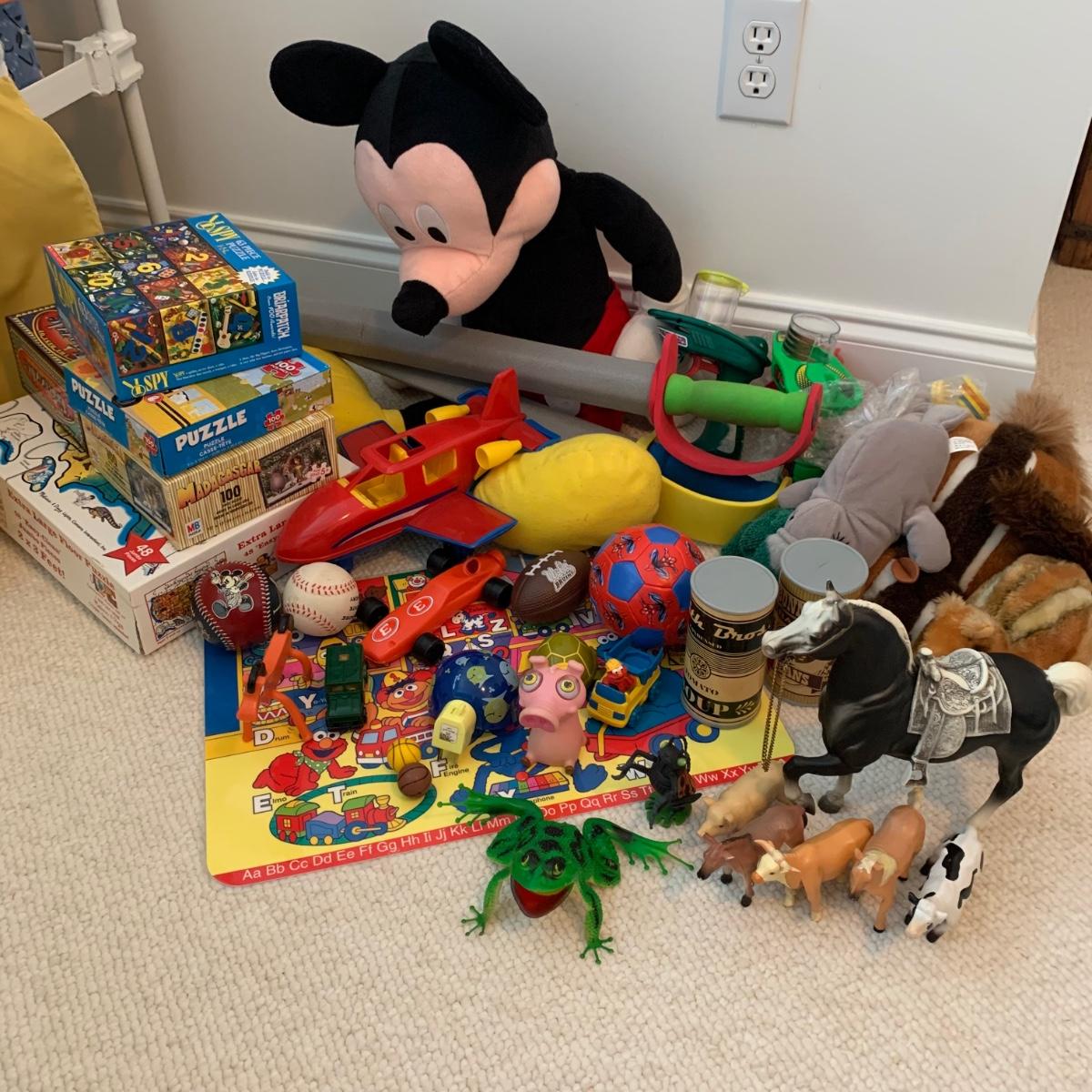 Fun selection of toys for the little ones. Included is a Breyer horse and collection of small barnyard animals, foam swords, five puzzles, stuffed animals, and more! For reference, Mickey Mouse is about 30”H. Please see photos for inventory and details.