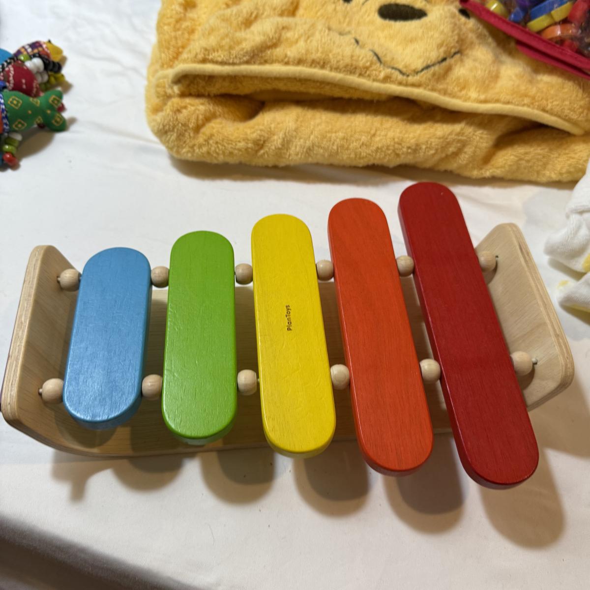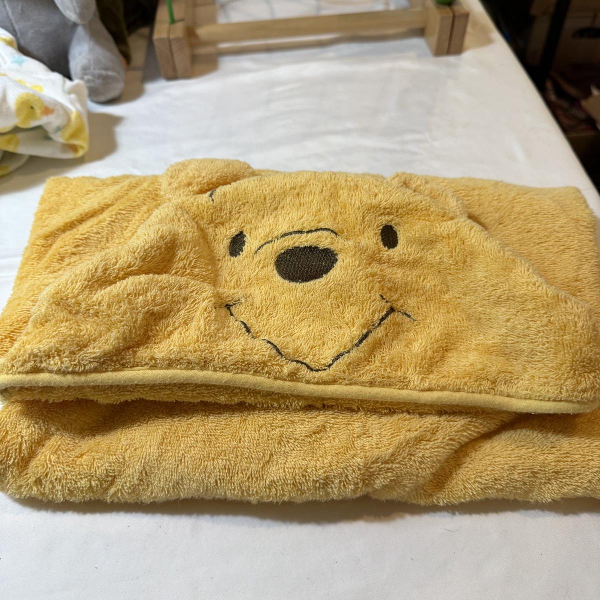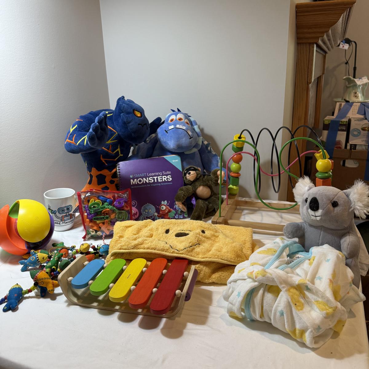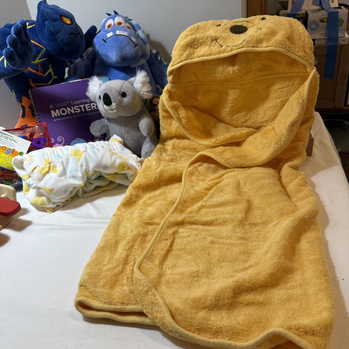 This lot contains some essential baby items. Lot has four stuffed animals, two of which come with a book, a ball, a robot mug, letter magnets, a wooden toy xylophone, a fish and bell mobile, a little rubber ducky robe and a Winnie the Pooh hooded towel and a wooden bead roller coaster. The bead roller coaster measures 12” x 10” x 11”H. See pictures for details. Shipping available.