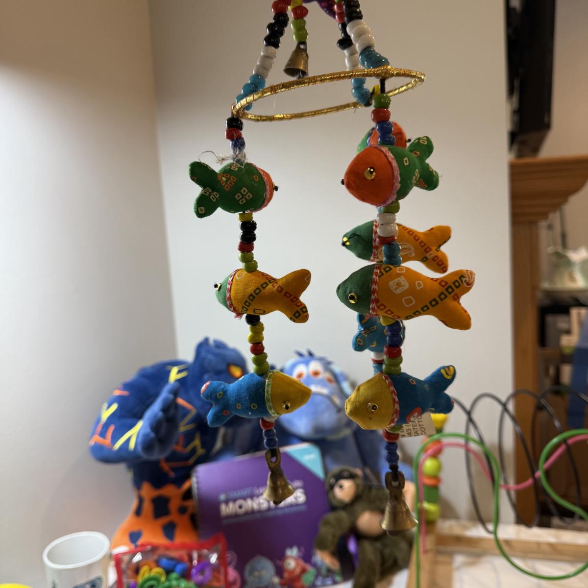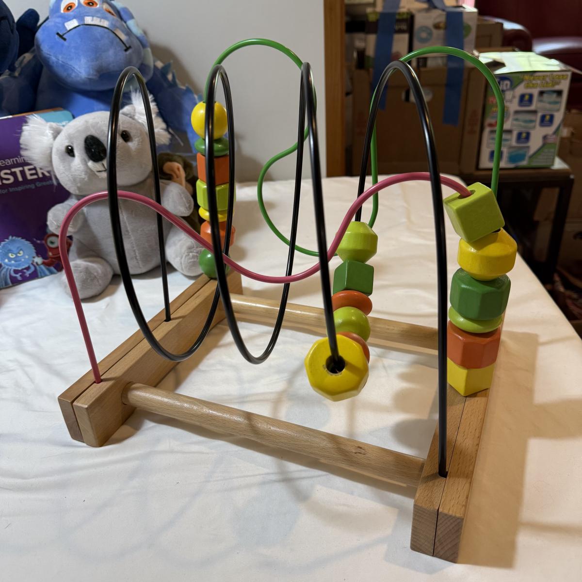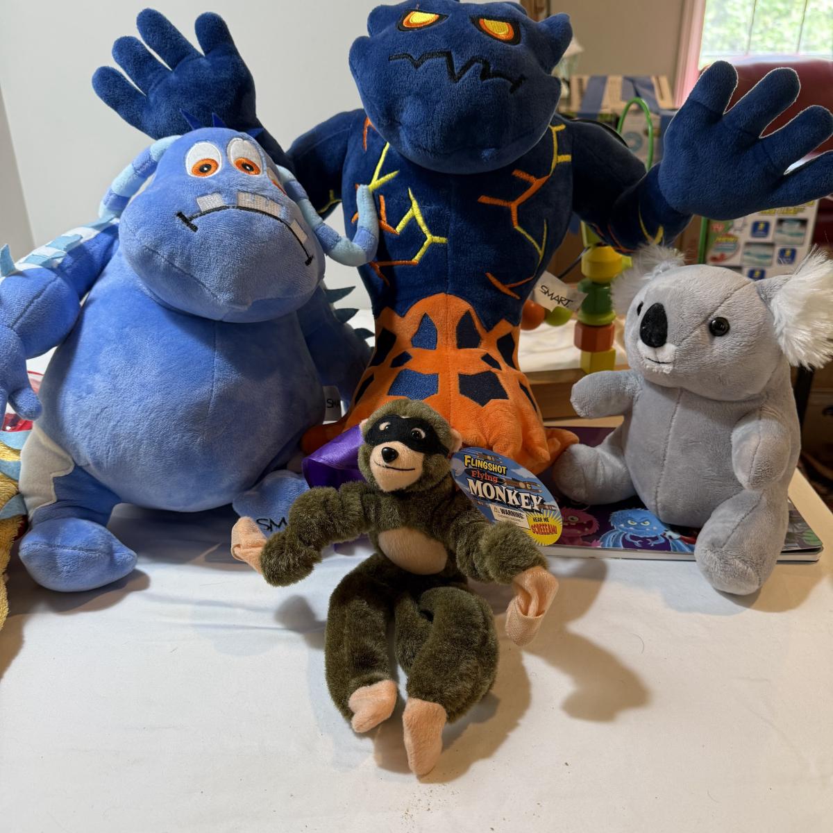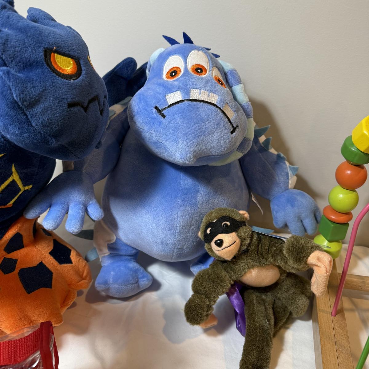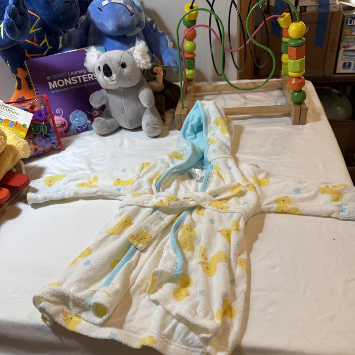 This lot contains some essential baby items. Lot has four stuffed animals, two of which come with a book, a ball, a robot mug, letter magnets, a wooden toy xylophone, a fish and bell mobile, a little rubber ducky robe and a Winnie the Pooh hooded towel and a wooden bead roller coaster. The bead roller coaster measures 12” x 10” x 11”H. See pictures for details. Shipping available.