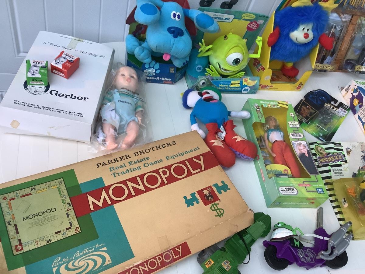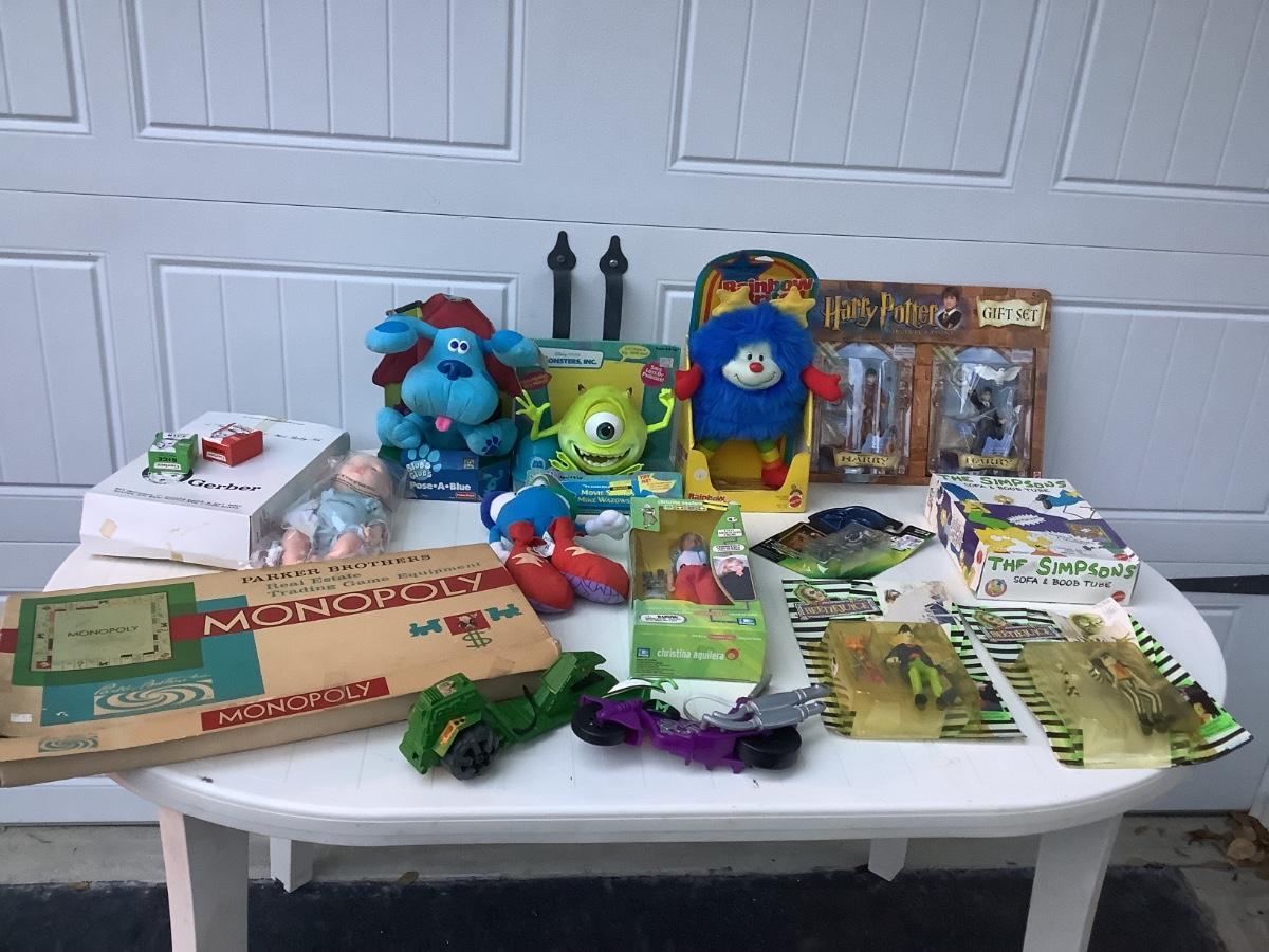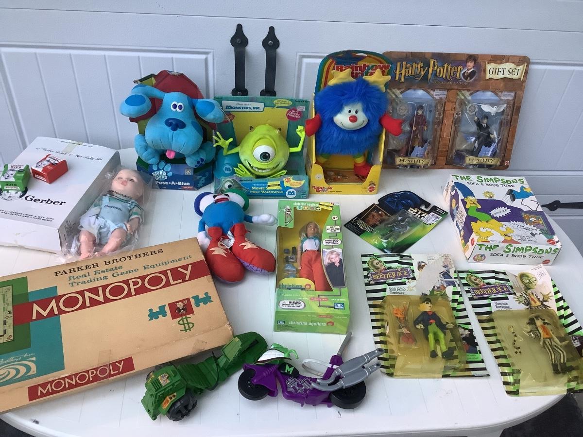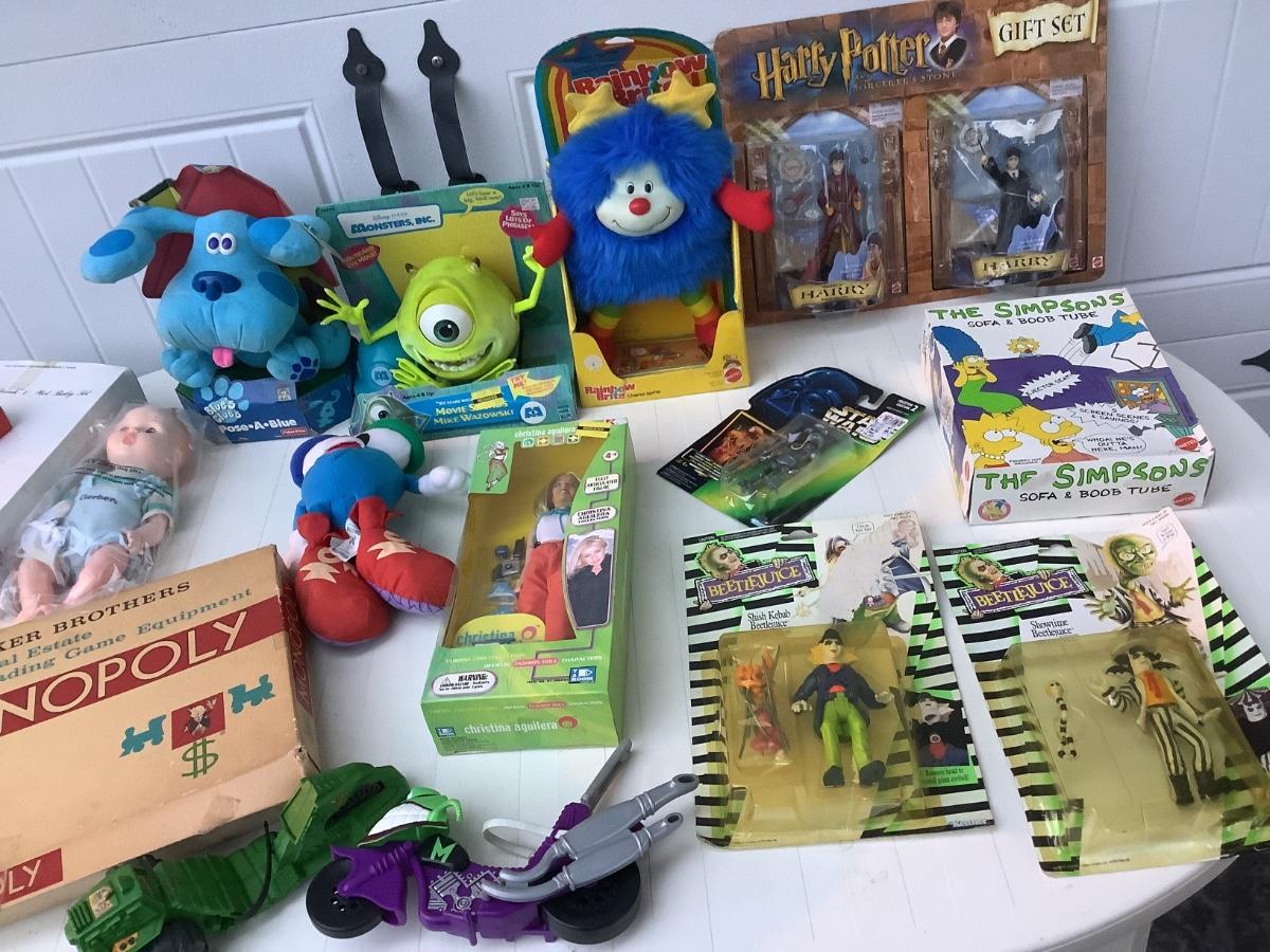 Toys-Rainbow Brite, Gerber baby, Blue's Clues, Monopoly, Monsters Inc, Beetlejuice, Simpsons, Harry Potter, Christina Aguilera