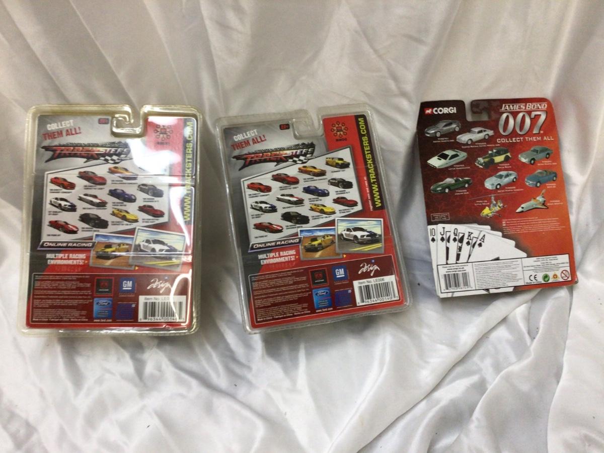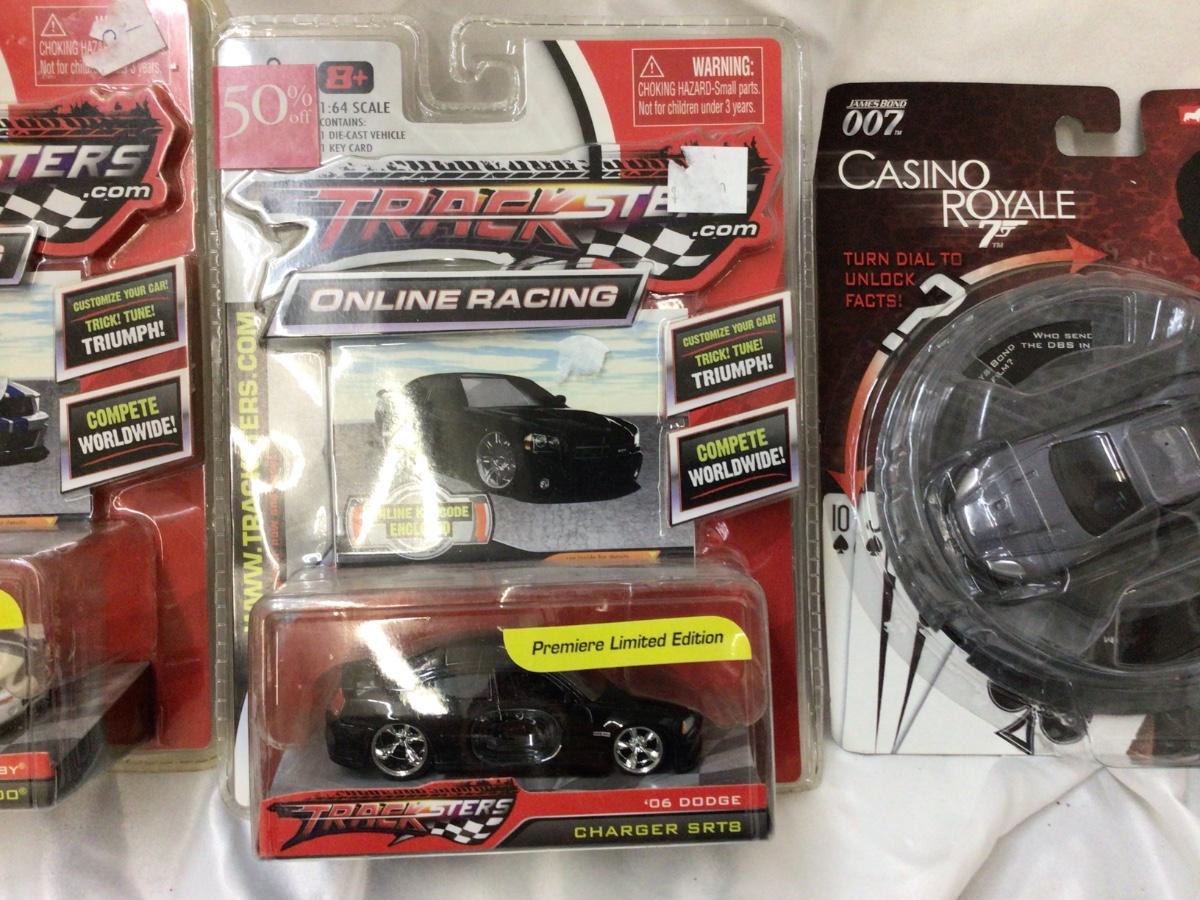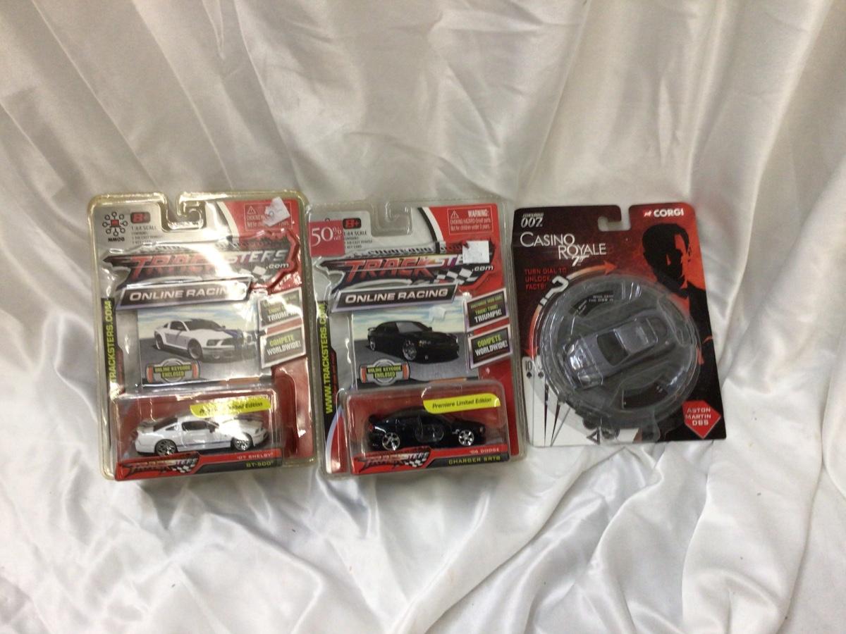 You get two Trackster cars one Dodge Charger the other is GT 500. The Casino Royal car is Aston Martin. All are new in packaging.