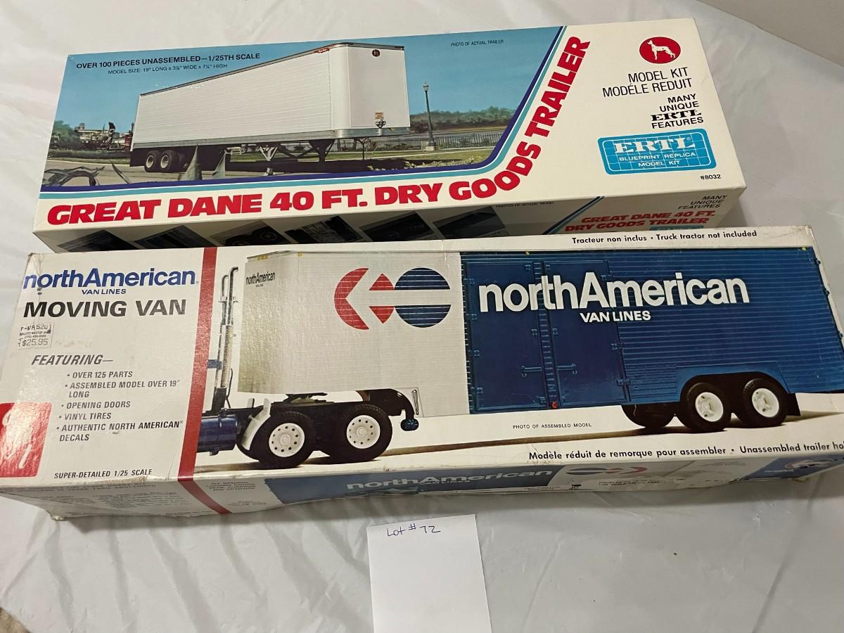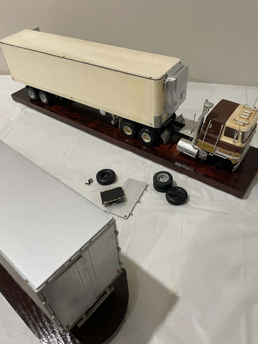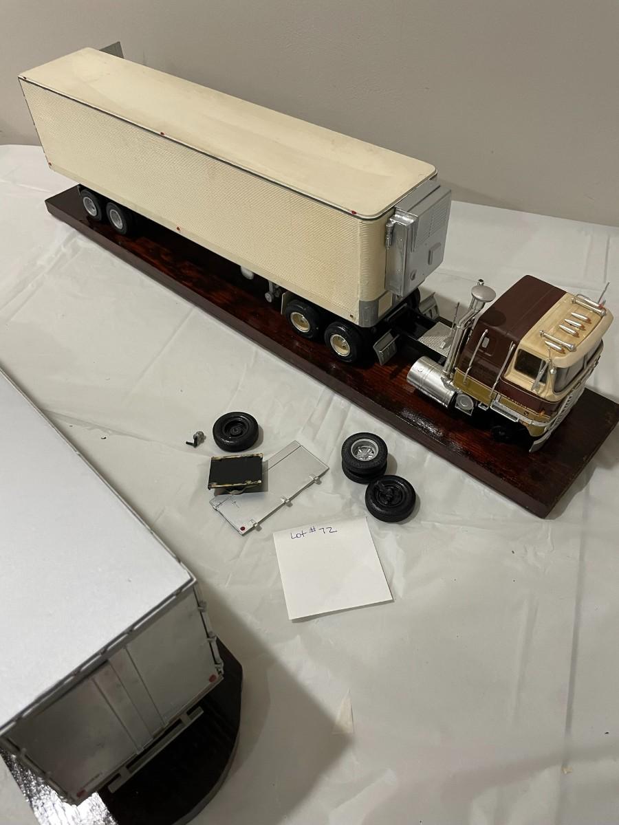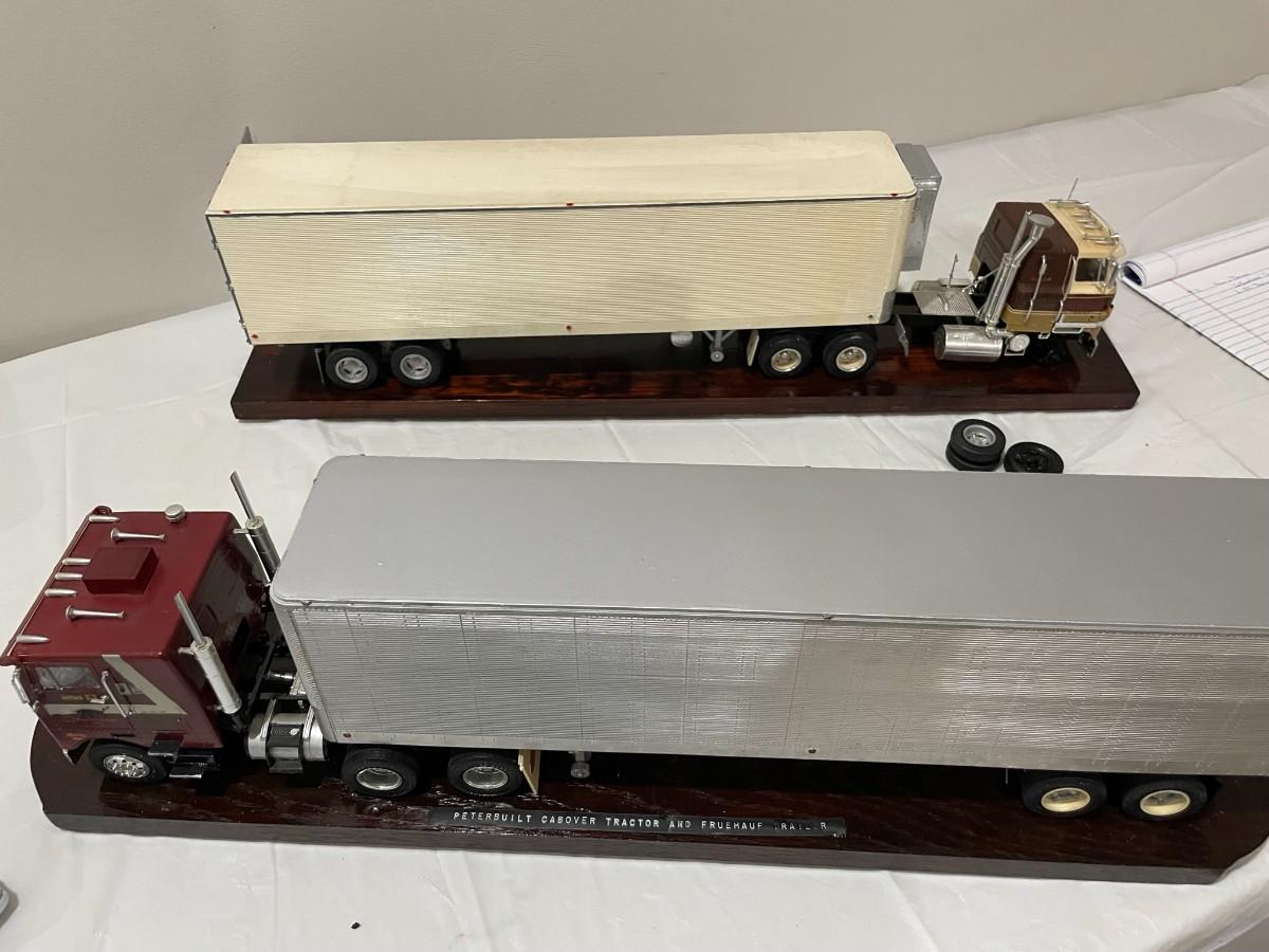 2 Tractor/Trailer Sets mounted on wood (Broken or Missing pieces), 2 Model Trailer Kits (New)