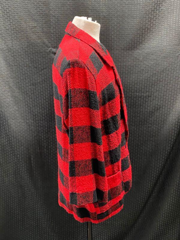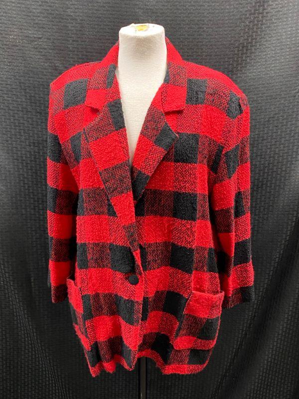 Tracy Evans woman's blazer. Textured red & black checkered plaid. Single button closure, front pockets. Size Large. Good condition, no holes, spots, or snags. May be dusty from storage.