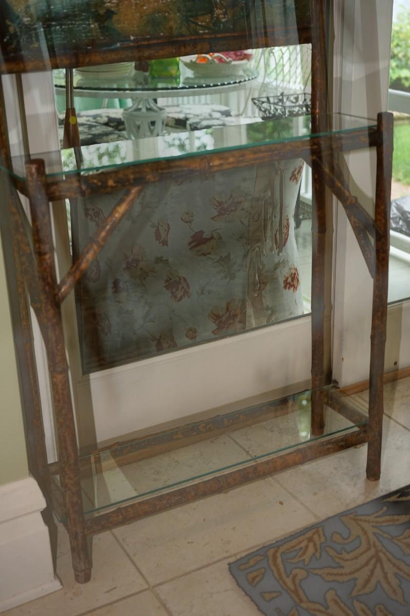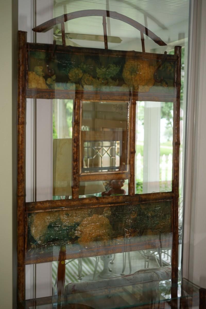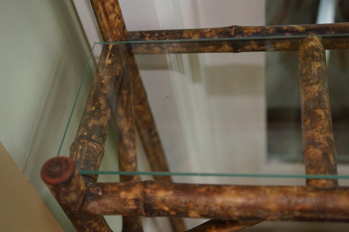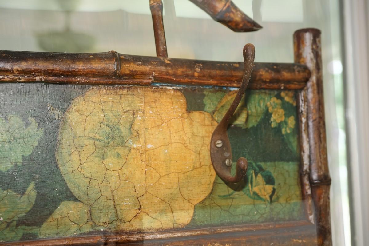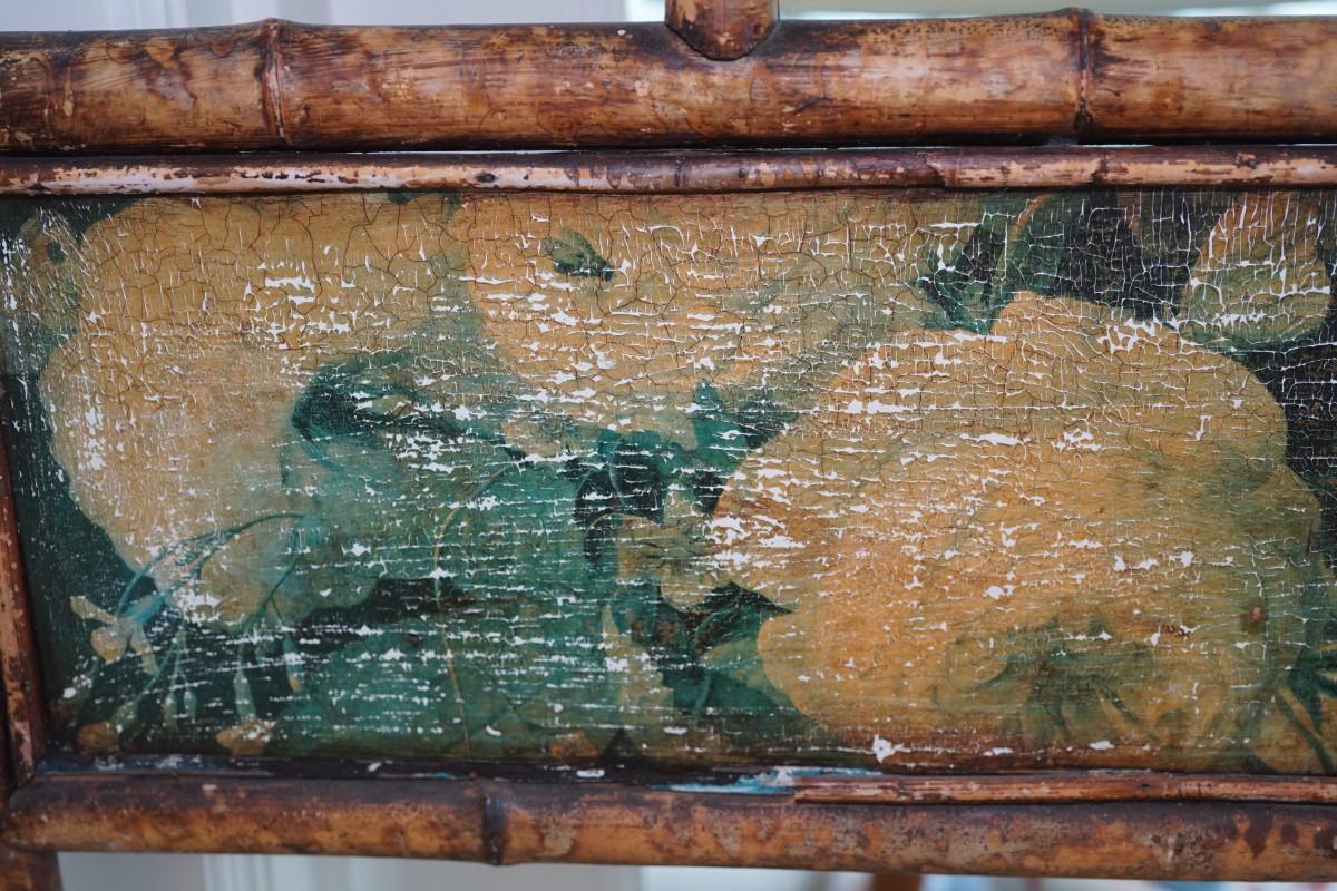 this is antique hall stand of bamboo/ Circa 1890 that was recreated with paintings of flowers Peonies and roses. and glass shelves,