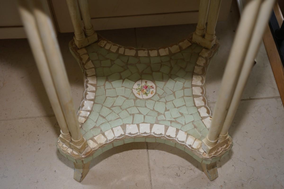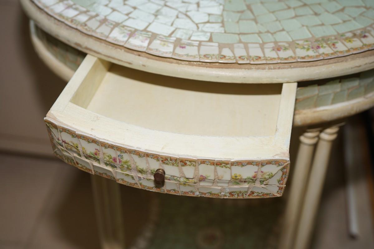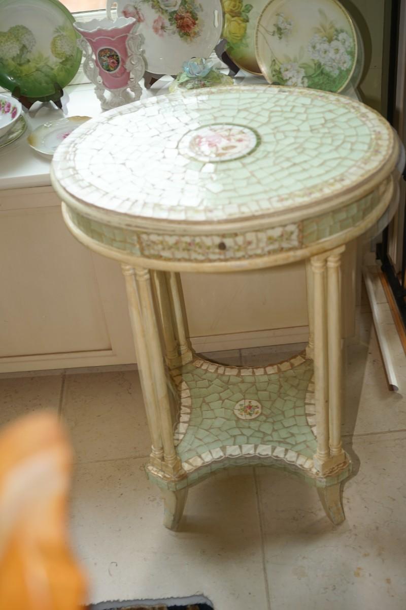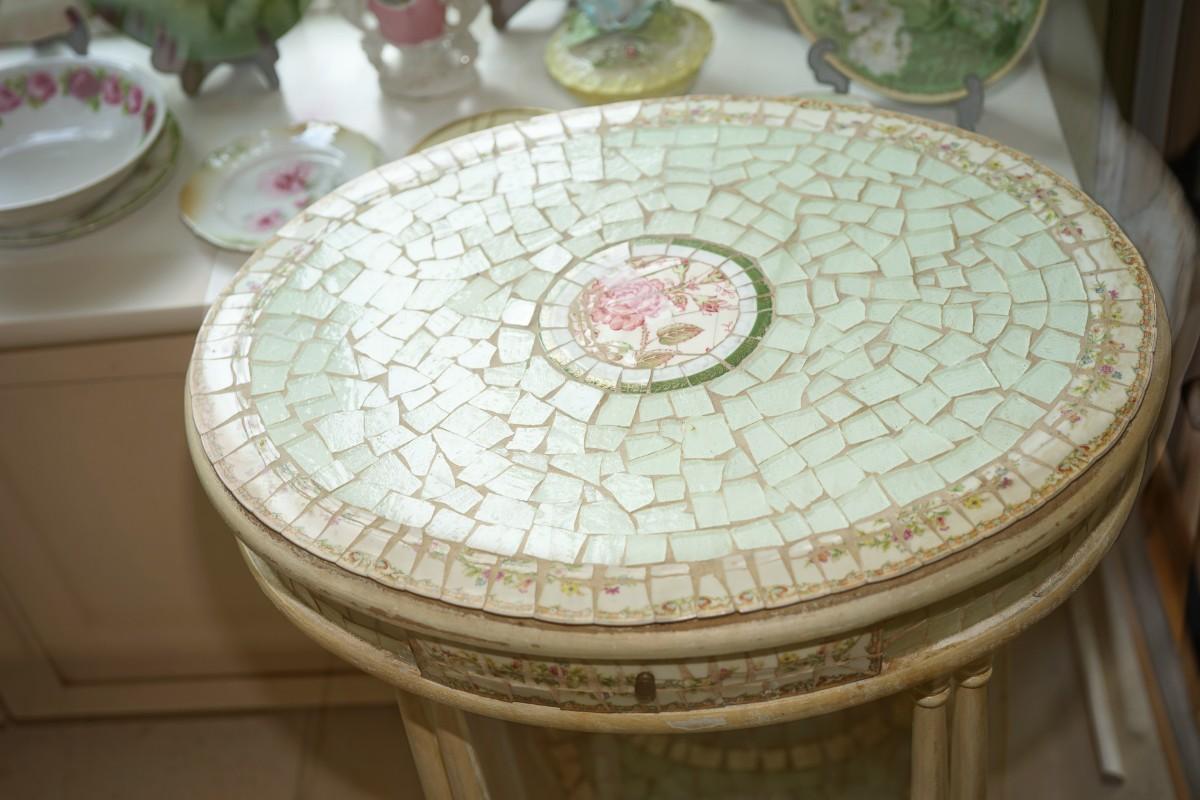 from the popular designer and refurbisher of old to unique this table is a one of the popular designs of Tracy Porter. The oval top table of a small top drawer and lower shelf has been decorated with soft green colored mosaic ceramic pieces and centered with circles of white and rosebuds