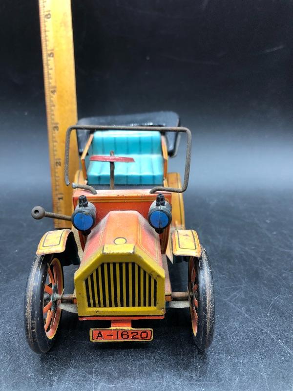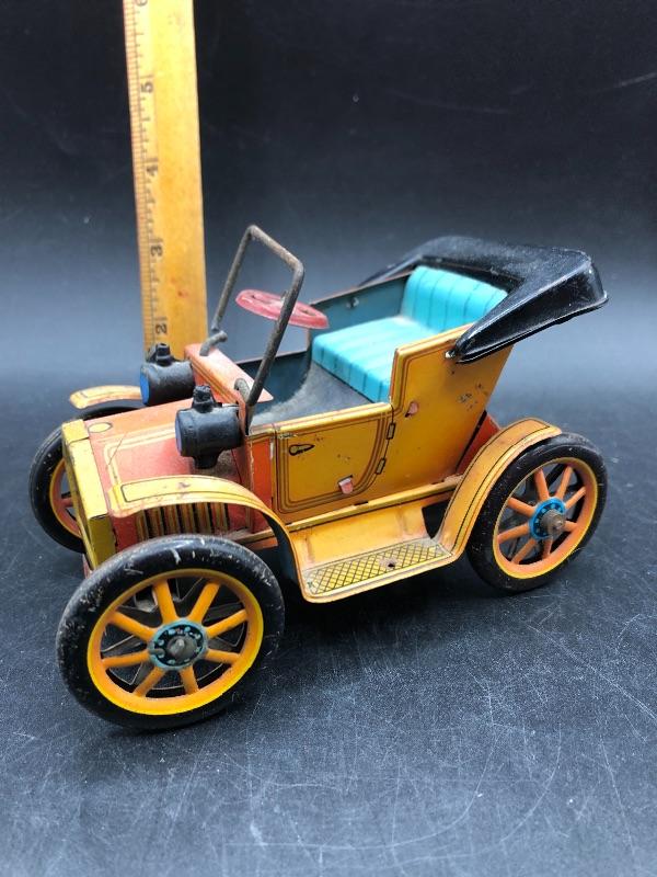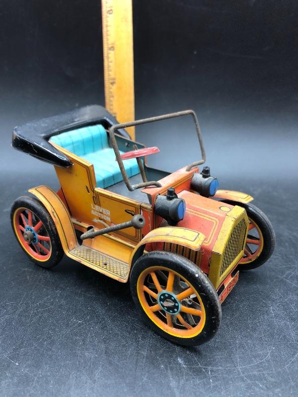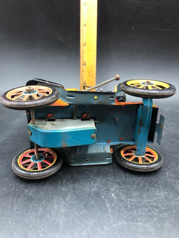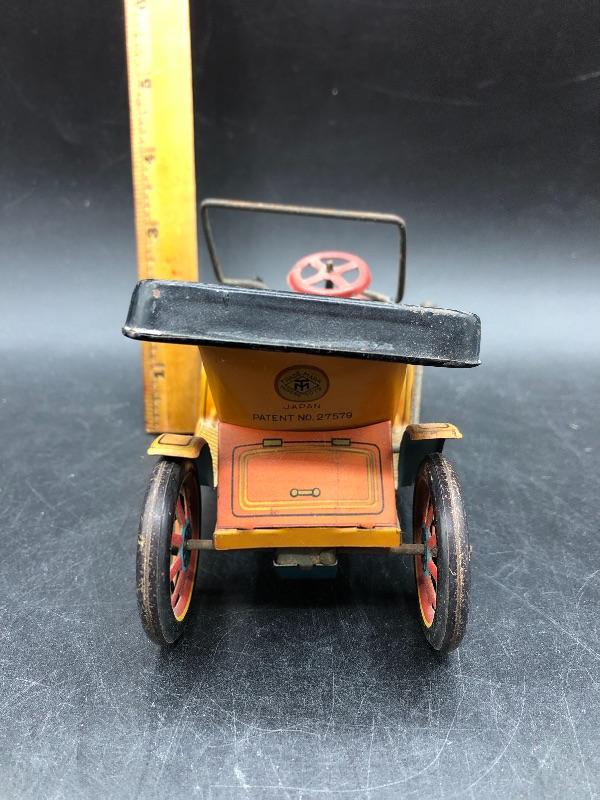 Vintage Trade Mark Modern Toys buggy car tin toy. Made in Japan. Lever action. Has signs of age, but displays nicely.