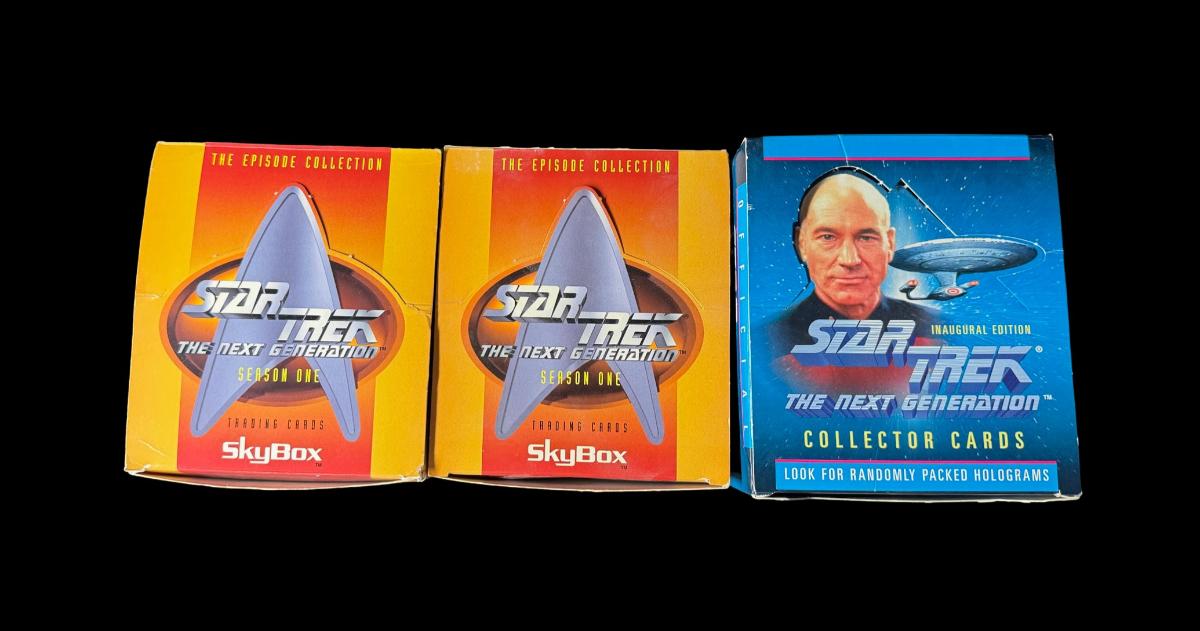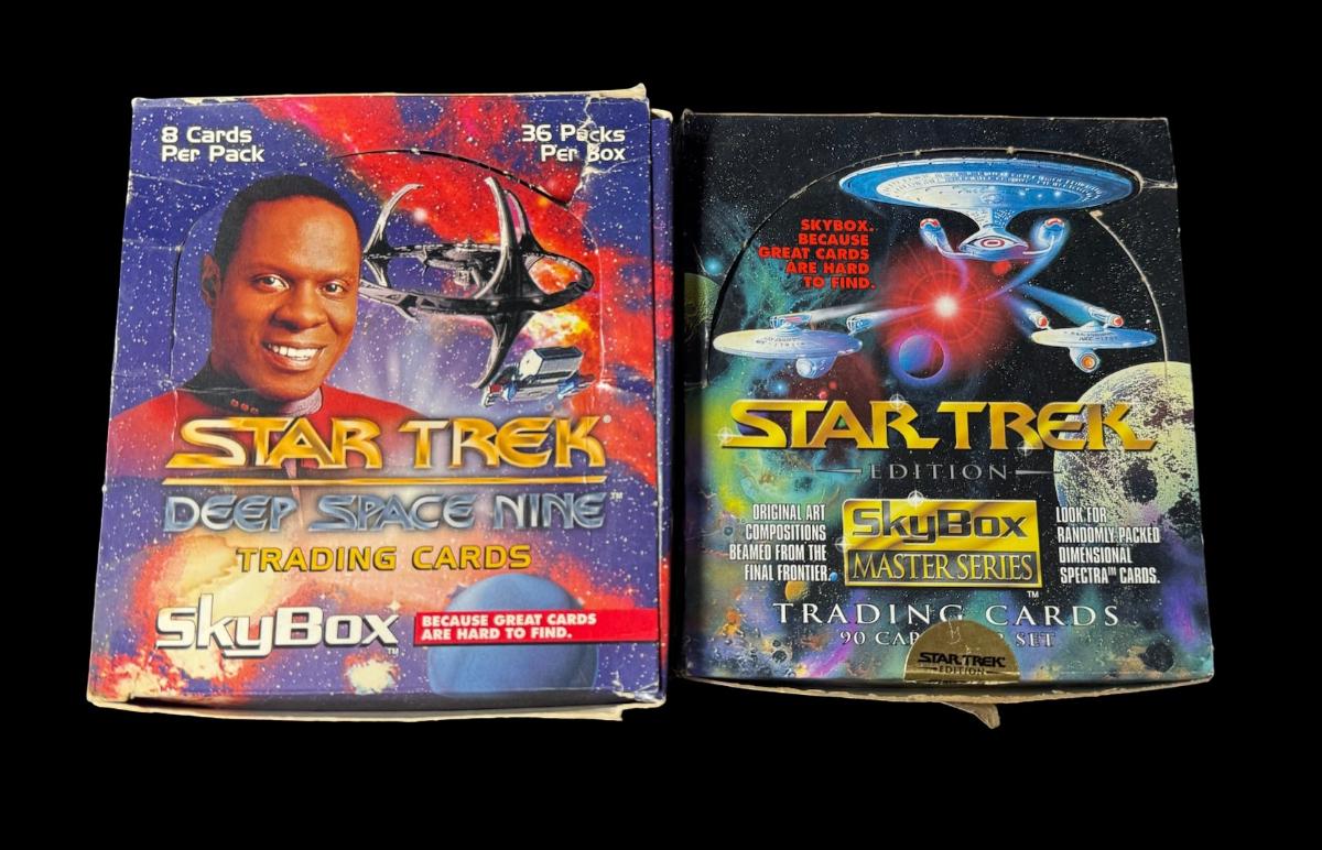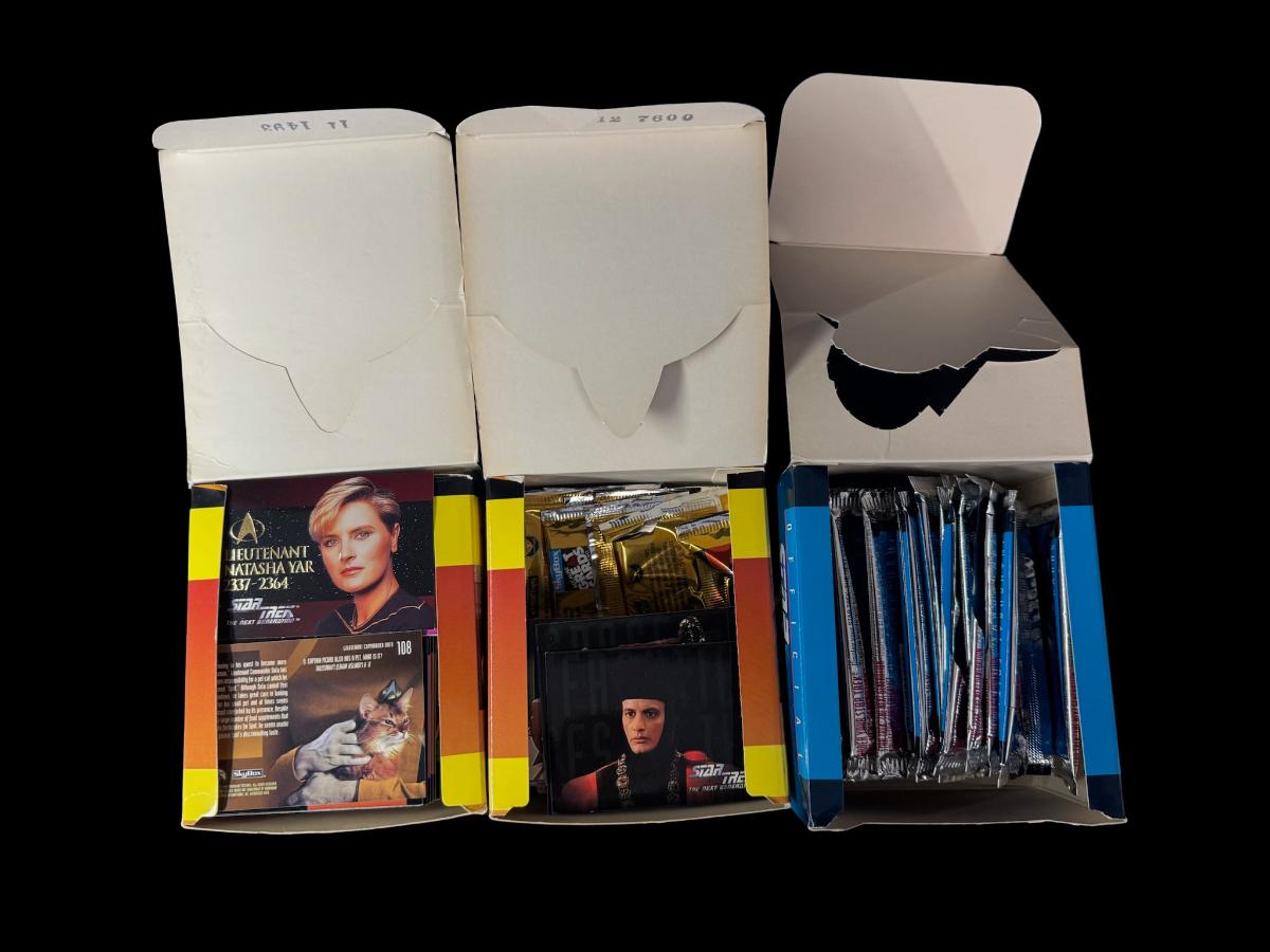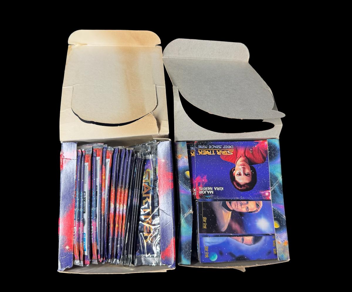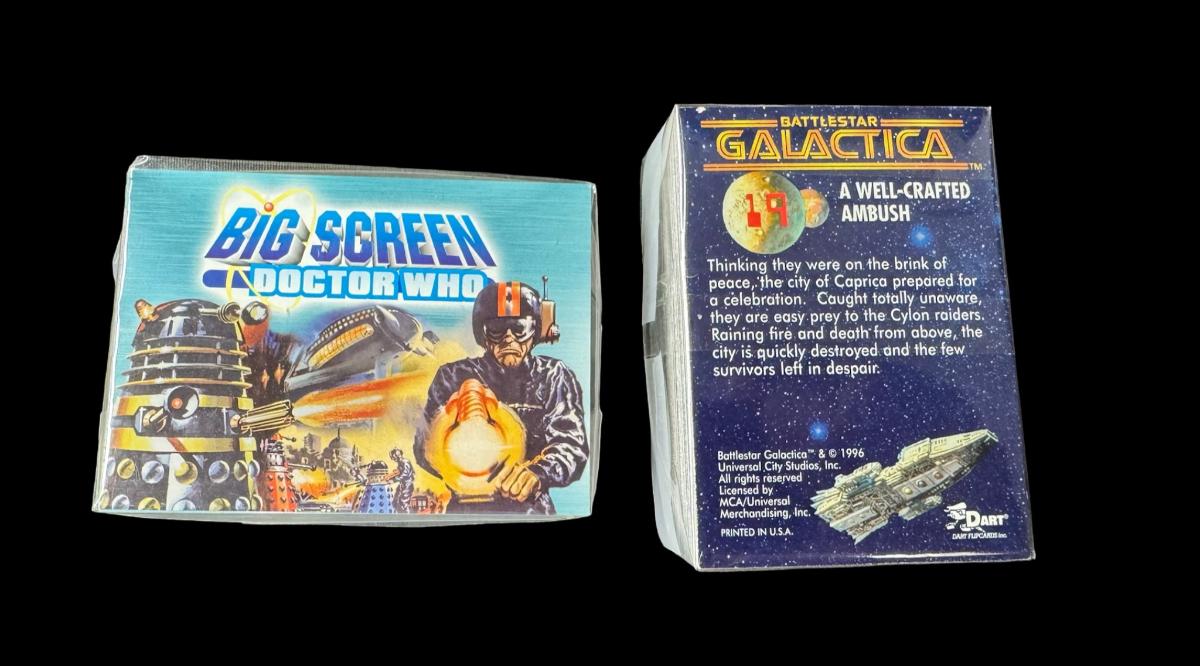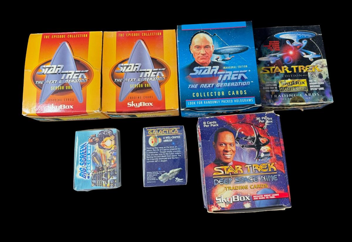 Includes Dr. Who Big Screen sealed pack; Battlestar Galactica sealed pack; Deep Space Nine empty foil packs; Deep Space Nine loose cards; and three Next Generation loose cards and empty foil packs. Total of seven pieces.