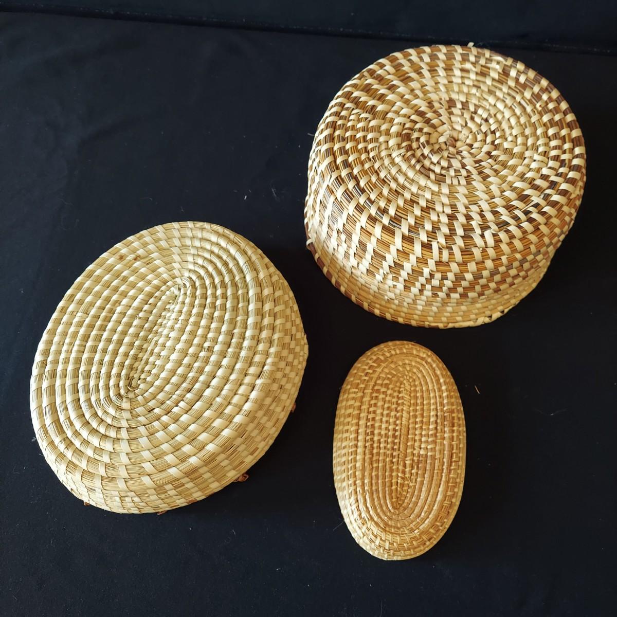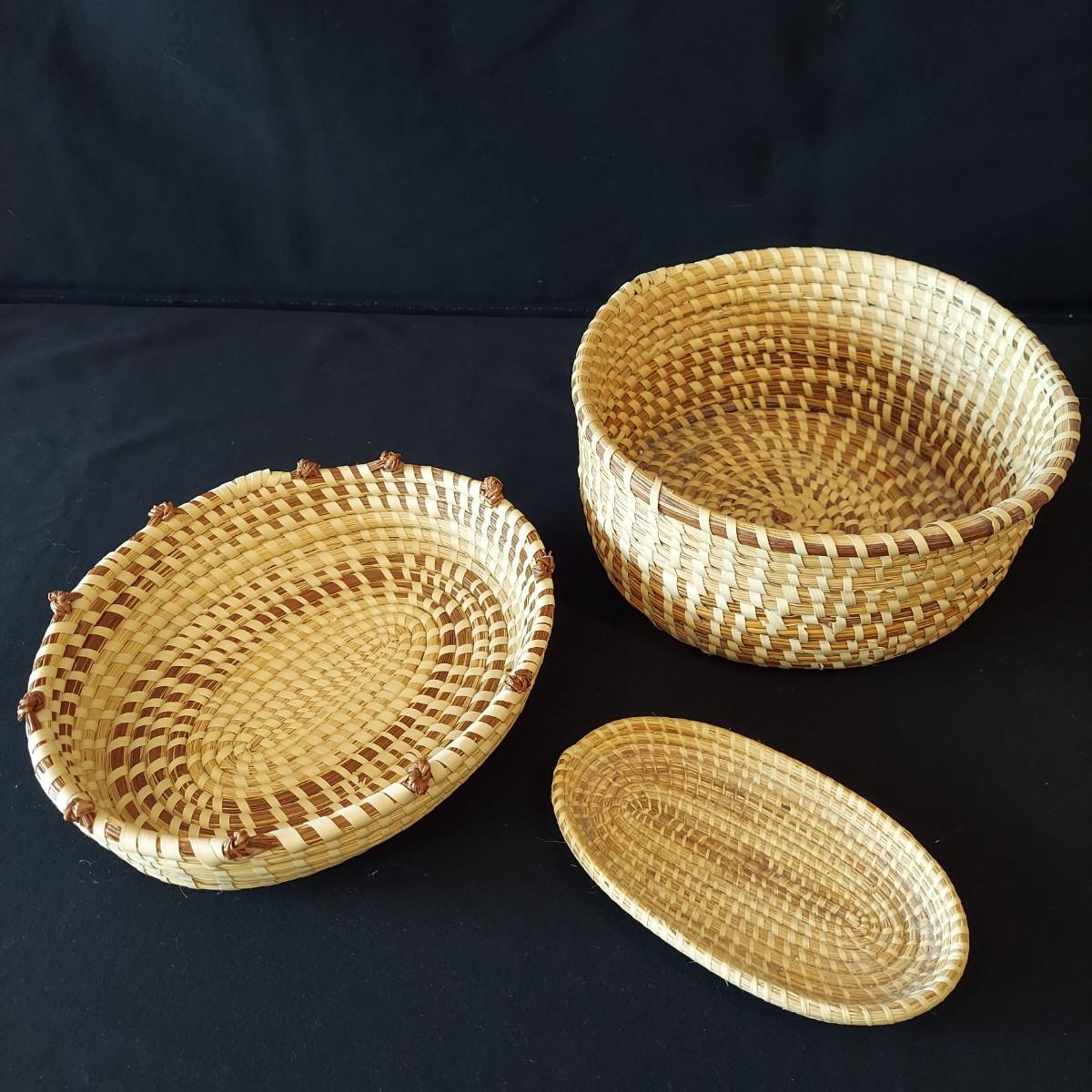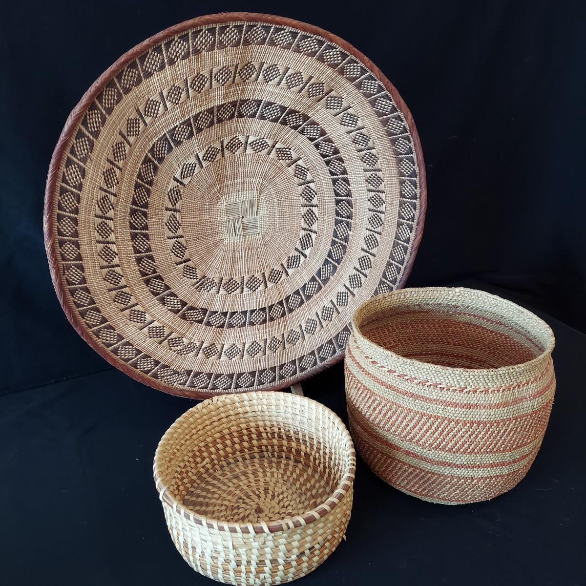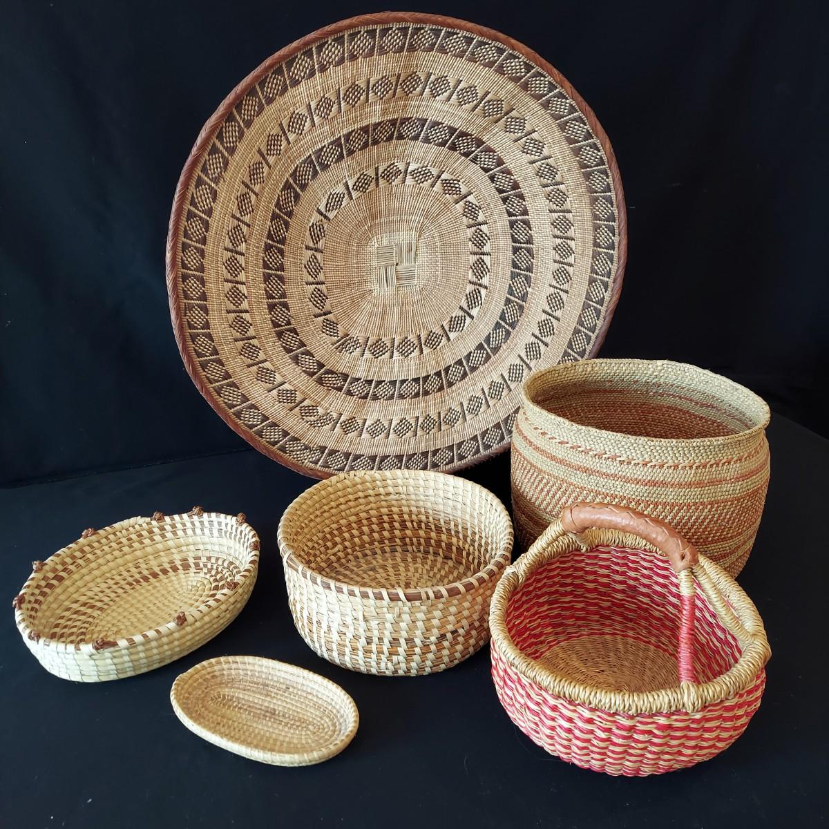 Six handmade baskets. Three appear to be African based on their tags but their material is unknown. Three appear to be sweet grass. The large basket is tacked onto a display easel. The flat basket measures 21" across. Shipping available