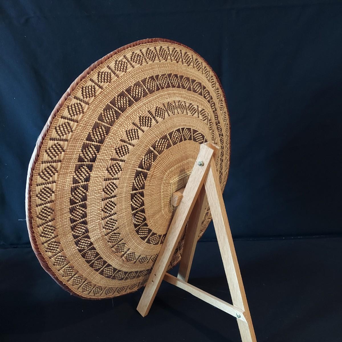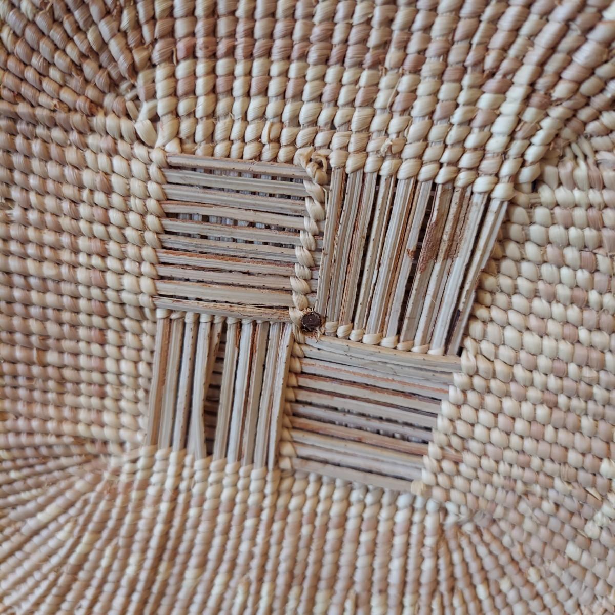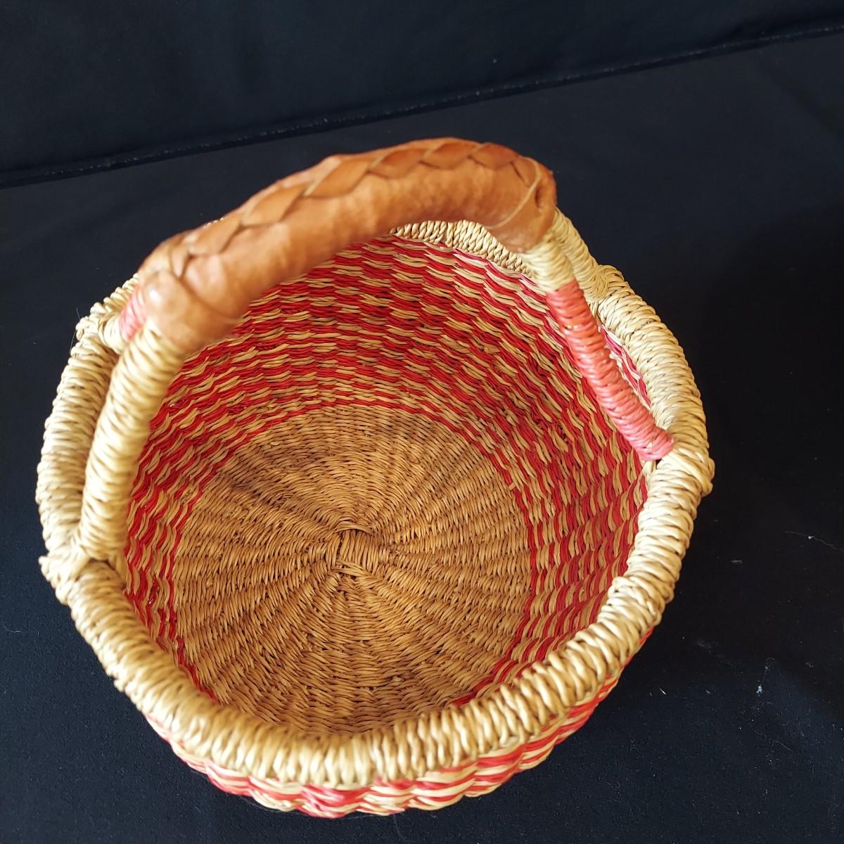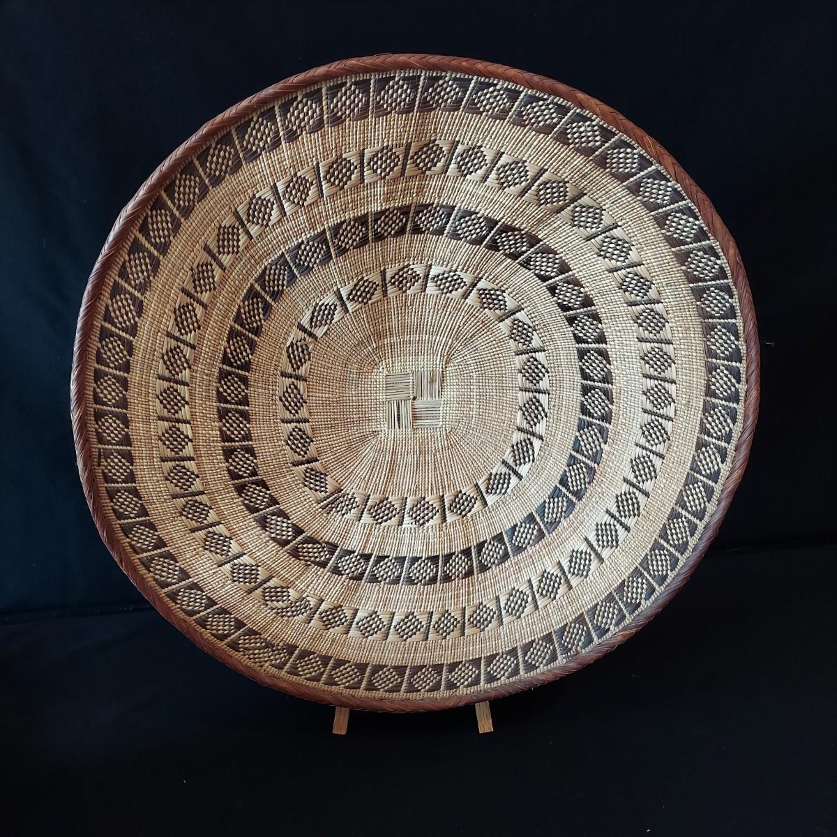 Six handmade baskets. Three appear to be African based on their tags but their material is unknown. Three appear to be sweet grass. The large basket is tacked onto a display easel. The flat basket measures 21" across. Shipping available