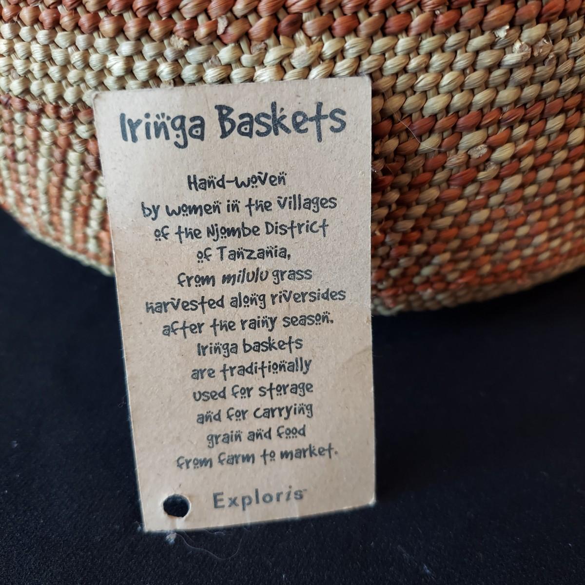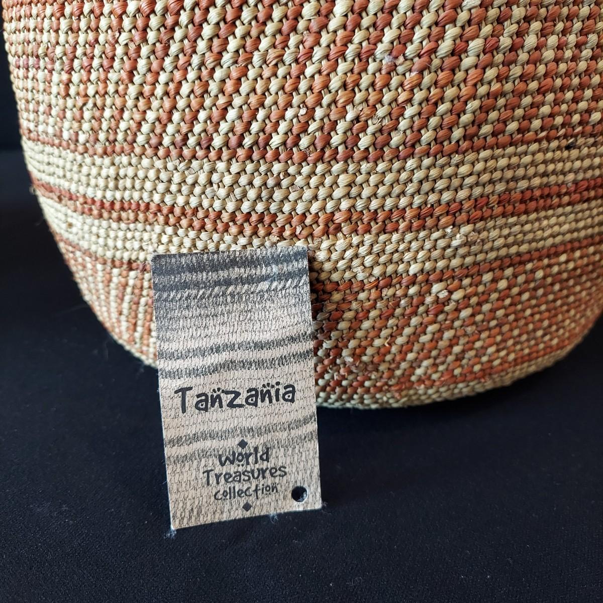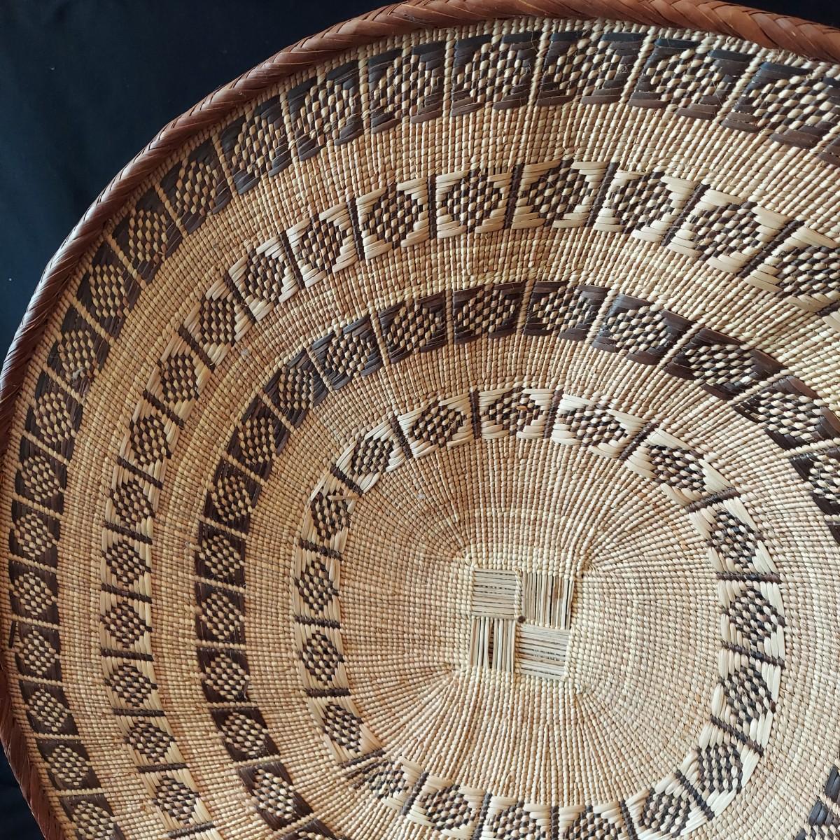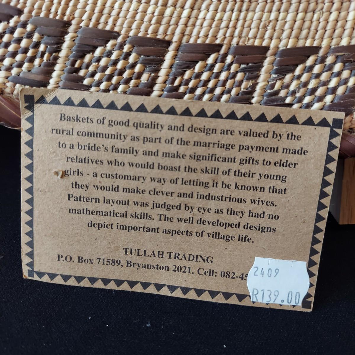 Six handmade baskets. Three appear to be African based on their tags but their material is unknown. Three appear to be sweet grass. The large basket is tacked onto a display easel. The flat basket measures 21" across. Shipping available