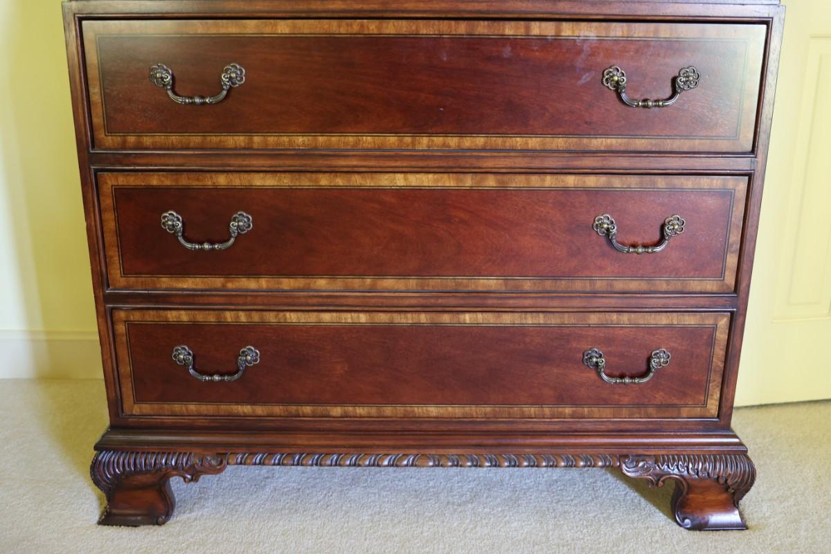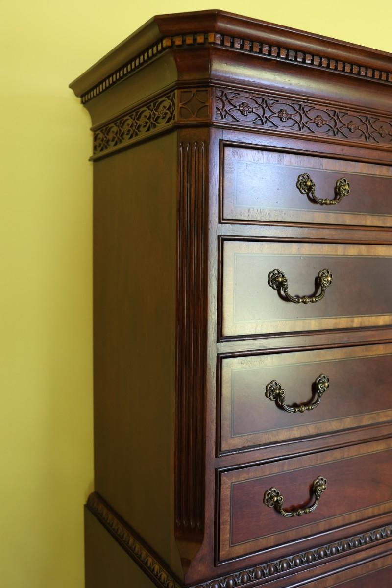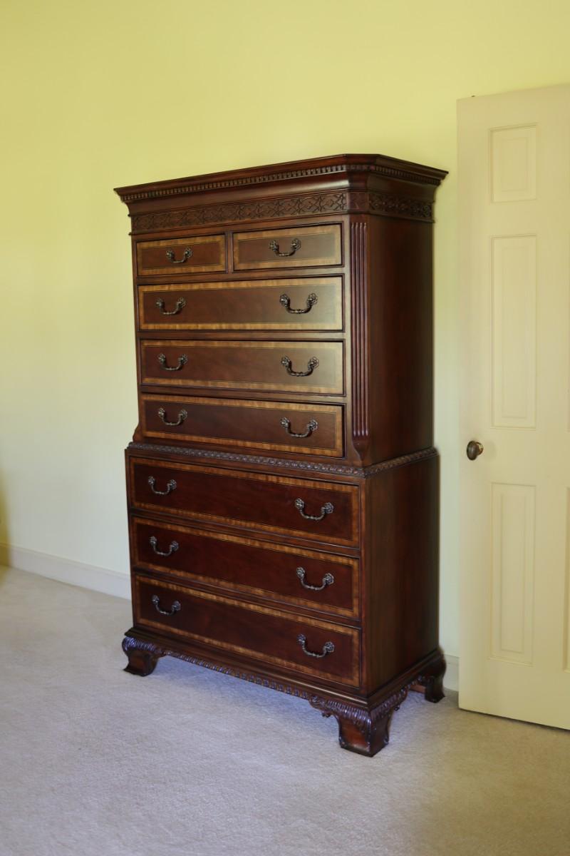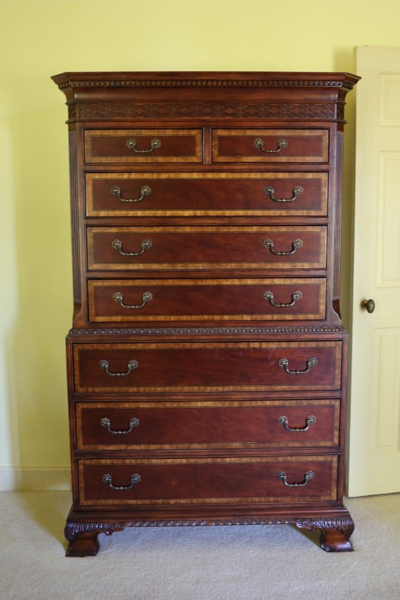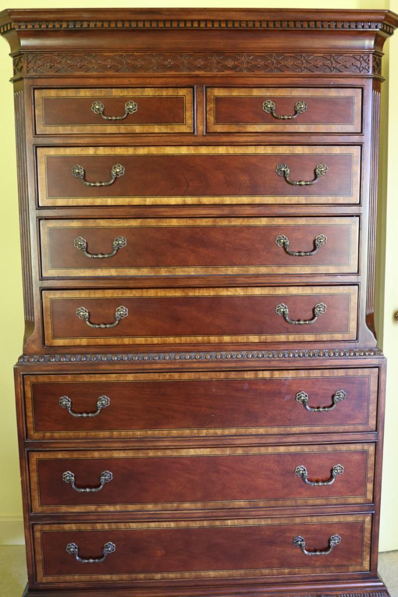 A traditional Georgian style chest on chest or highboy is mahogany with inlaid ebony banding by Universal Furniture. Great condition.