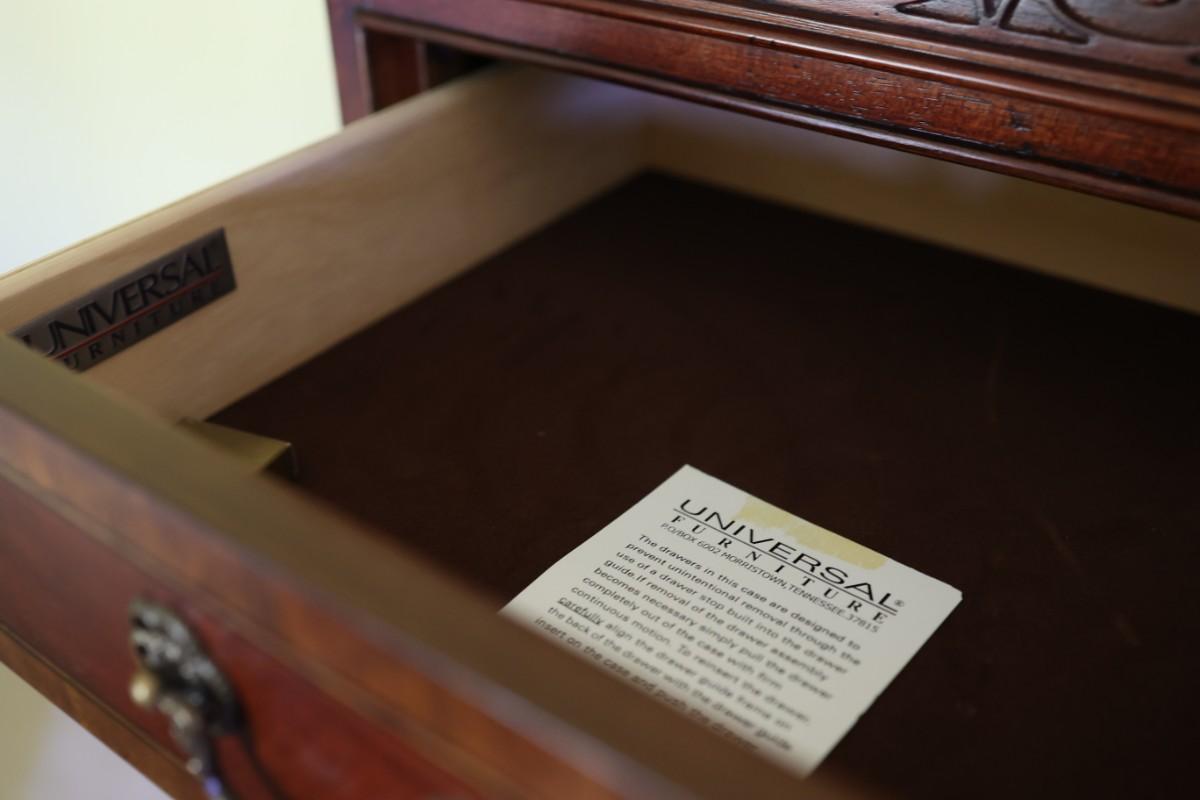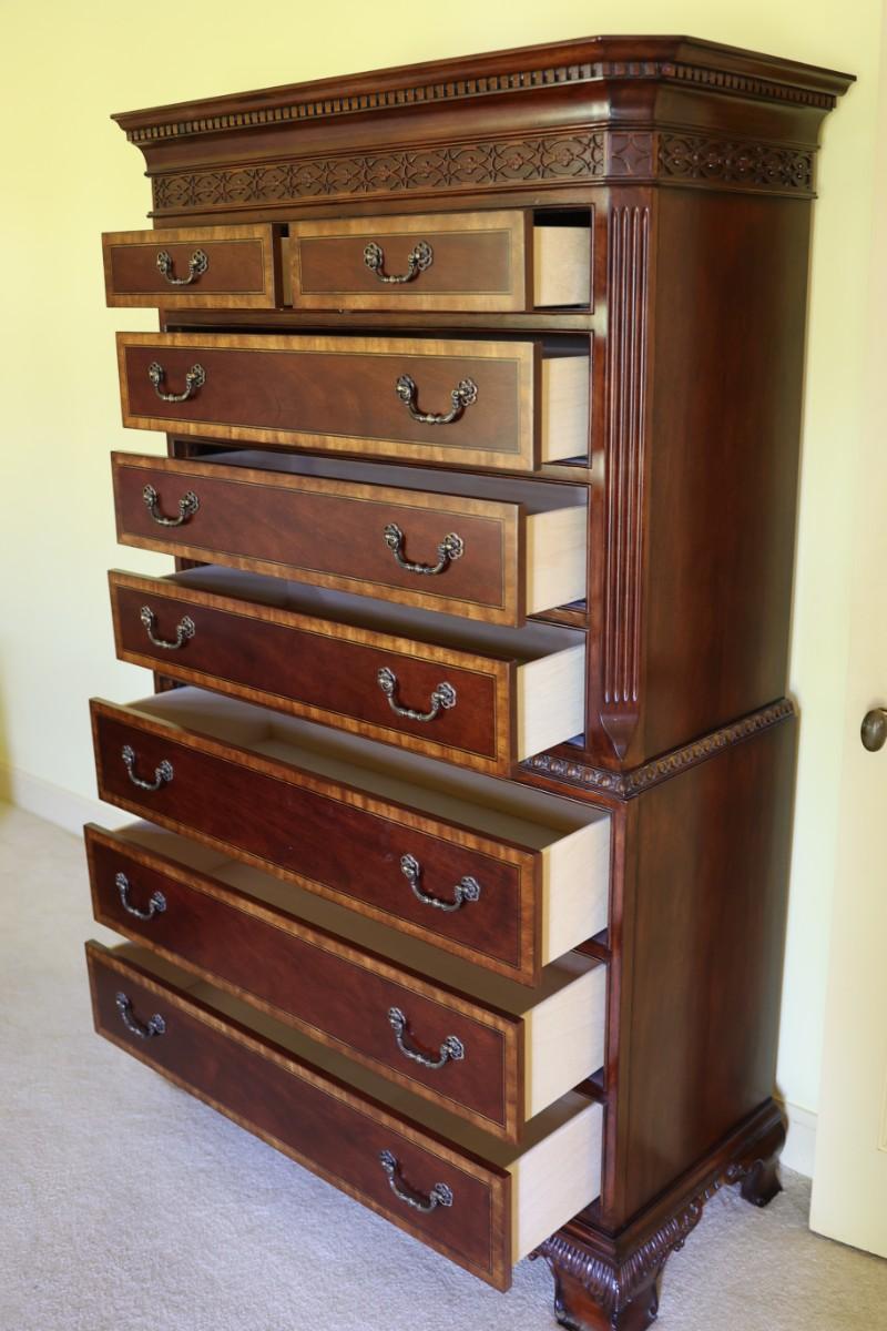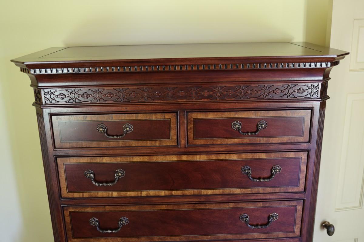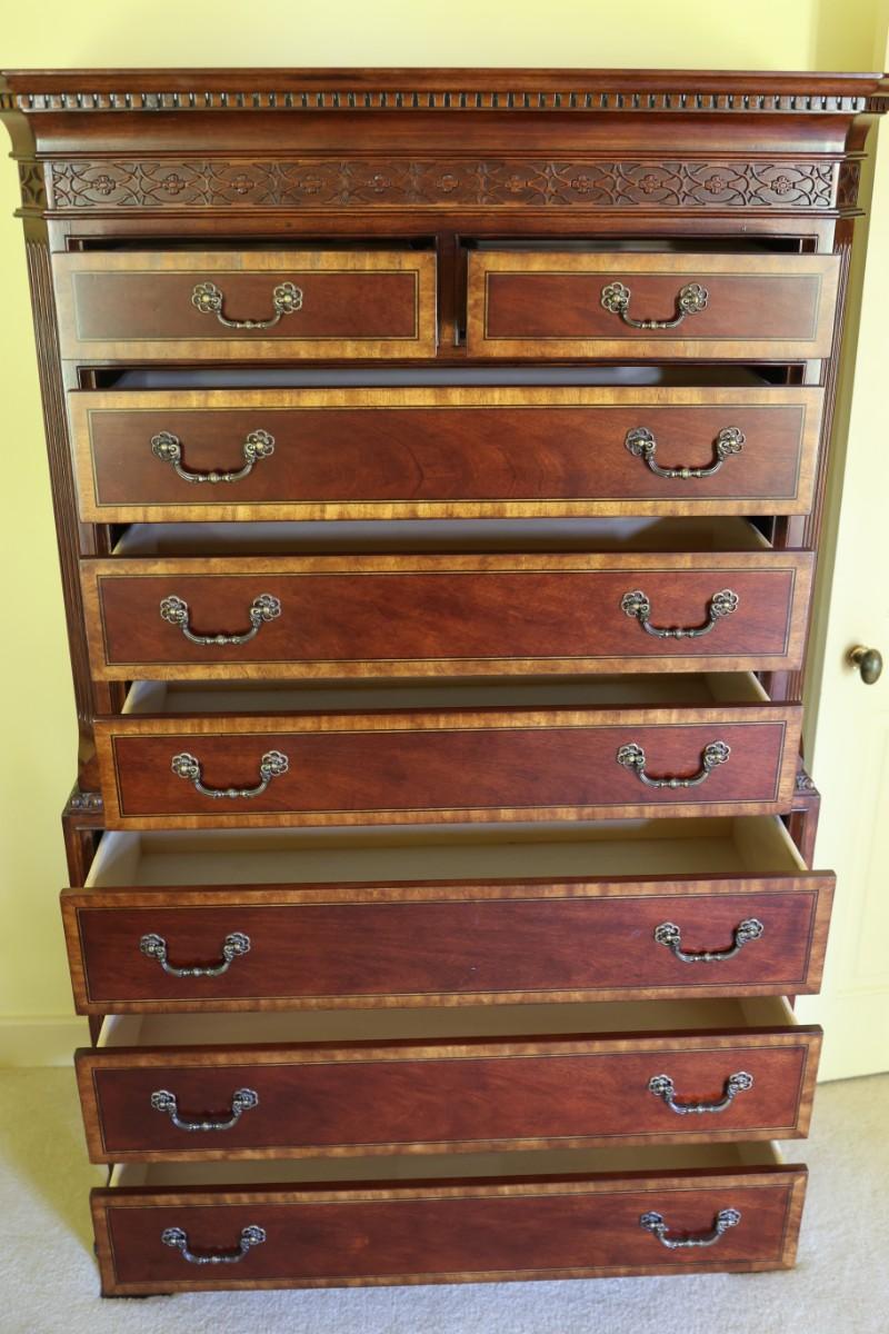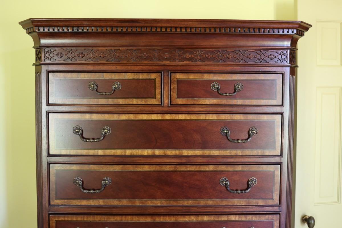 A traditional Georgian style chest on chest or highboy is mahogany with inlaid ebony banding by Universal Furniture. Great condition.