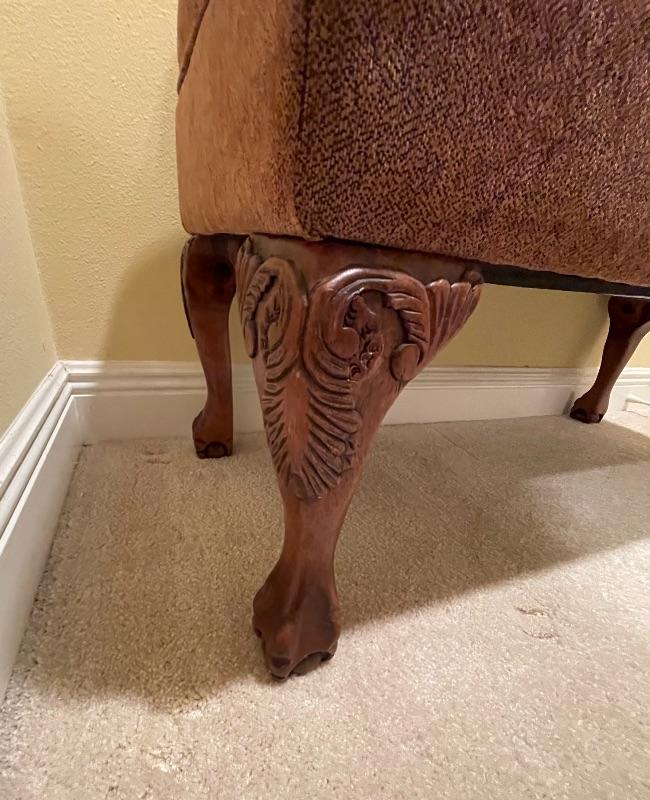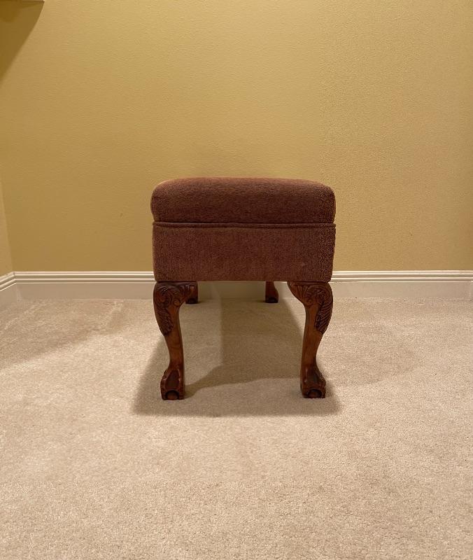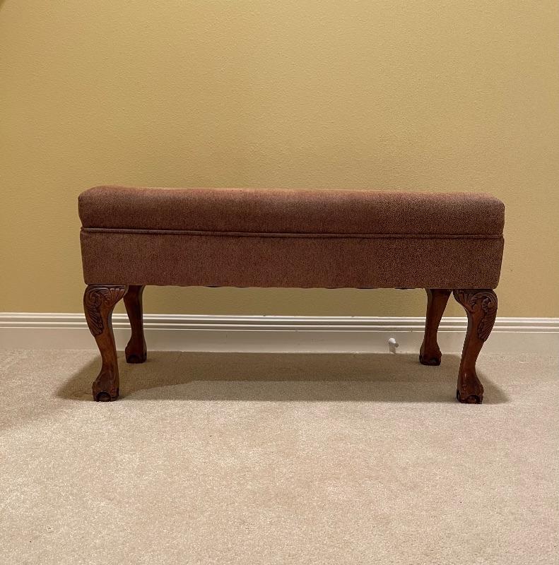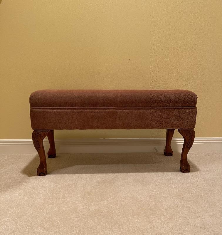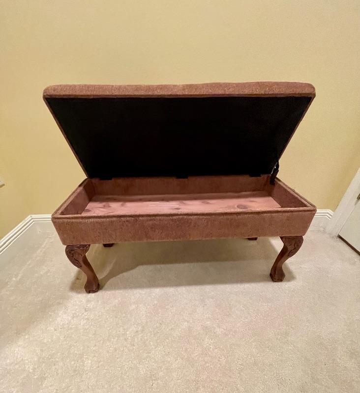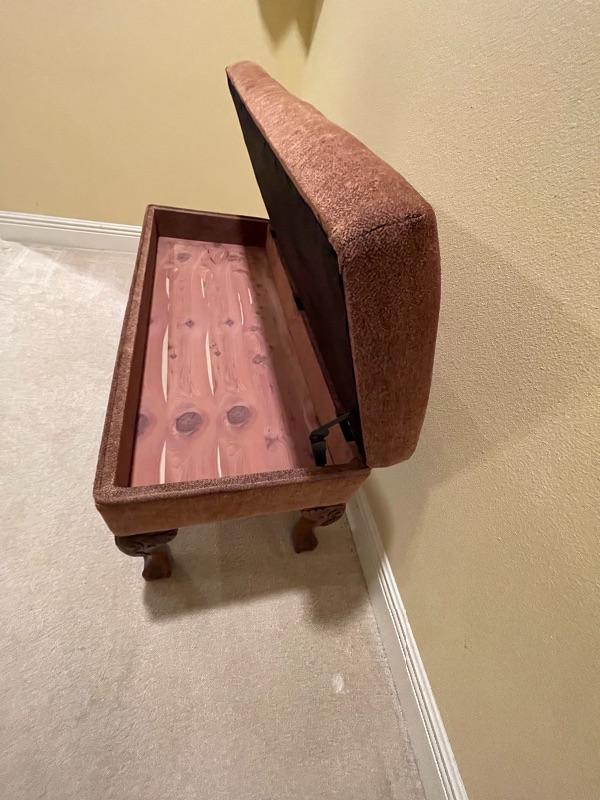 Perfect for end of bed! Beautiful twill fabric top in rust tones. Cedar Lined. Decorative legs.