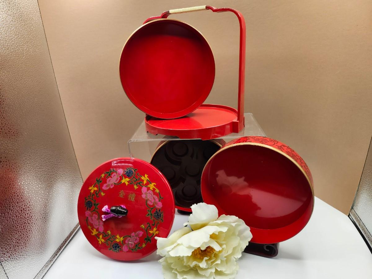 Stackable, tiered lunch food carrier, made with red lacquer with black floral pattern.