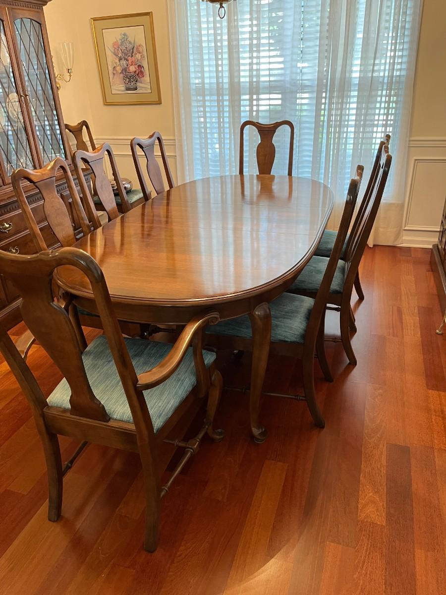 Traditional Cherry wood Dining Room Set with Leaf and 10 Chairs By Baumritter Furniture Co 81"x44" with leaf installed leaf is 18"