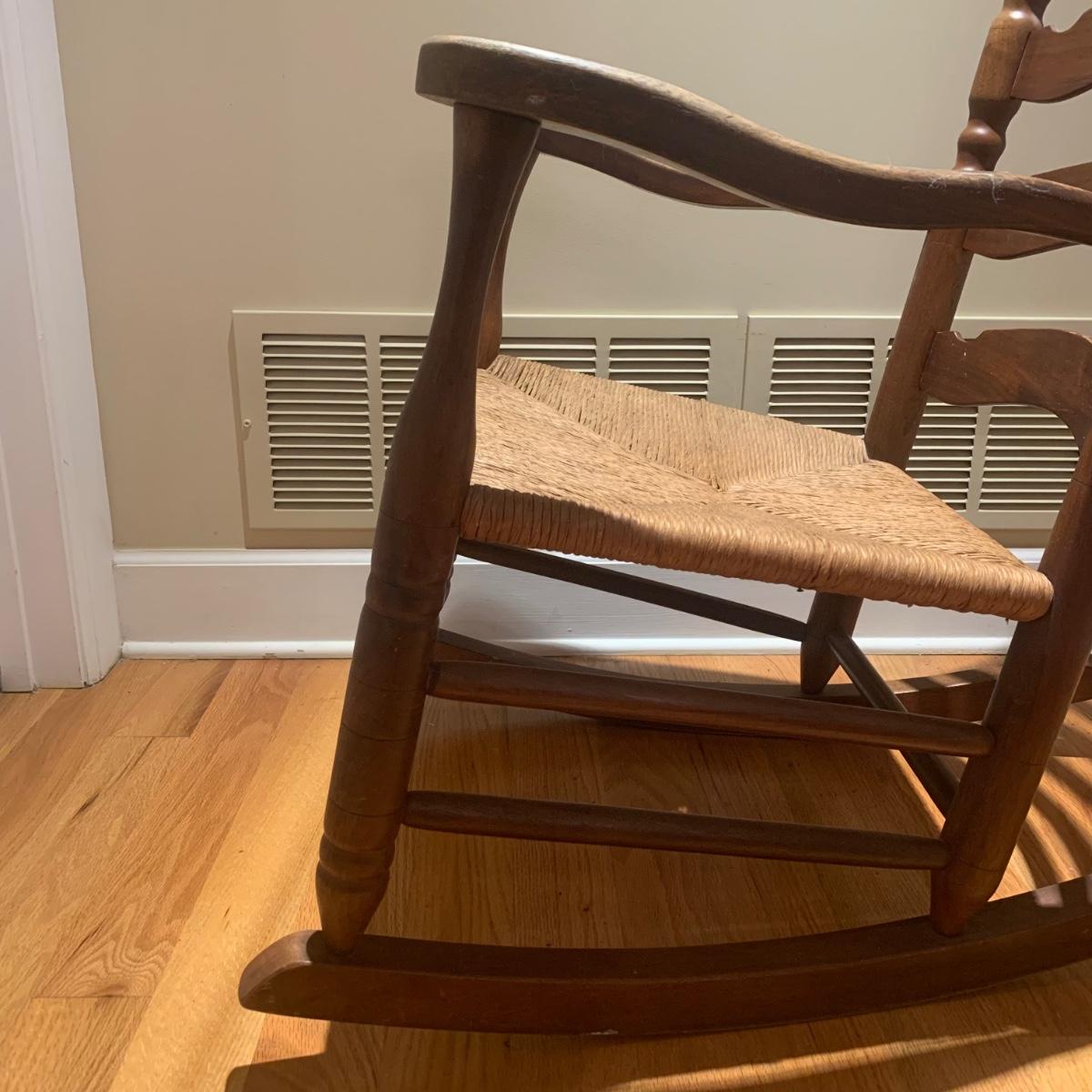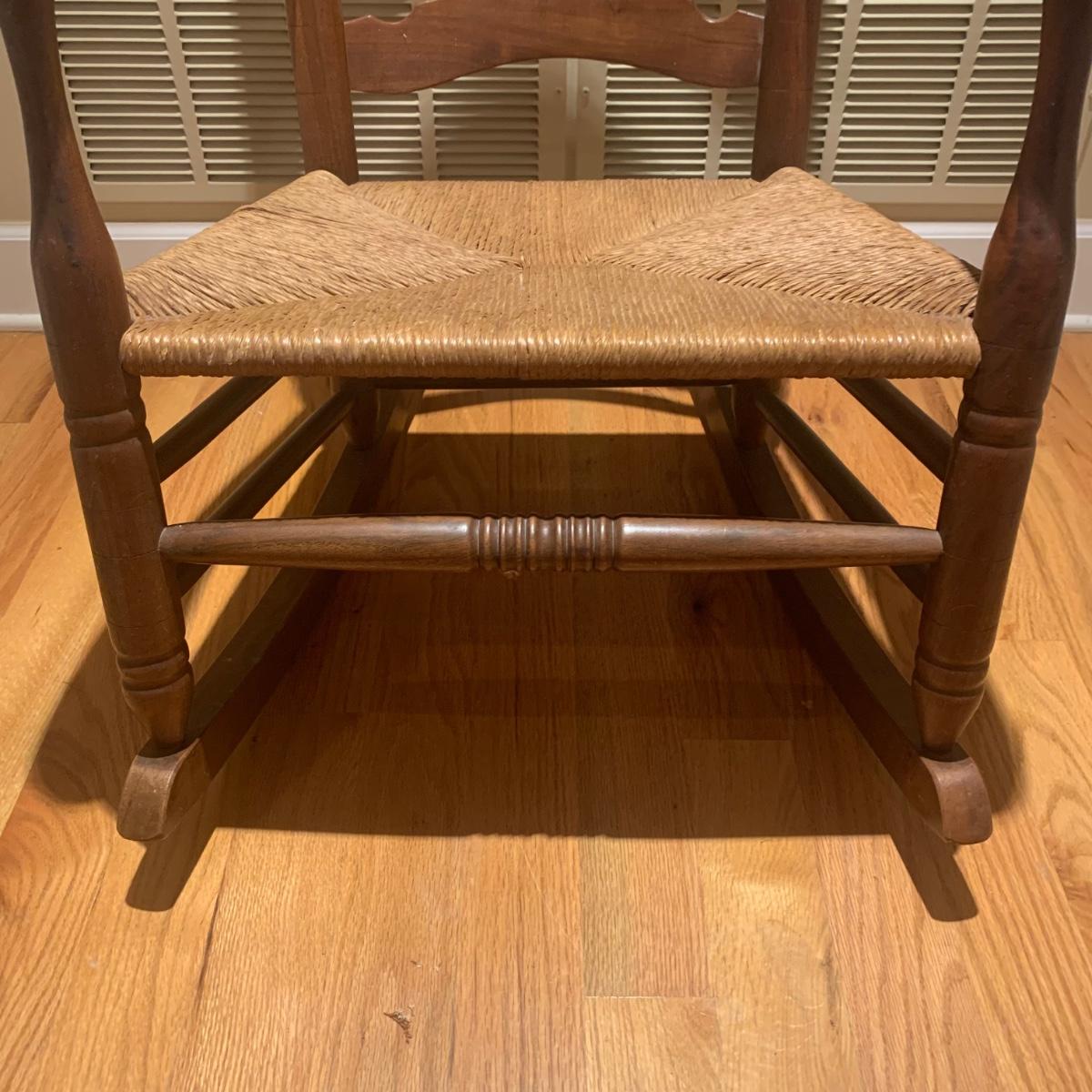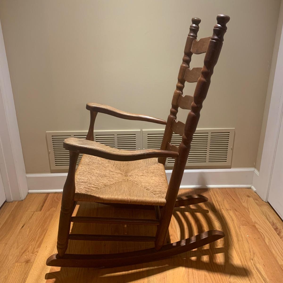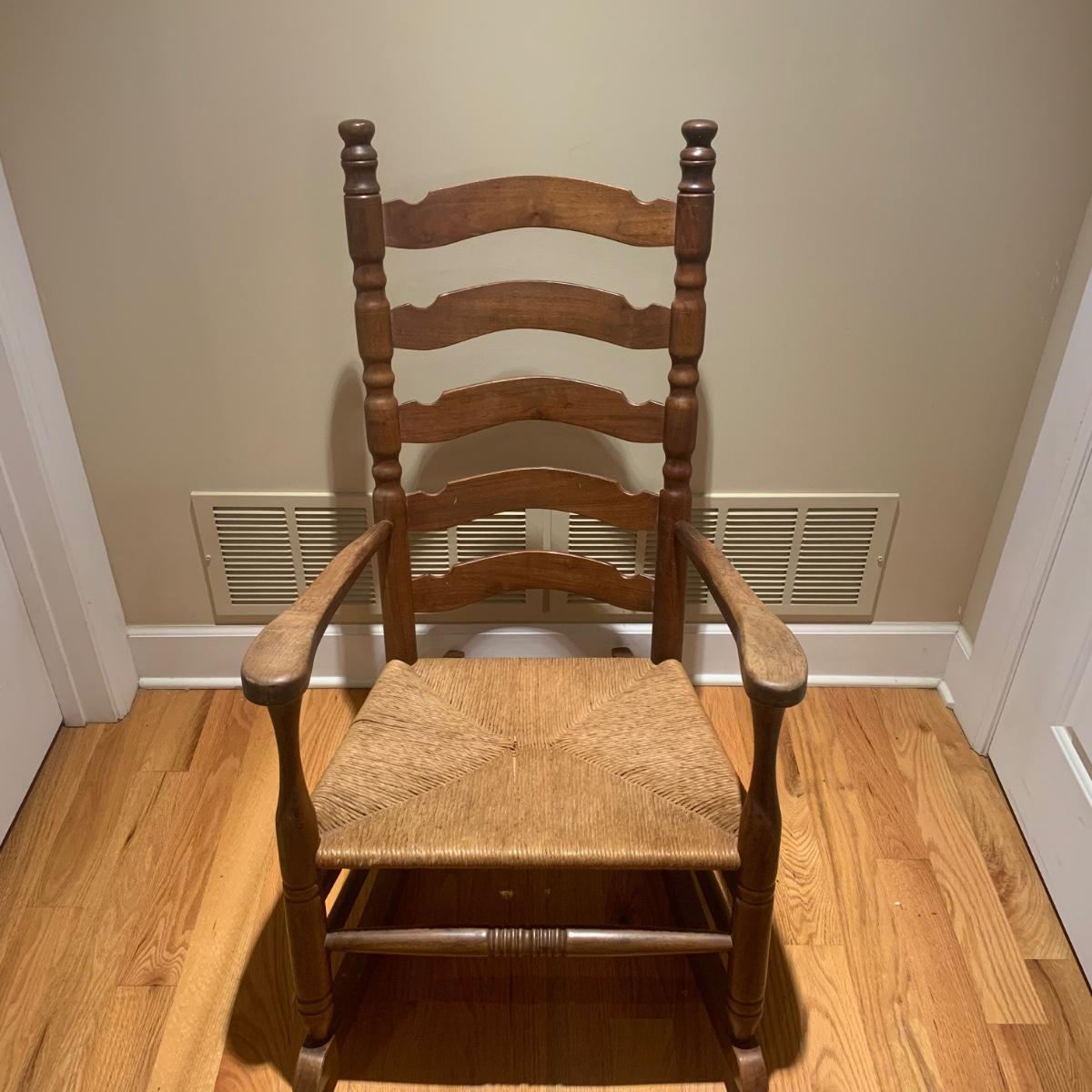 Traditional five slat wooden rocking chair with rush woven seat. Lovely smooth rocking chair. It does have multiple blemishes and smells slightly of urine. With a good cleaning this chair could likely last for many years to come. Chair measures, 23”L x 30.5”W x 39.5”H and has a chair height of 14”H.
