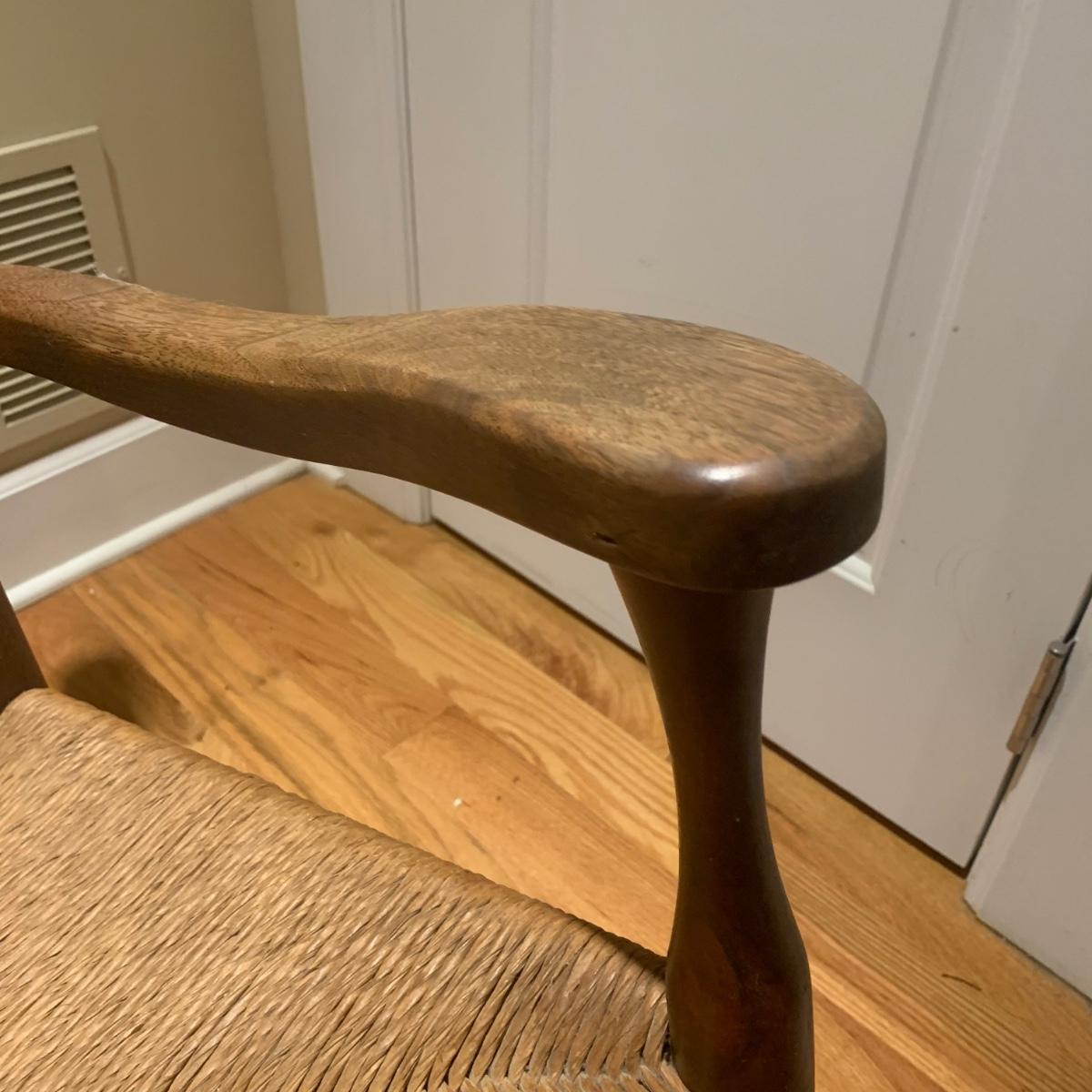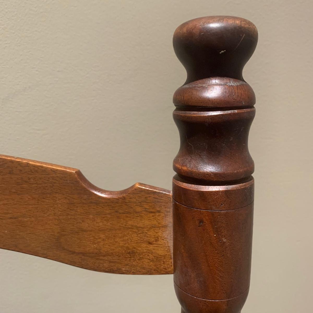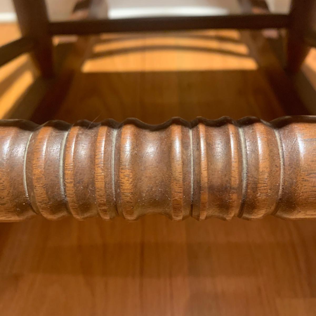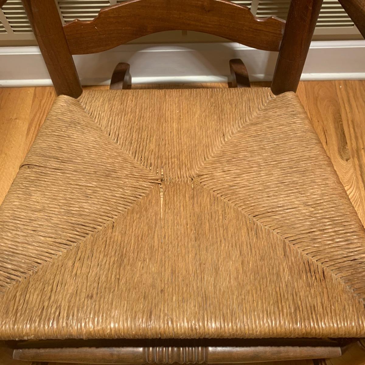 Traditional five slat wooden rocking chair with rush woven seat. Lovely smooth rocking chair. It does have multiple blemishes and smells slightly of urine. With a good cleaning this chair could likely last for many years to come. Chair measures, 23”L x 30.5”W x 39.5”H and has a chair height of 14”H.