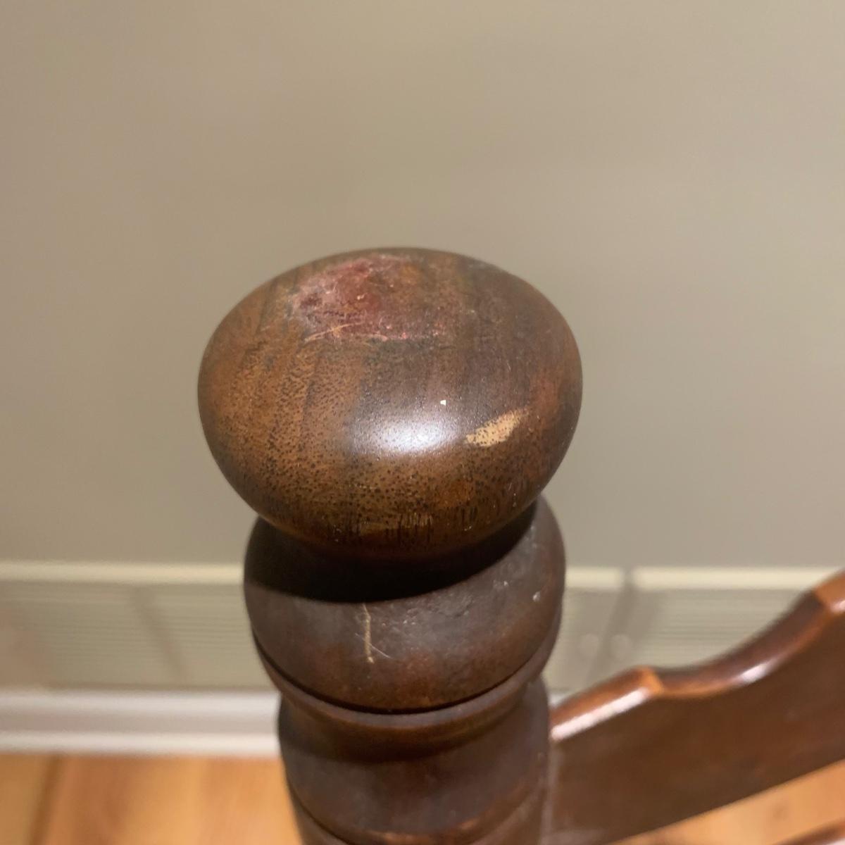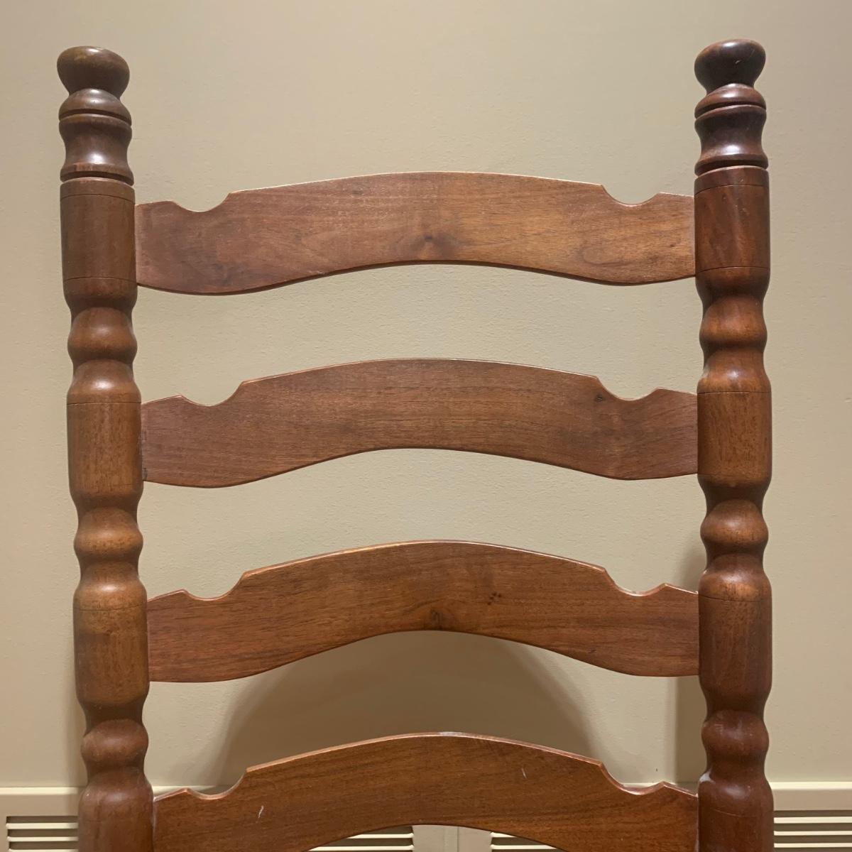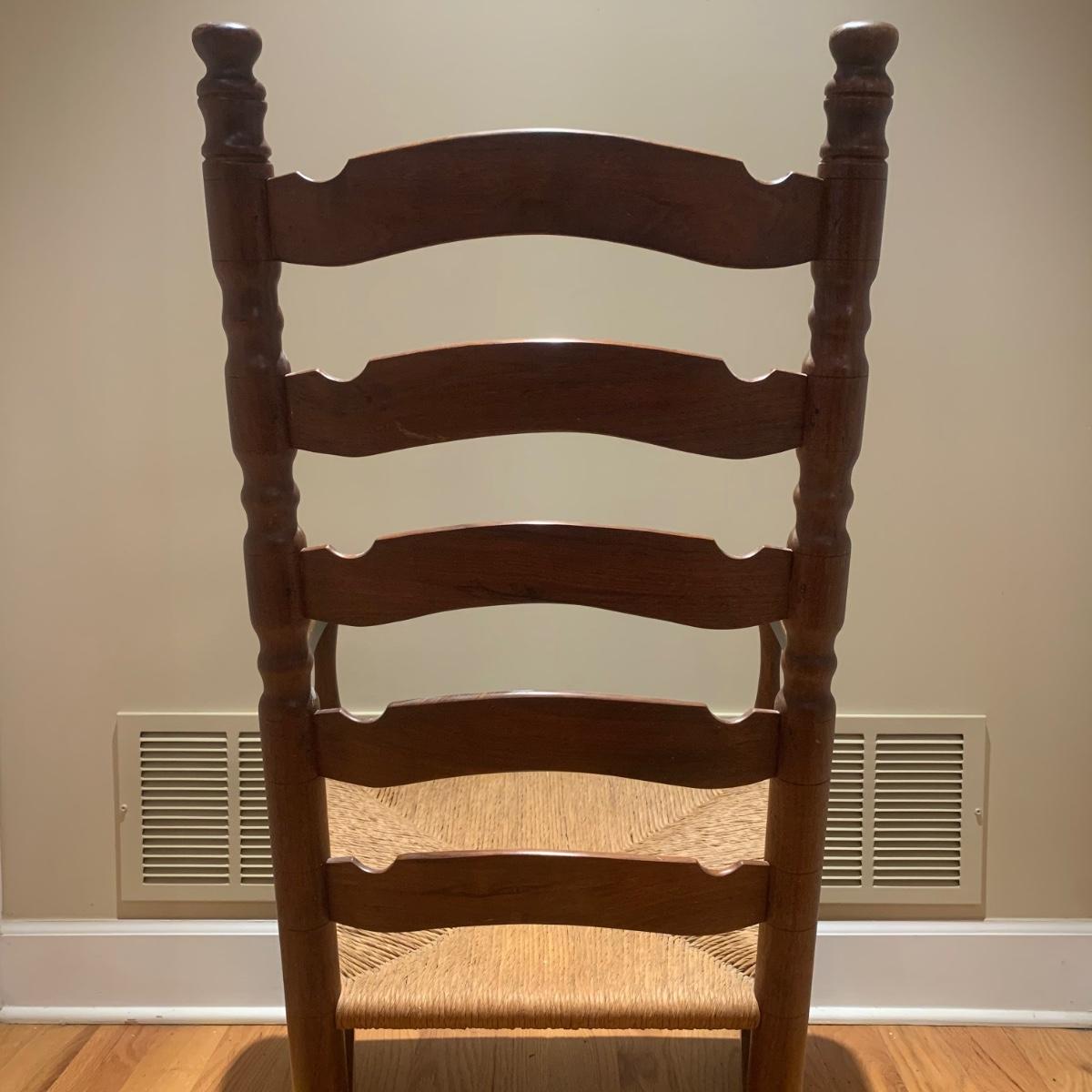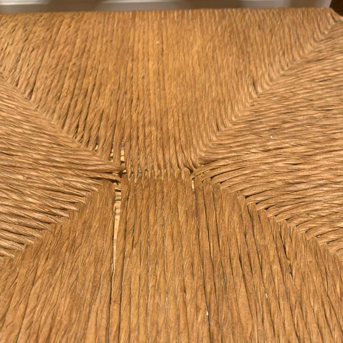 Traditional five slat wooden rocking chair with rush woven seat. Lovely smooth rocking chair. It does have multiple blemishes and smells slightly of urine. With a good cleaning this chair could likely last for many years to come. Chair measures, 23”L x 30.5”W x 39.5”H and has a chair height of 14”H.