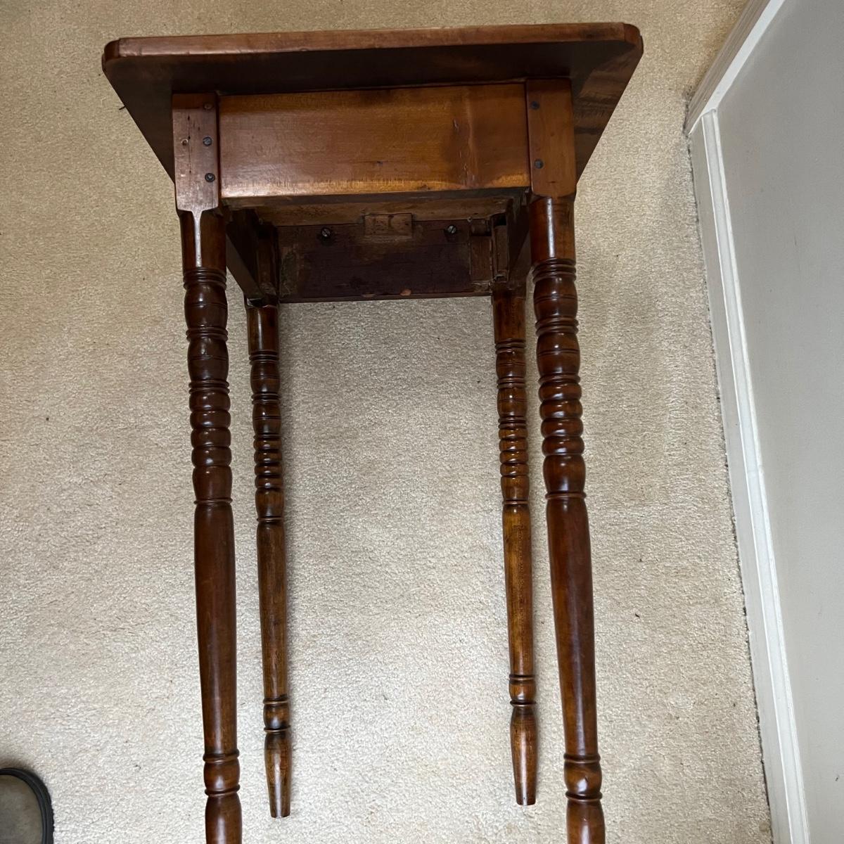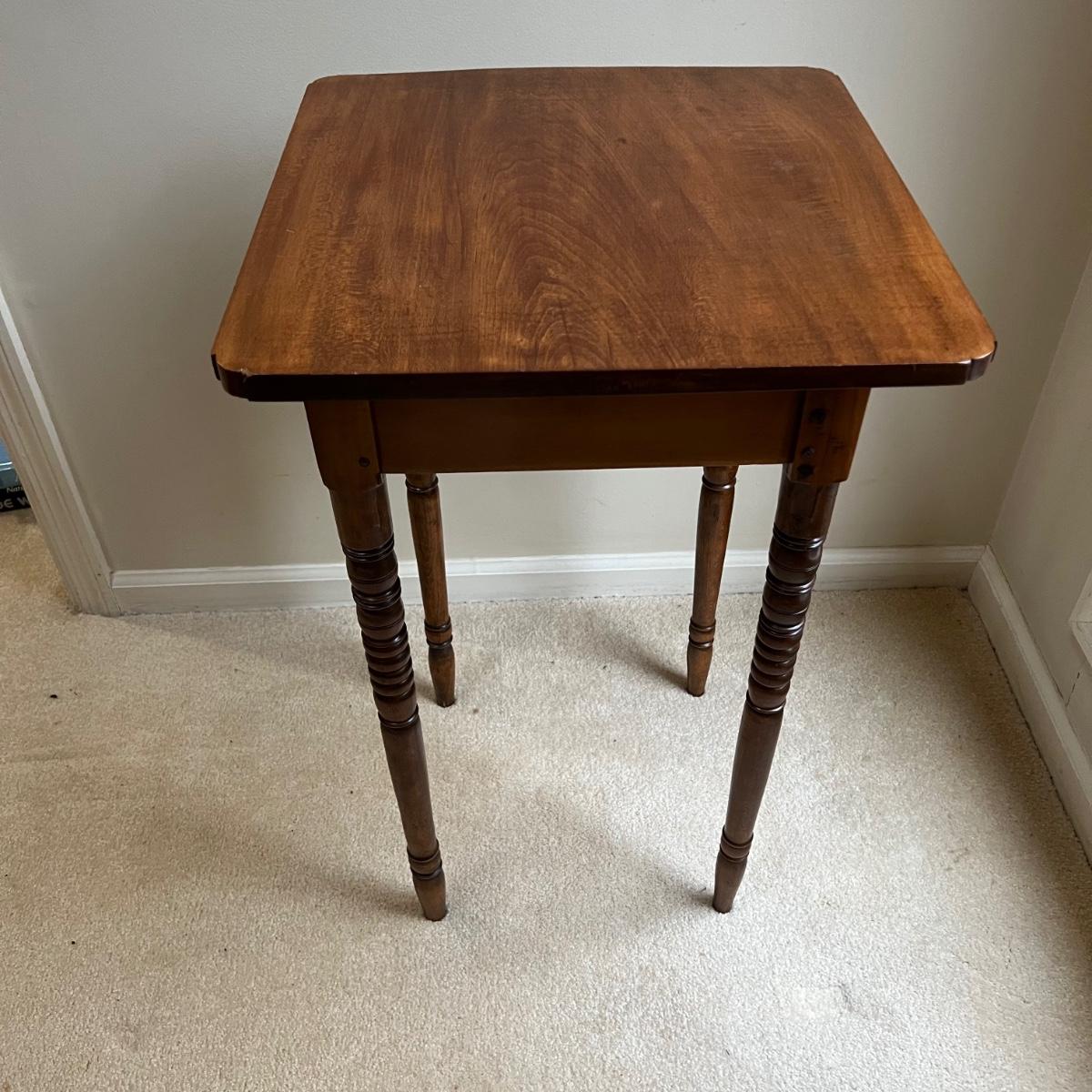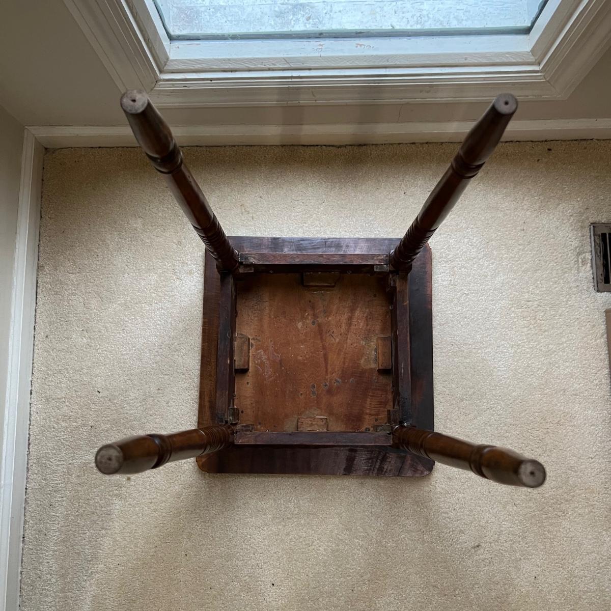 Graceful table 16.5” square, 26” tall with turned wood legs. Perfect anywhere. Stable, wood dowel-like joins on the corners give this piece a traditional, old-world feel. See images, local pick up only.